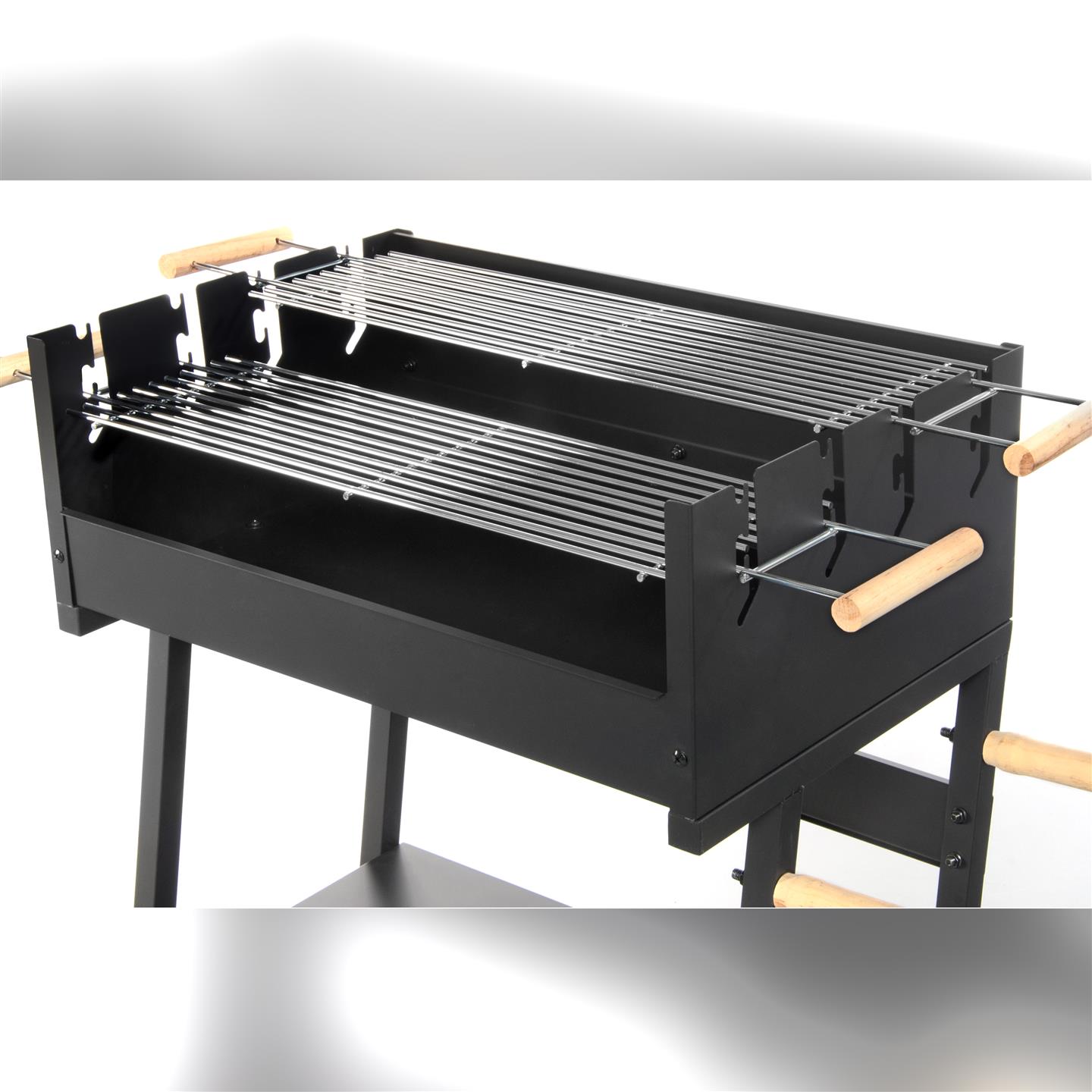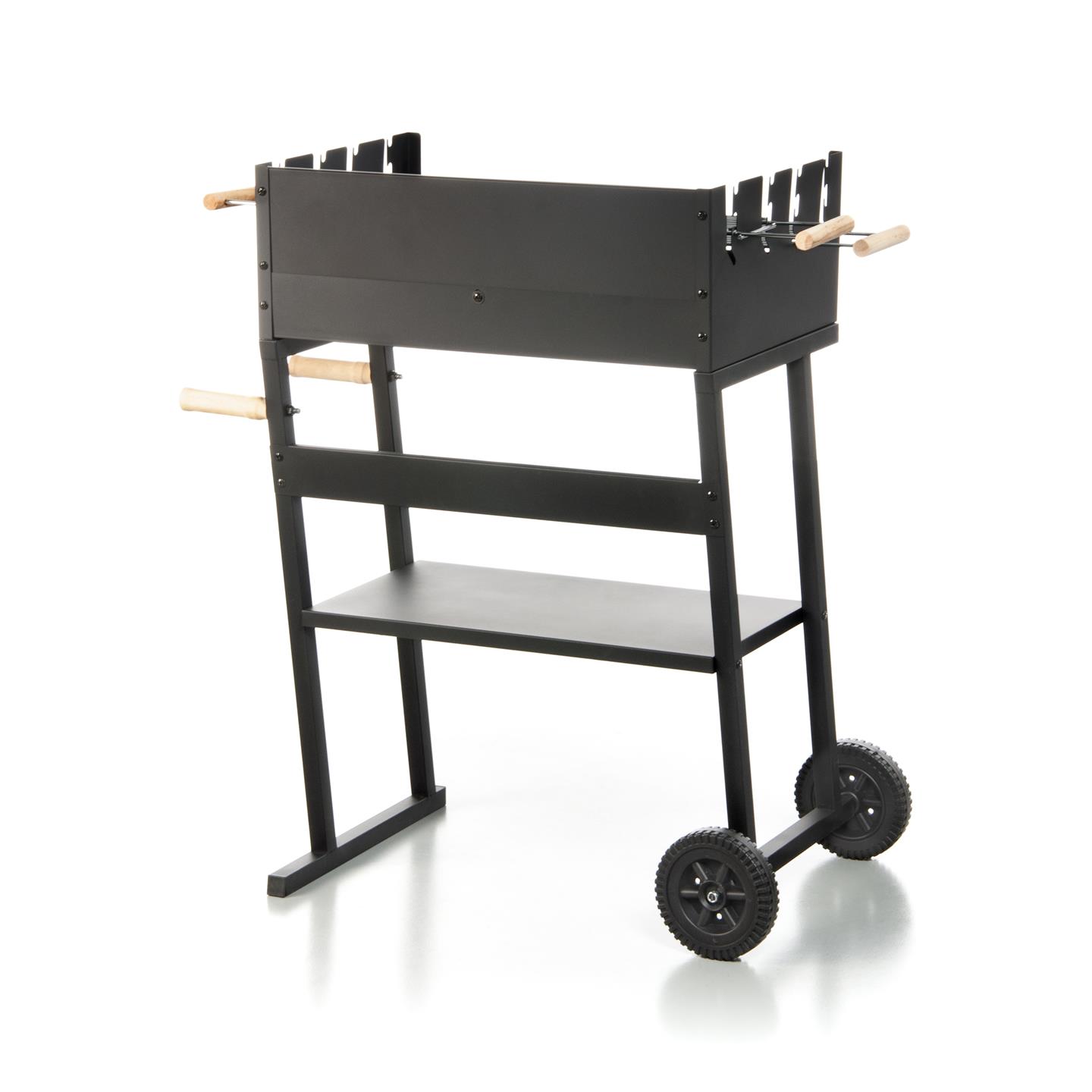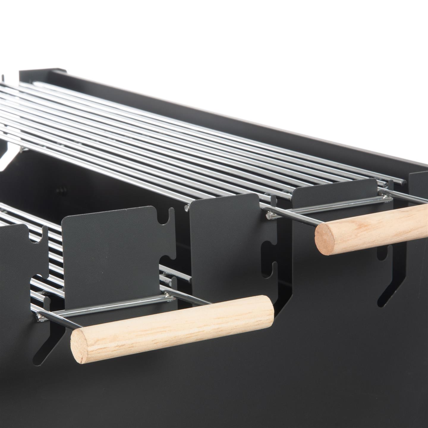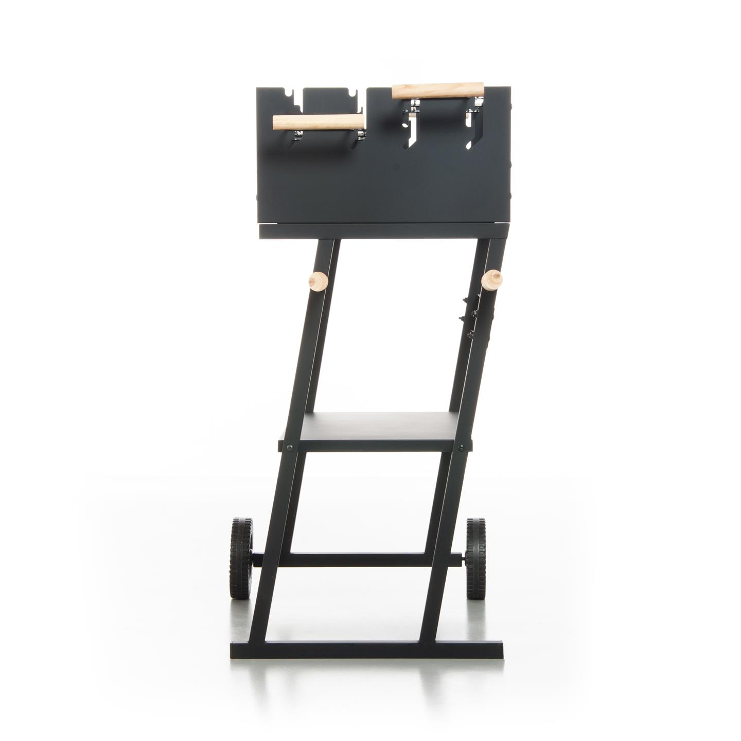 Holzkohlegrill mit Rädern, Windschutz, Ablagefläche und zwei Holzgriffen. Schwarz lackiertes Stahlgestell. Zwei Grillroste (58 x 16,5 cm, 3,8/2,8 mm dick) aus verchromtem Stahl mit zwei Holzgriffen. Gesamtmaße mit Griffen: 81,5 x 16,5 cm. Mehrstufige Kochfeldhöhe: 82/85/91 cm. Höhe vom Boden: 78 cm. Gesamtmaße: 83 x 49 x 90 cm (Höhe).