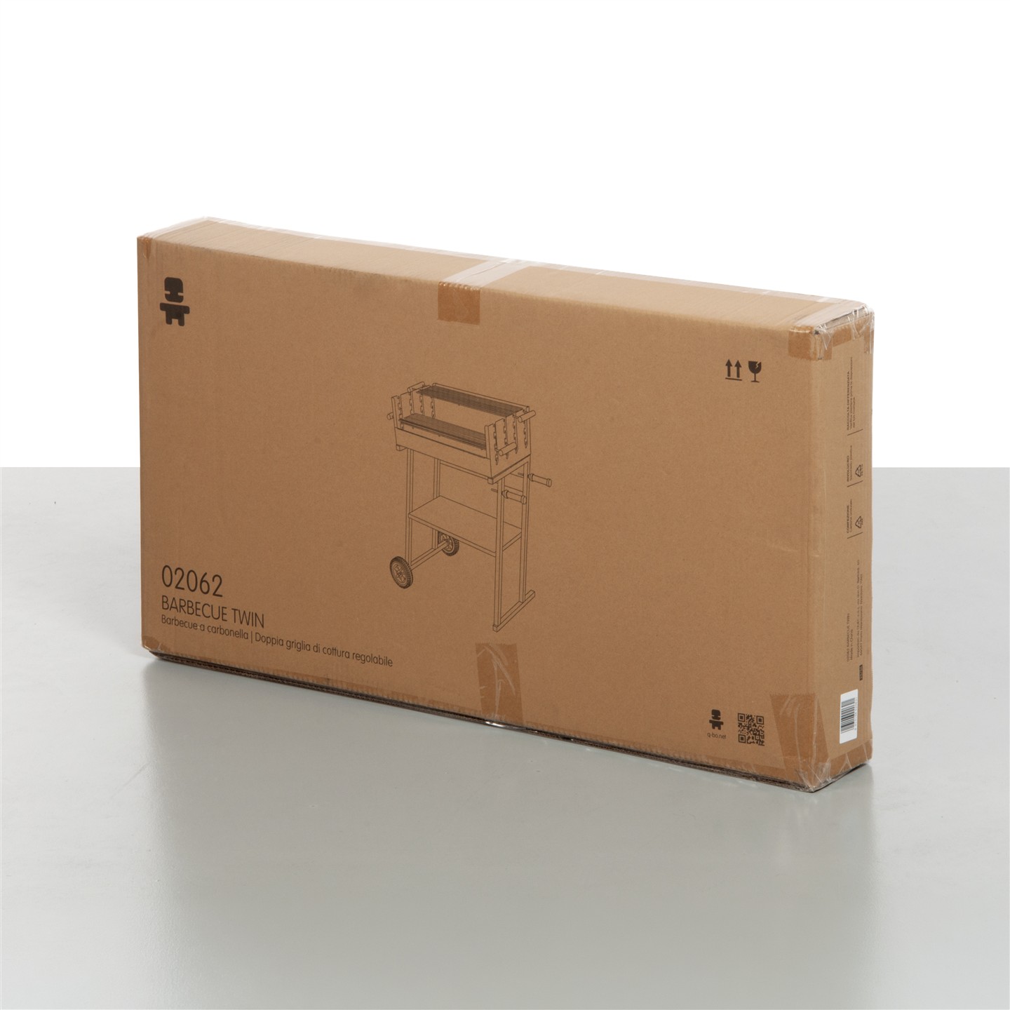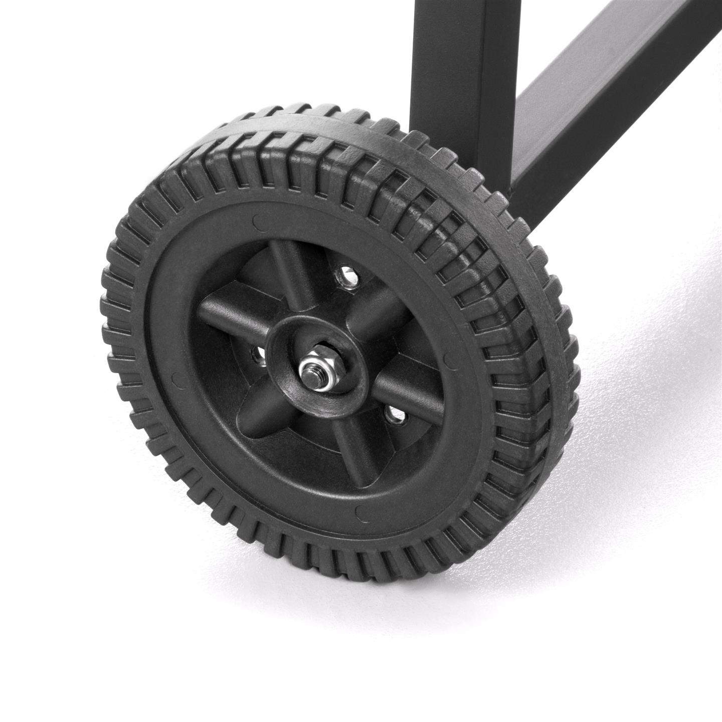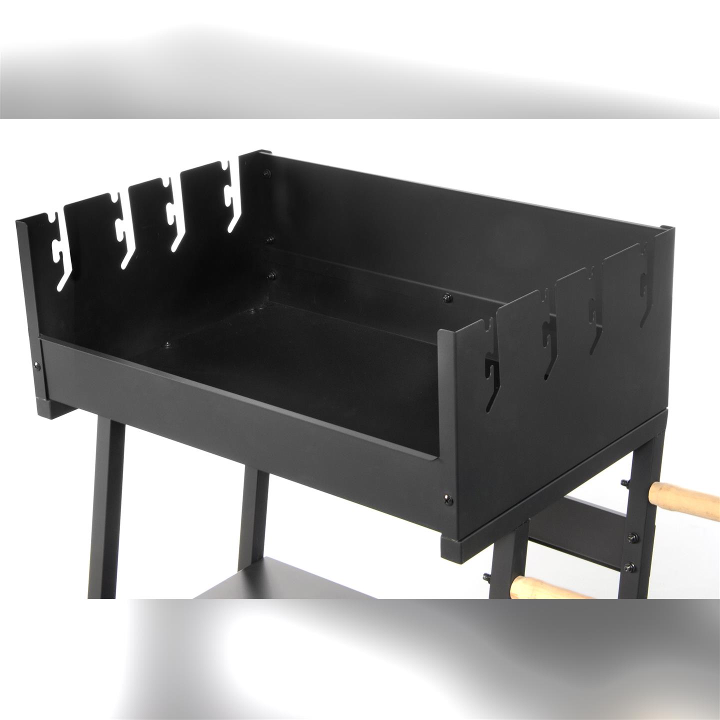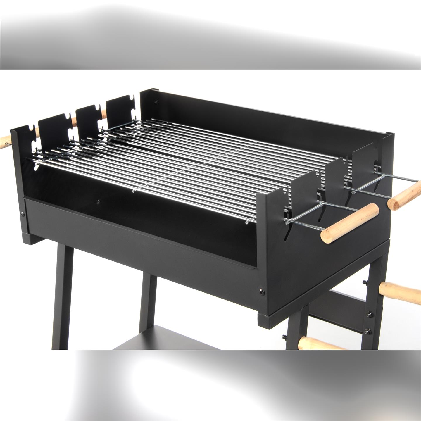 Holzkohlegrill mit Rädern, Windschutz, Ablagefläche und zwei Holzgriffen. Schwarz lackiertes Stahlgestell. Zwei Grillroste (58 x 16,5 cm, 3,8/2,8 mm dick) aus verchromtem Stahl mit zwei Holzgriffen. Gesamtmaße mit Griffen: 81,5 x 16,5 cm. Mehrstufige Kochfeldhöhe: 82/85/91 cm. Höhe vom Boden: 78 cm. Gesamtmaße: 83 x 49 x 90 cm (Höhe).
