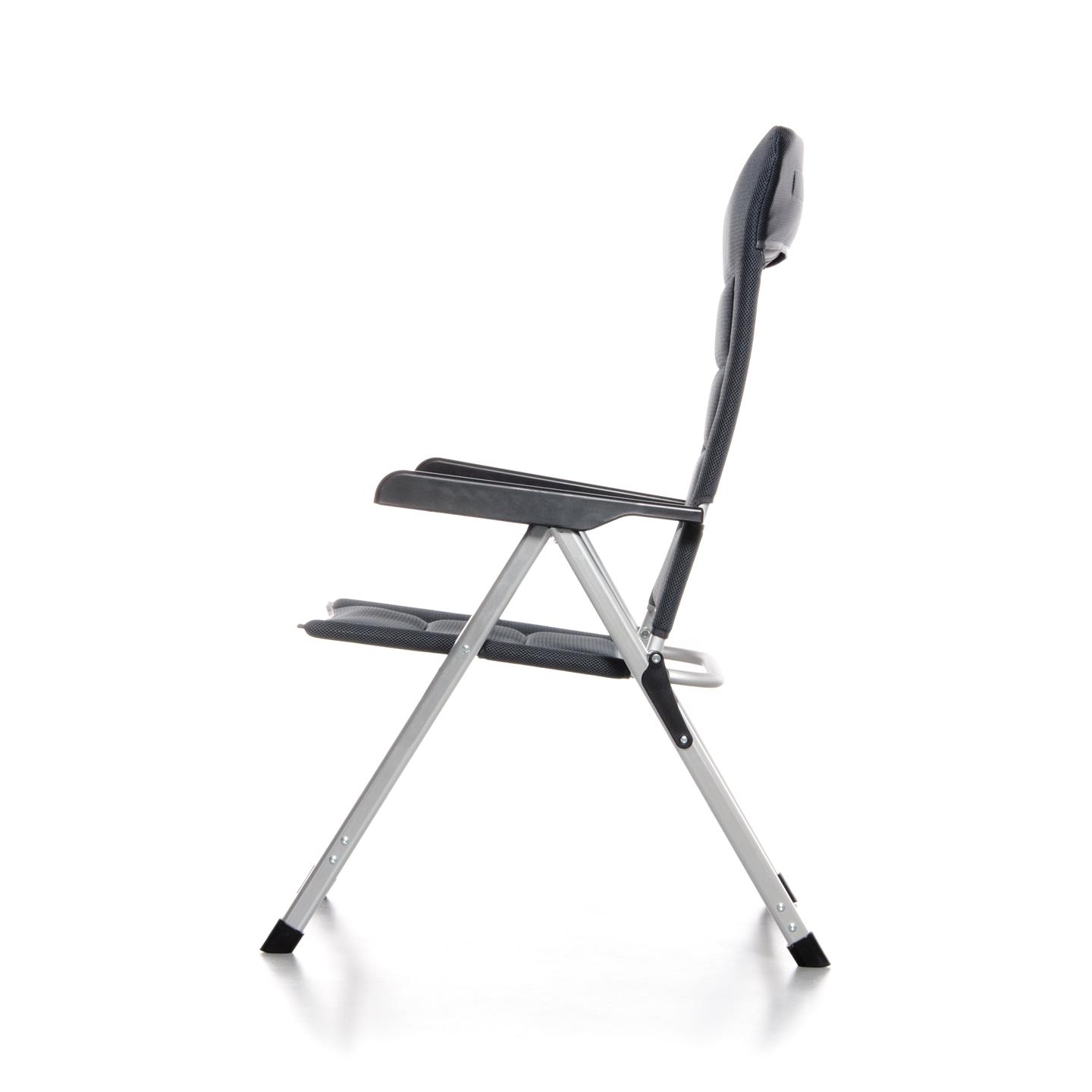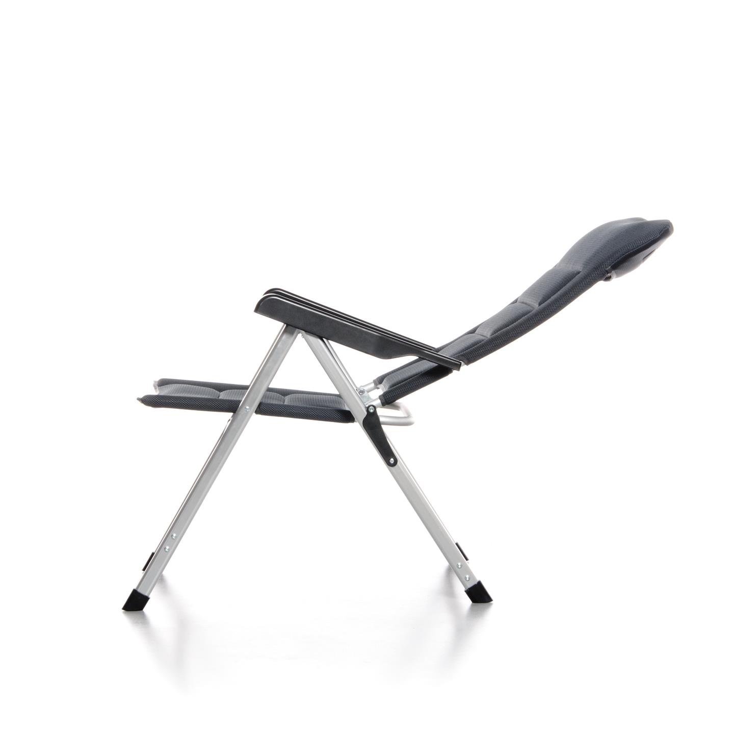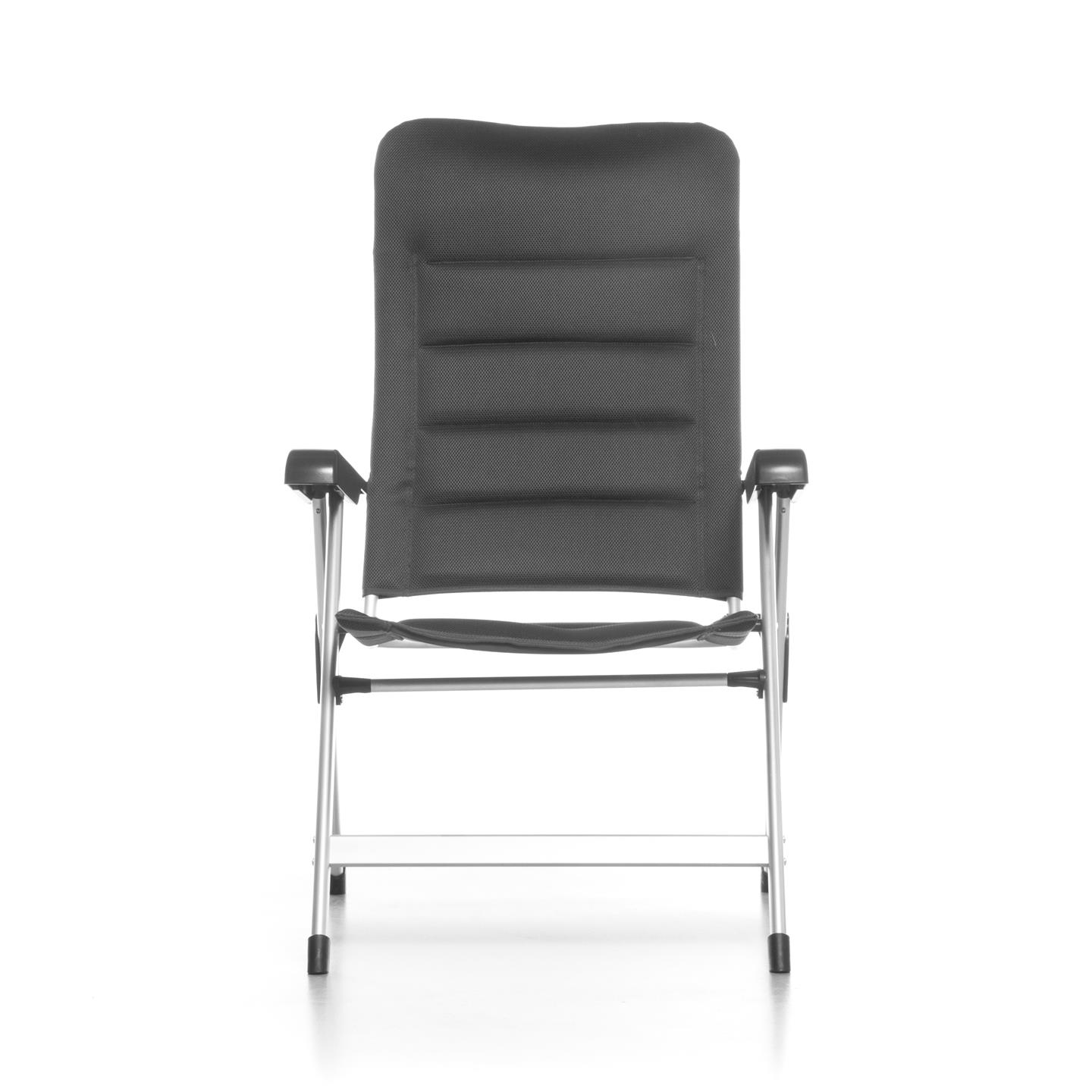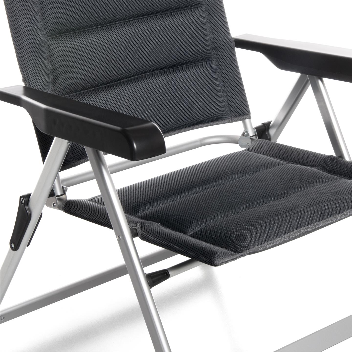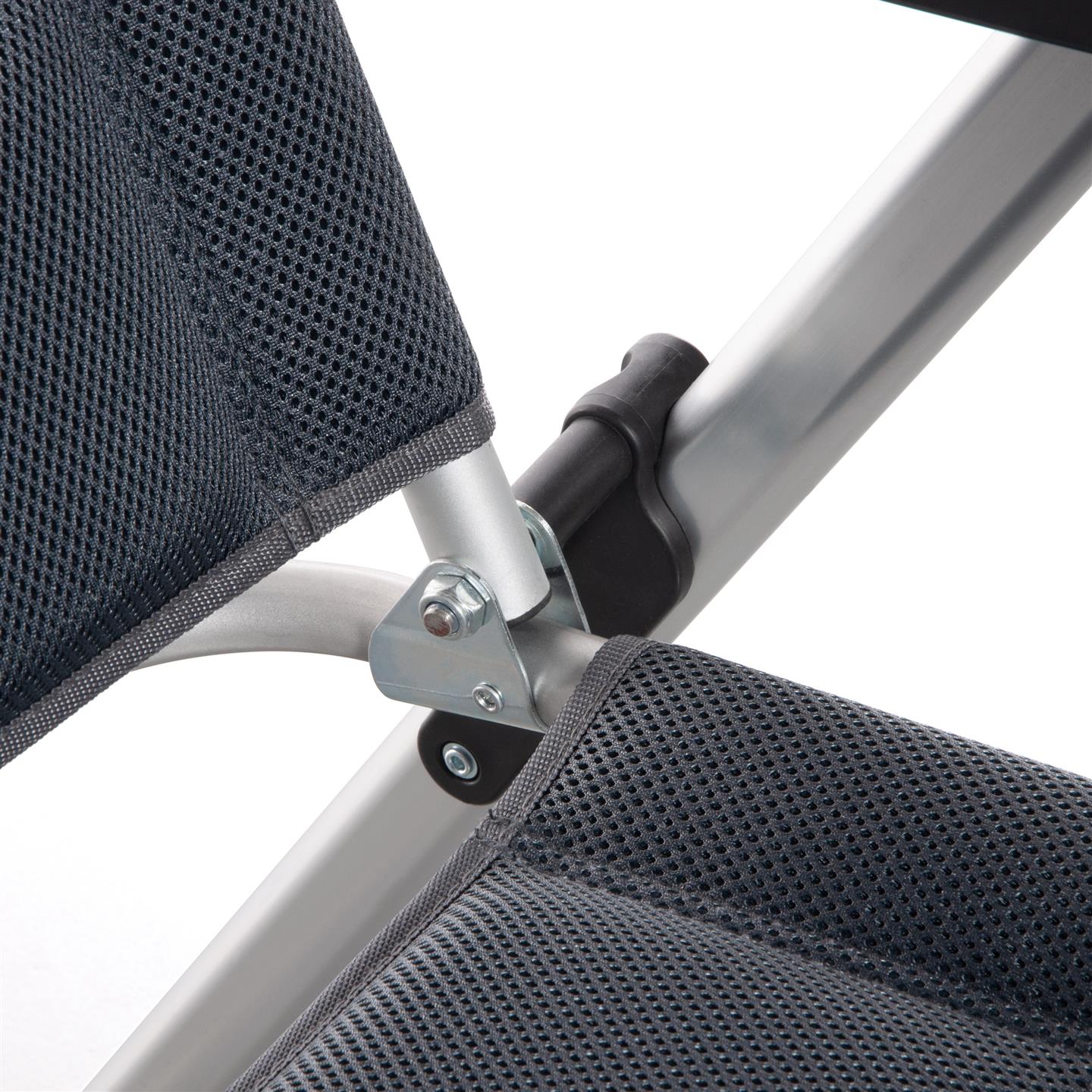 Klappsessel mit 7-fach verstellbarer Rückenlehne, gepolsterter Kopfstütze, Aluminiumrahmen (matt), gepolstertem 3D-Mesh-Polyestergewebe mit schwarzer Oxford-Webart, Stahl-/Nylonverbindern, 69 x 80 x 120 cm, Rohrprofil Ø 22 x 1,2 mm / 35 x 22 mm / 45 x 16 mm, Sitzhöhe 45 cm, Gewicht 4,9 kg