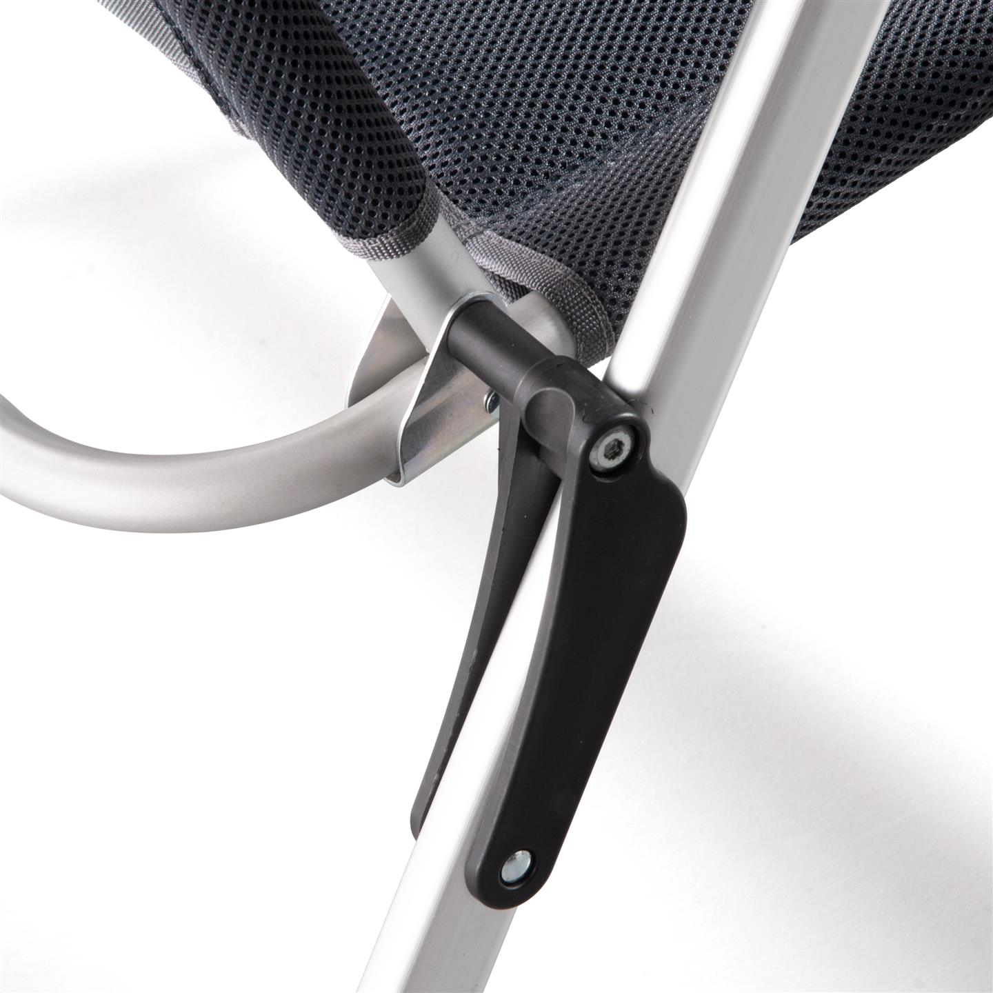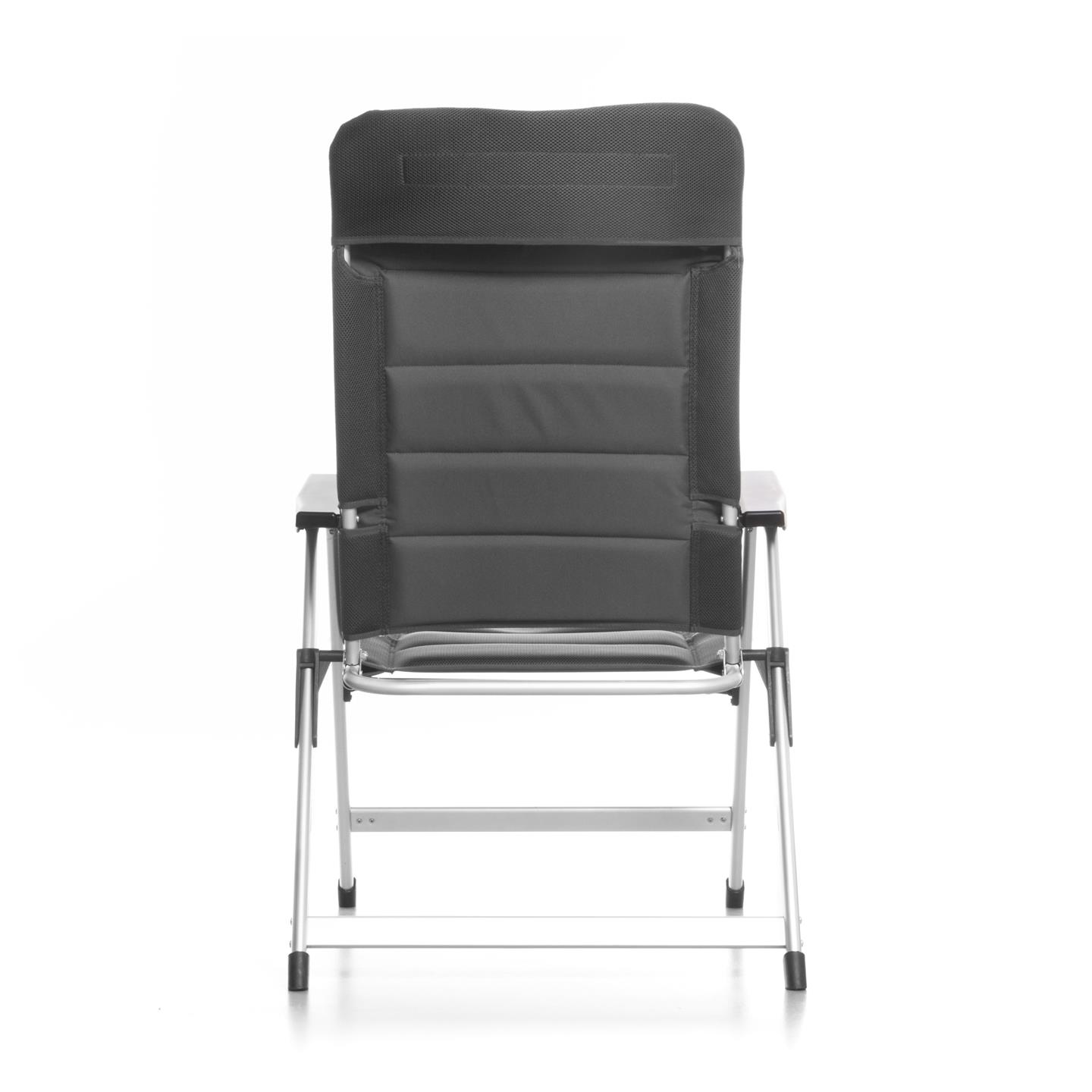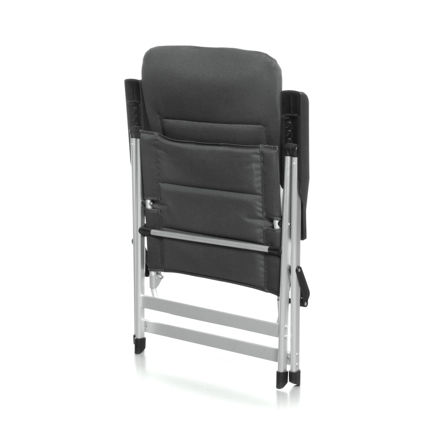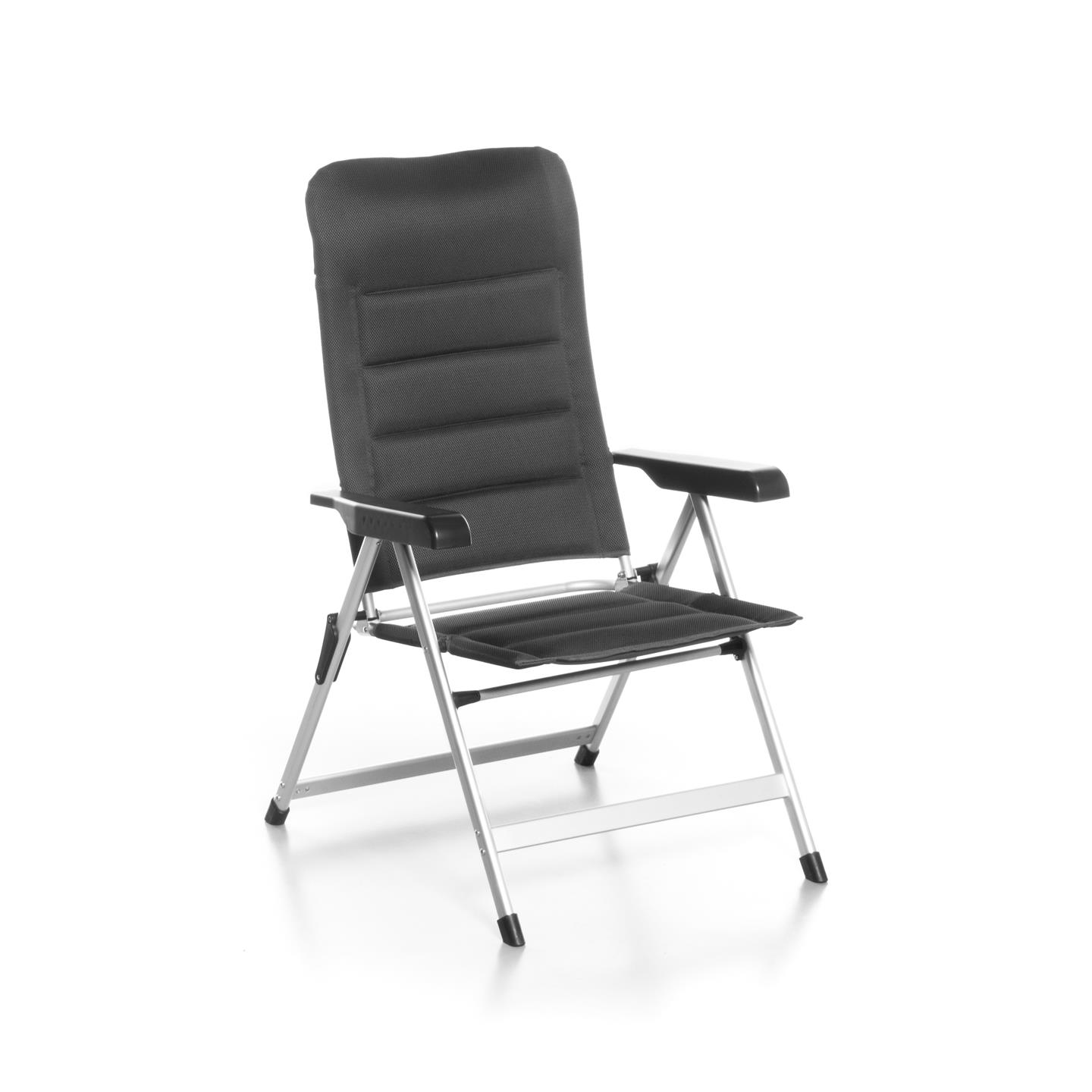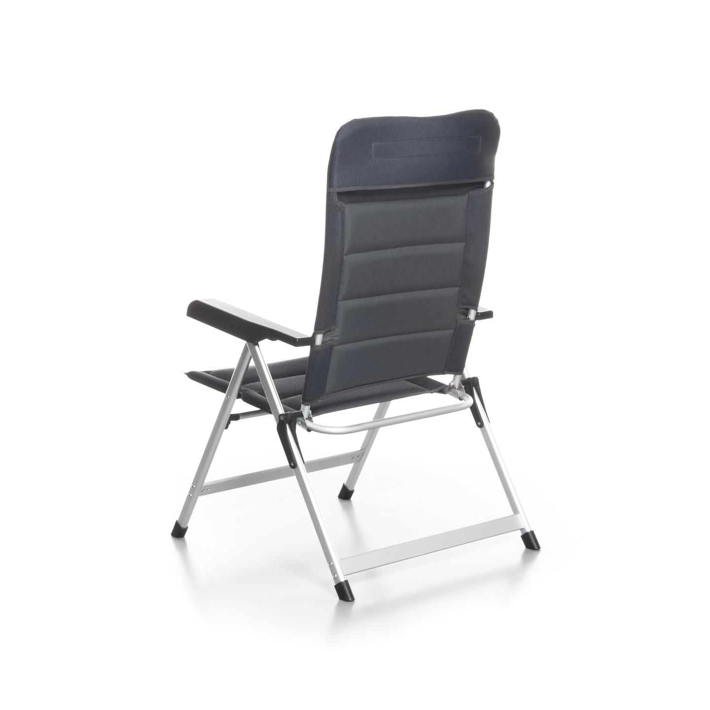 Klappsessel mit 7-fach verstellbarer Rückenlehne, gepolsterter Kopfstütze, Aluminiumrahmen (matt), gepolstertem 3D-Mesh-Polyestergewebe mit schwarzer Oxford-Webart, Stahl-/Nylonverbindern, 69 x 80 x 120 cm, Rohrprofil Ø 22 x 1,2 mm / 35 x 22 mm / 45 x 16 mm, Sitzhöhe 45 cm, Gewicht 4,9 kg