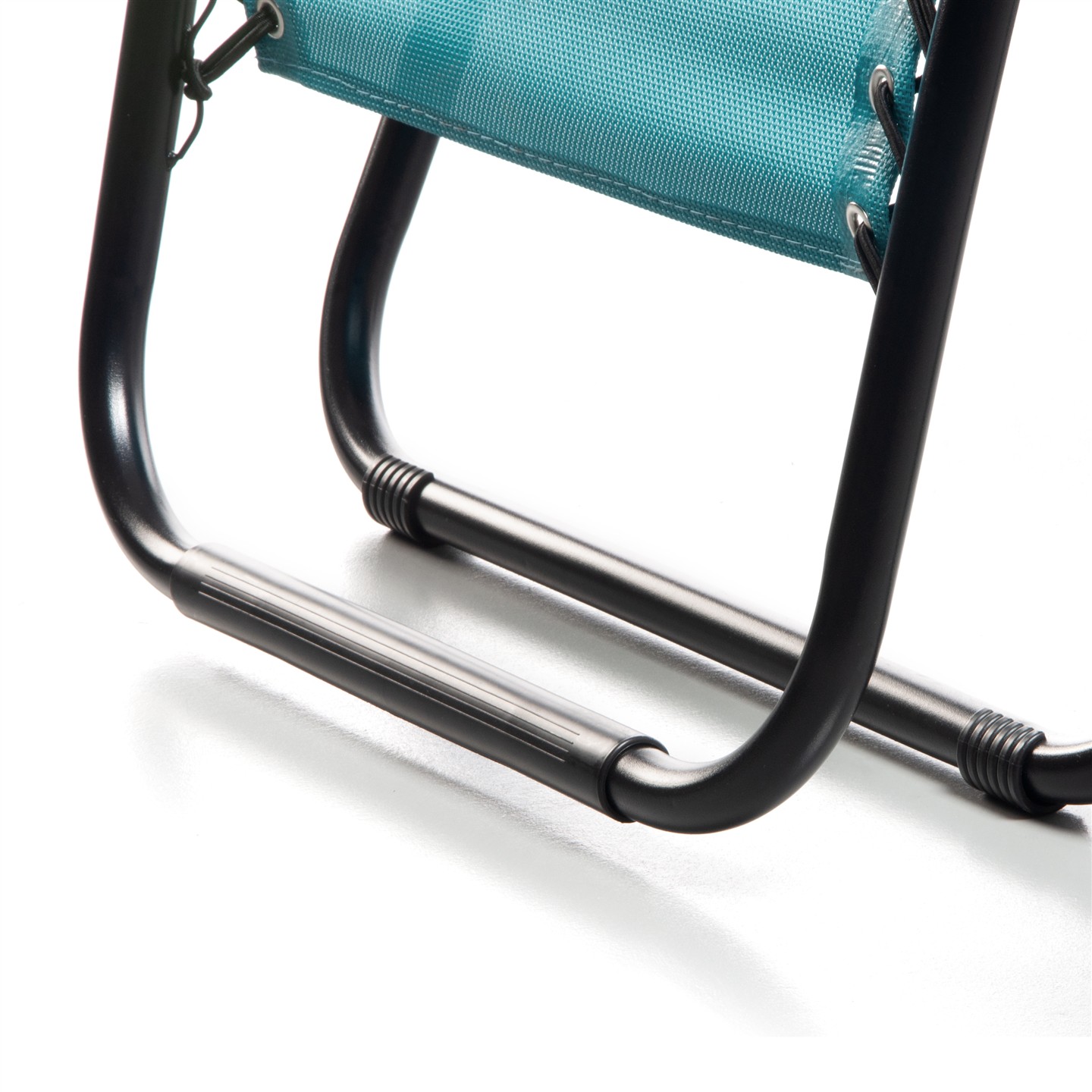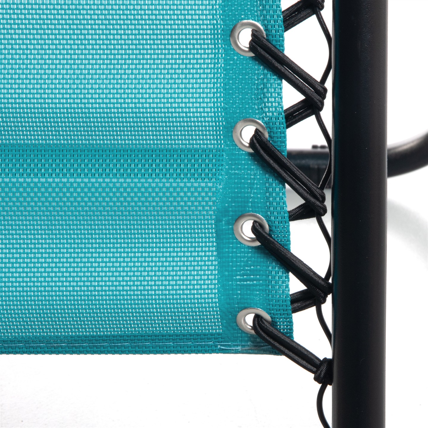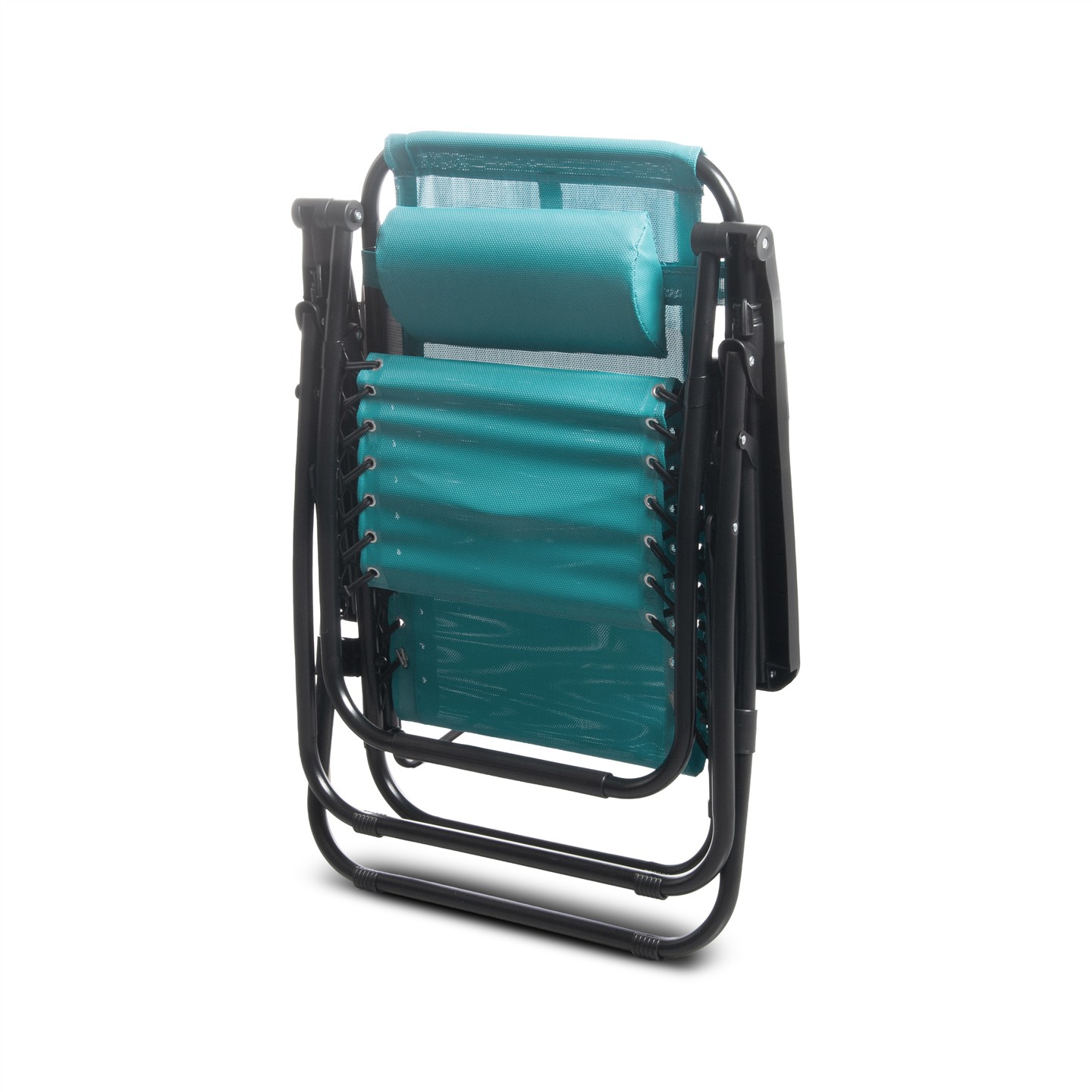 Verstellbarer und klappbarer Sessel/Liegestuhl mit abnehmbarem Kissen. Schwarzes, pulverbeschichtetes Stahlgestell (matt), 2 x 1 g/m² Textilene-Gewebe in Petrolgrün, schwarze Gummibänder. Maße: 88 x 65 x 110 cm (94 x 11 x 65 cm zusammengeklappt), Rohrquerschnitt Ø 25 x 0,8 mm