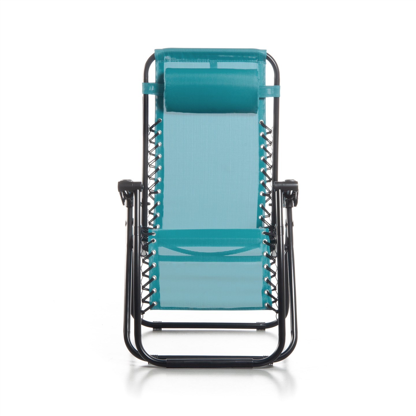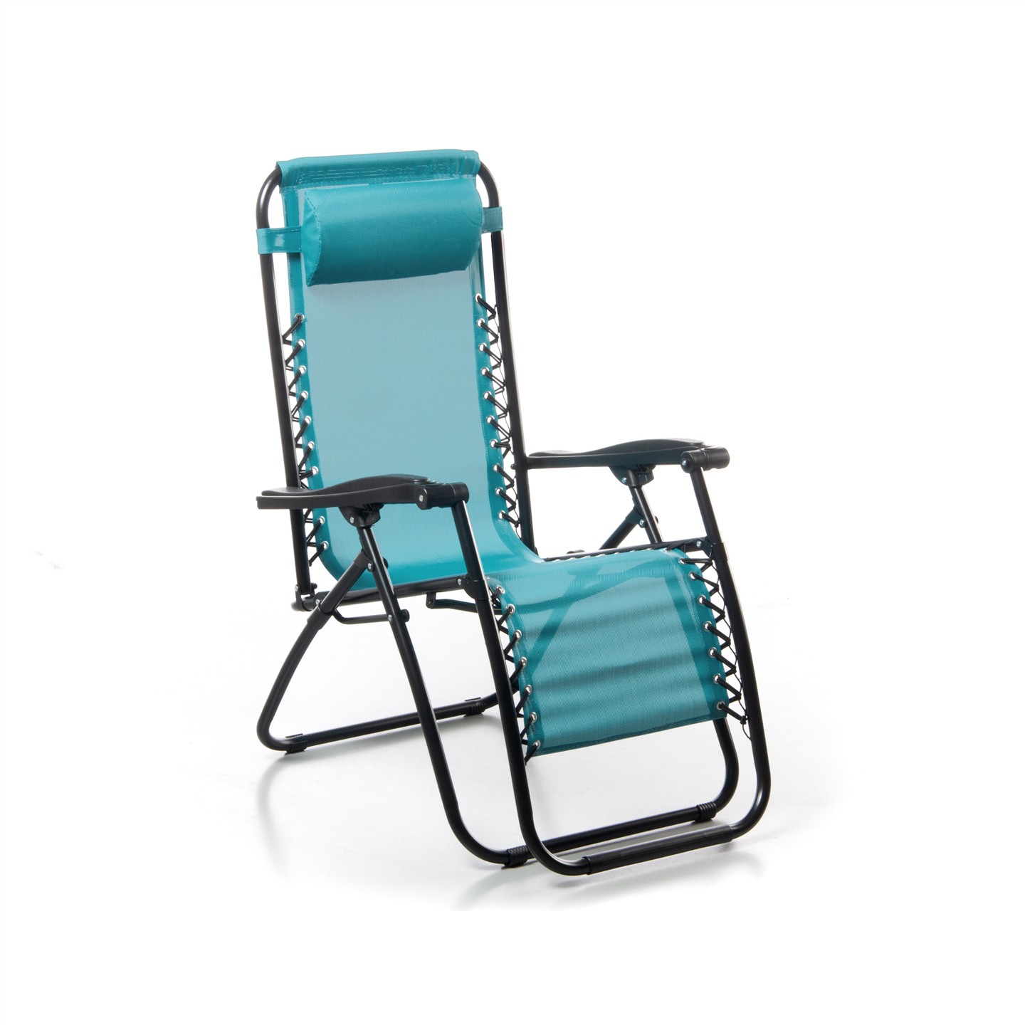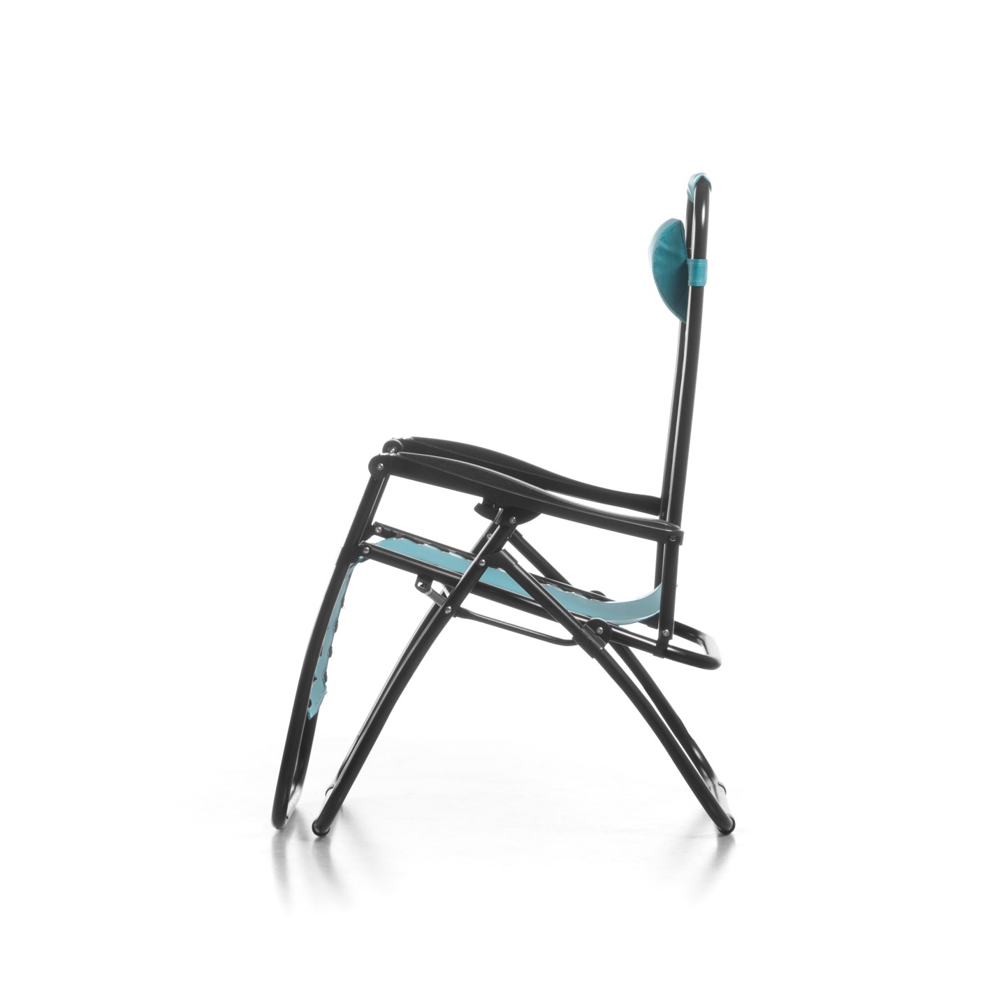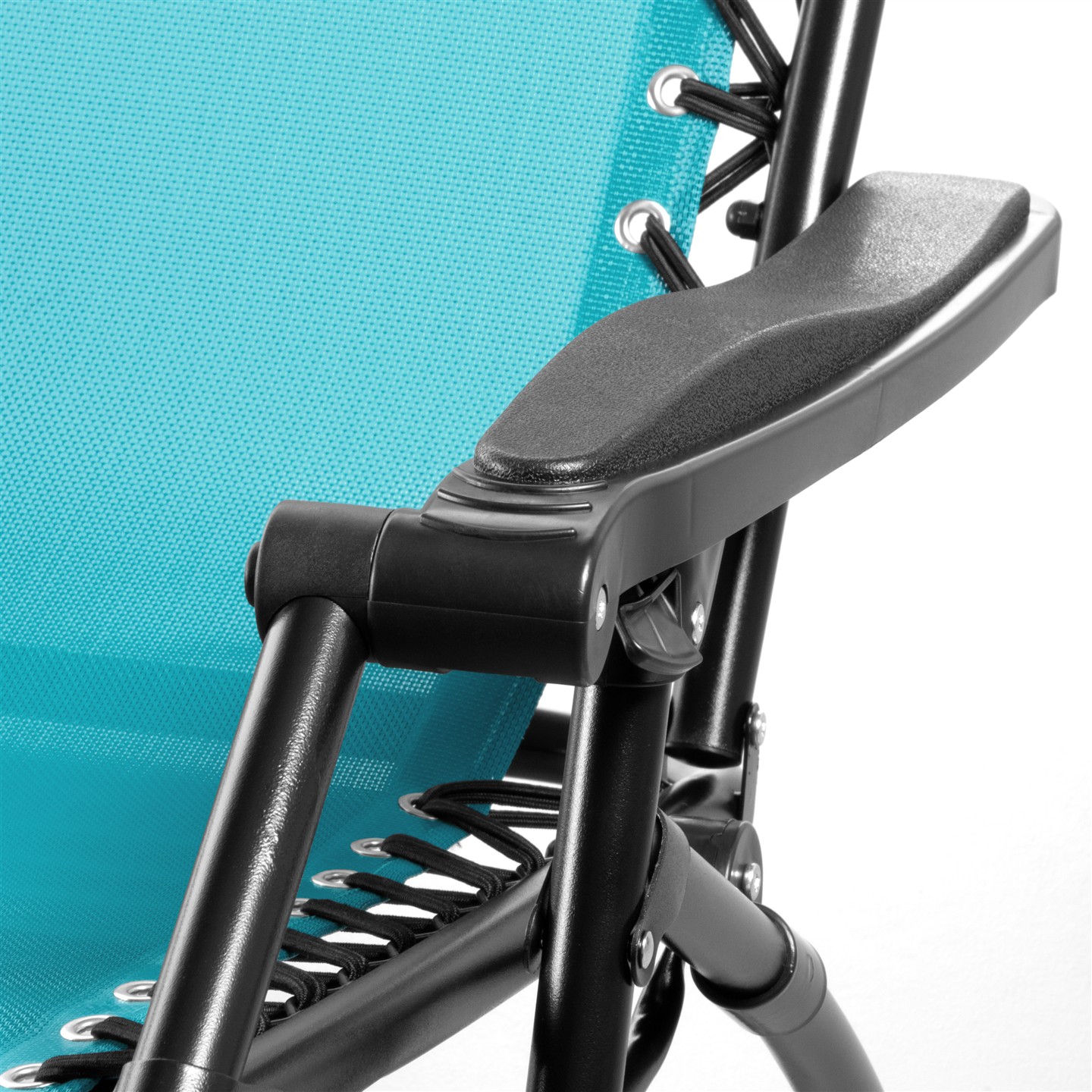 Verstellbarer und klappbarer Sessel/Liegestuhl mit abnehmbarem Kissen. Schwarzes, pulverbeschichtetes Stahlgestell (matt), 2 x 1 g/m² Textilene-Gewebe in Petrolgrün, schwarze Gummibänder. Maße: 88 x 65 x 110 cm (94 x 11 x 65 cm zusammengeklappt), Rohrquerschnitt Ø 25 x 0,8 mm