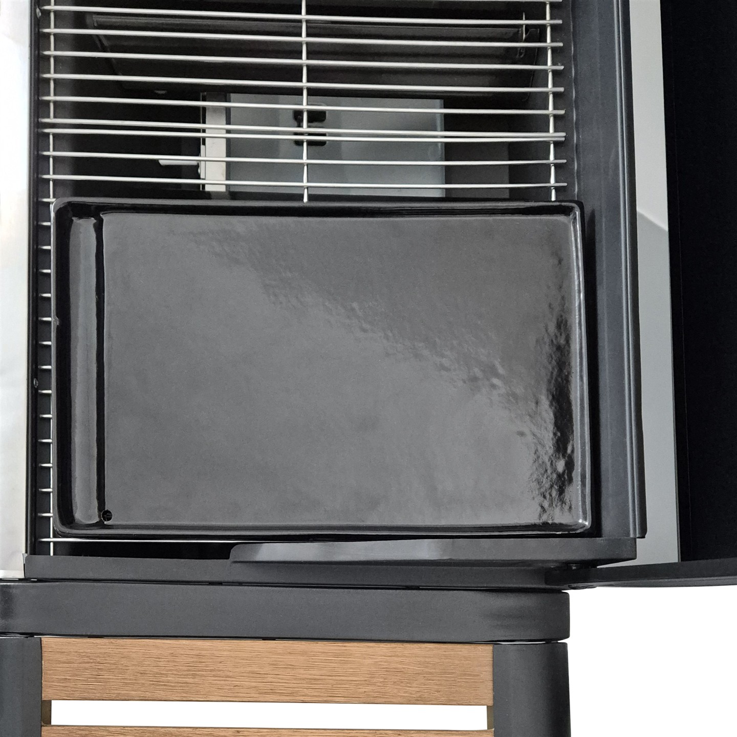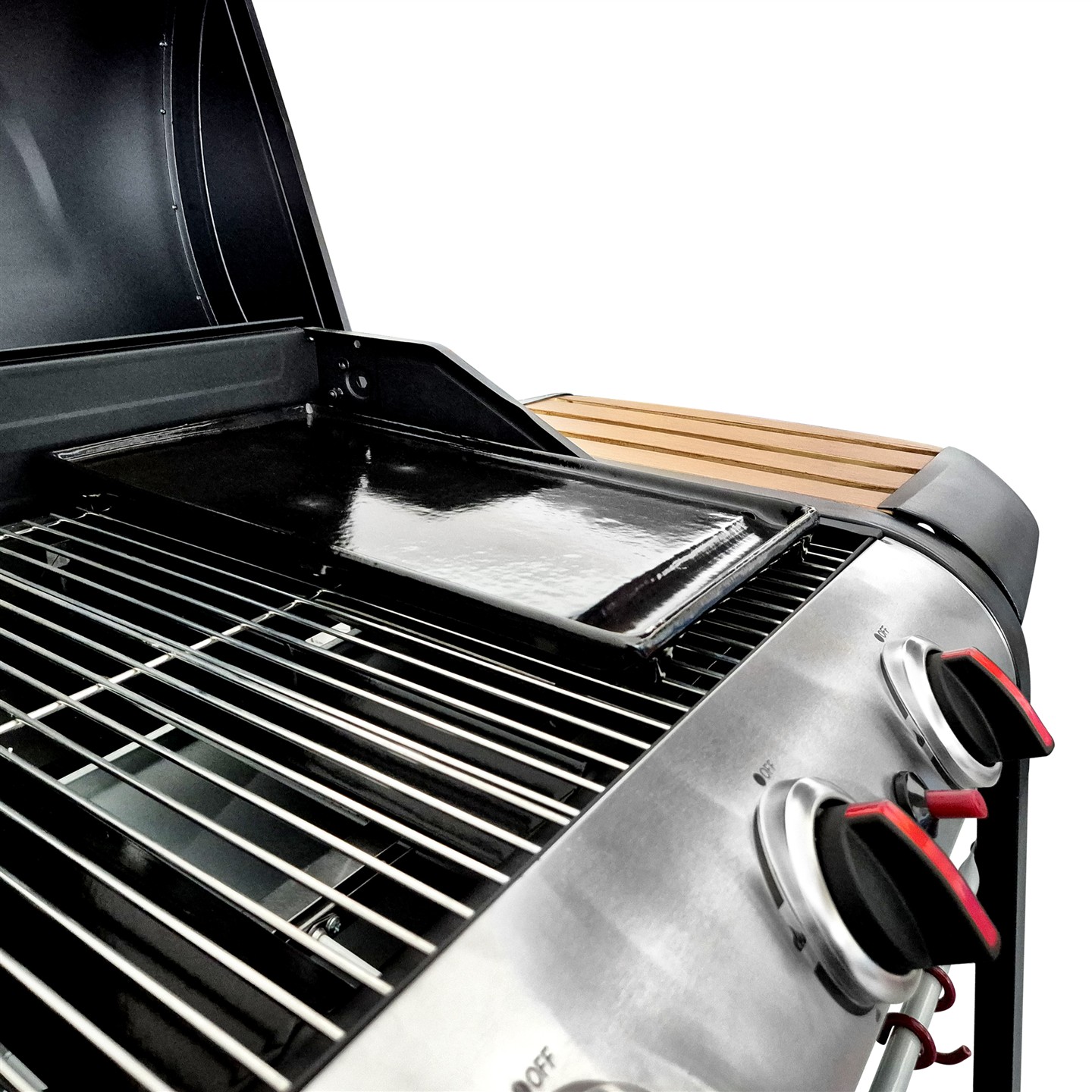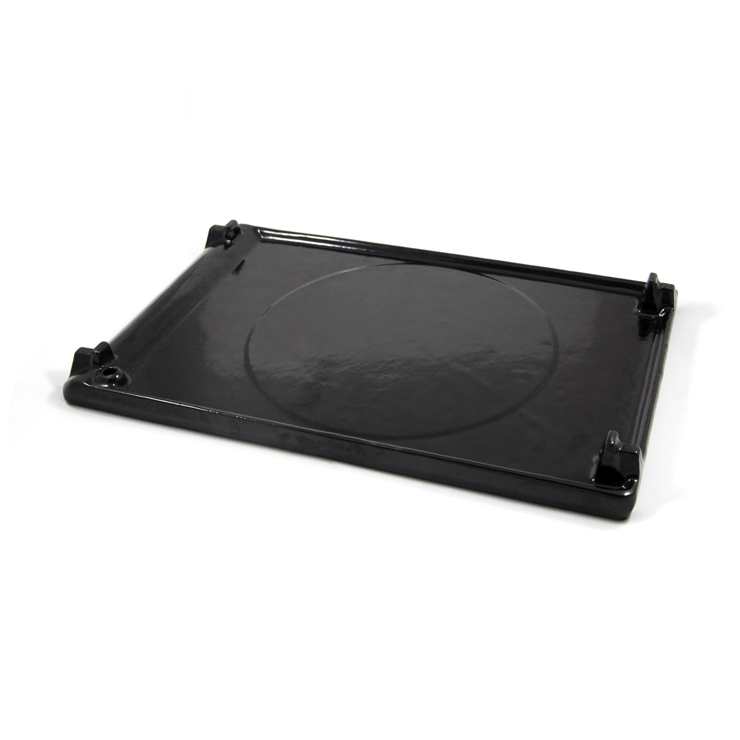Emaillierte Gusseisenplatte mit seitlicher Fettablaufrinne und Loch. Kochfläche 35,7 x 23,5 cm | Gesamtabmessungen 39,7 x 25,7 cm; höchster Punkt h 4,4 cm; niedrigster Punkt h 3,7 cm (die Platte hat ein leichtes Gefälle zur Seite der Entwässerungsrinne). Zubehör für Gasgrill 3F 02082.