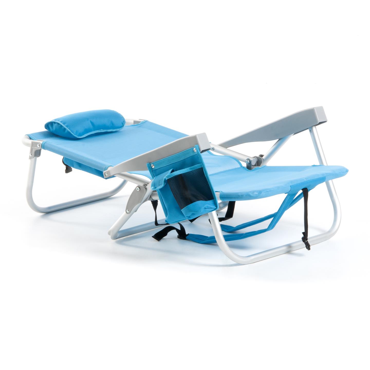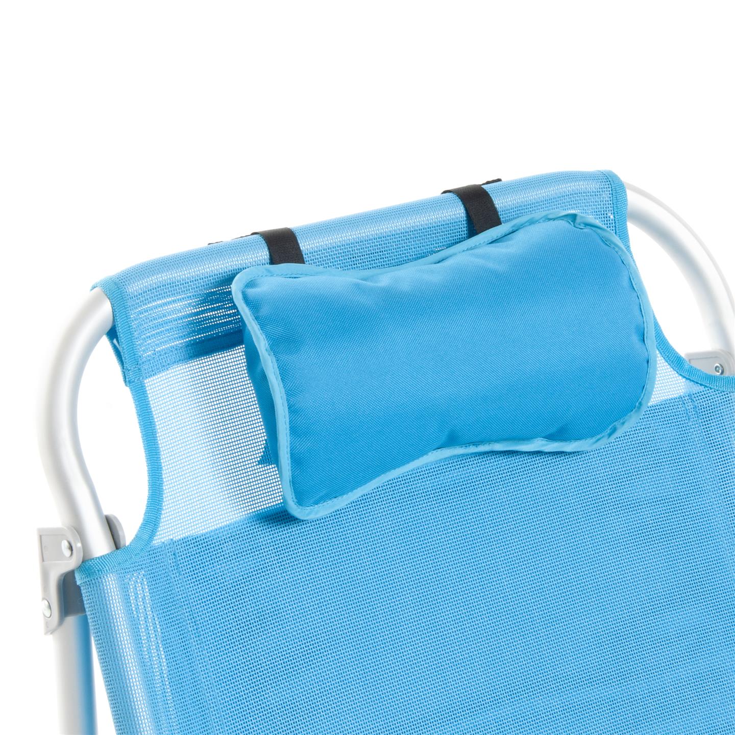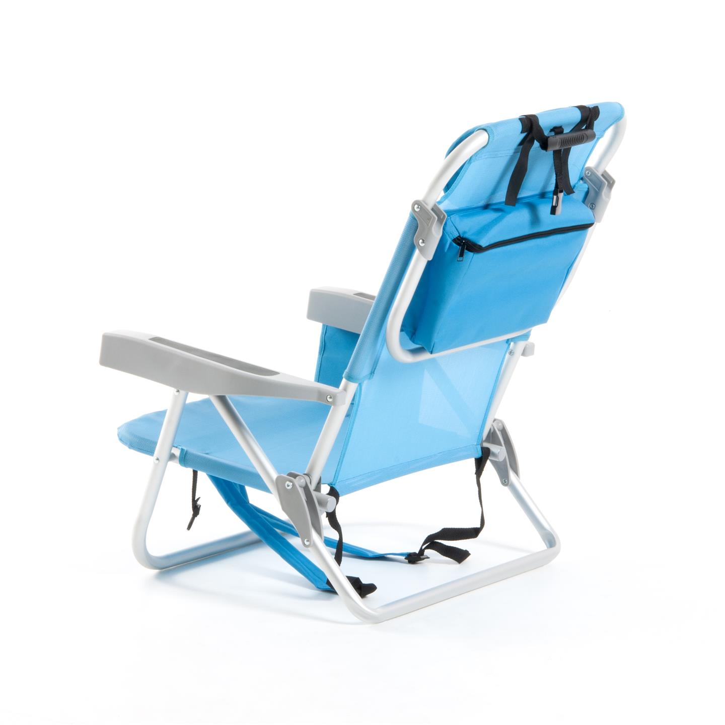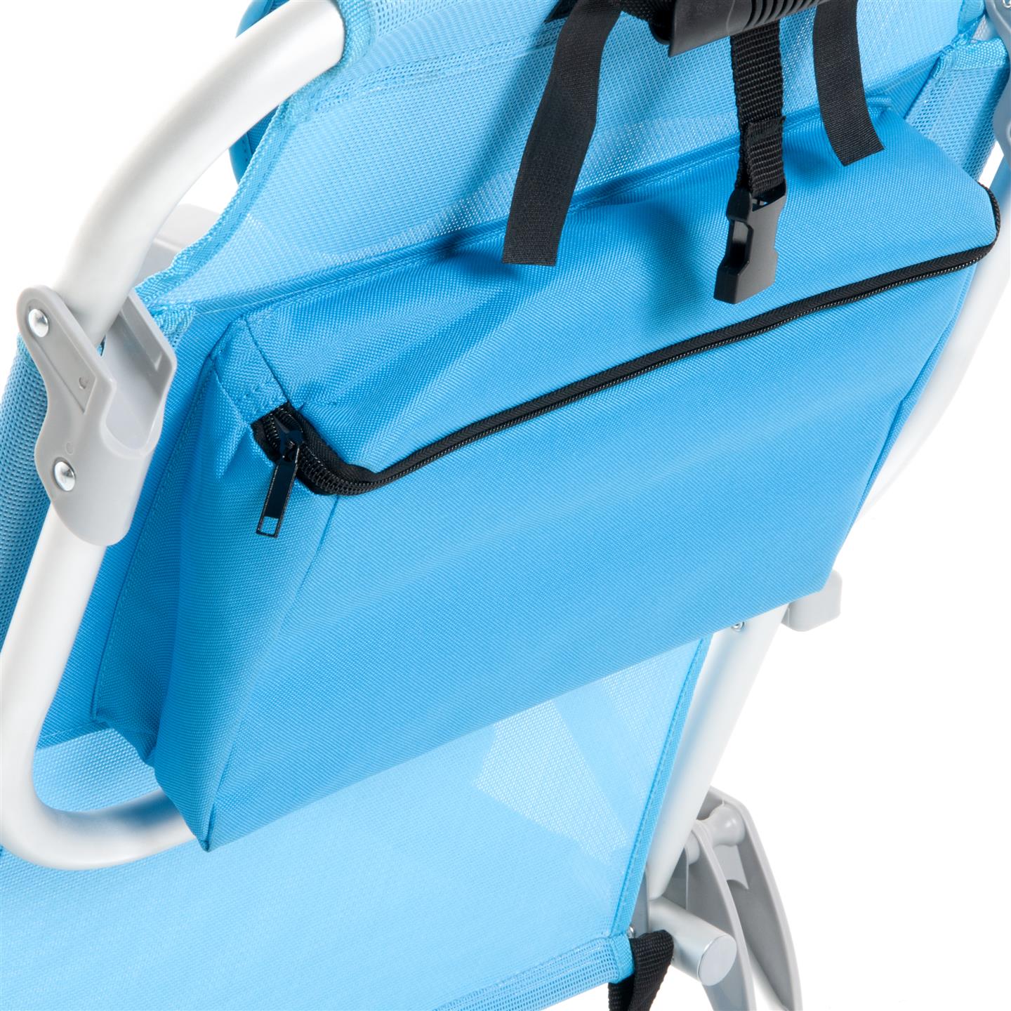 Klappbarer Strandstuhl mit Armlehnen, Kopfstutzenkissen, 8-fach verstellbare Ruckenlehne, seitliche Aufbewahrungstaschen, Kuhltasche hinten 32 x 20 x 8 cm, Fassungsvermogen 5 Liter, Schultergurte fur den Transport, Aluminiumstruktur, 1X1 Textilene-Gewebe (zwei Farben: Hellblau und Dunkelgrau), Sitzhohe 21 cm, Mase 63,5 x 63 x 77 cm, Rohrquerschnitt O 24 x 0,9 mm.