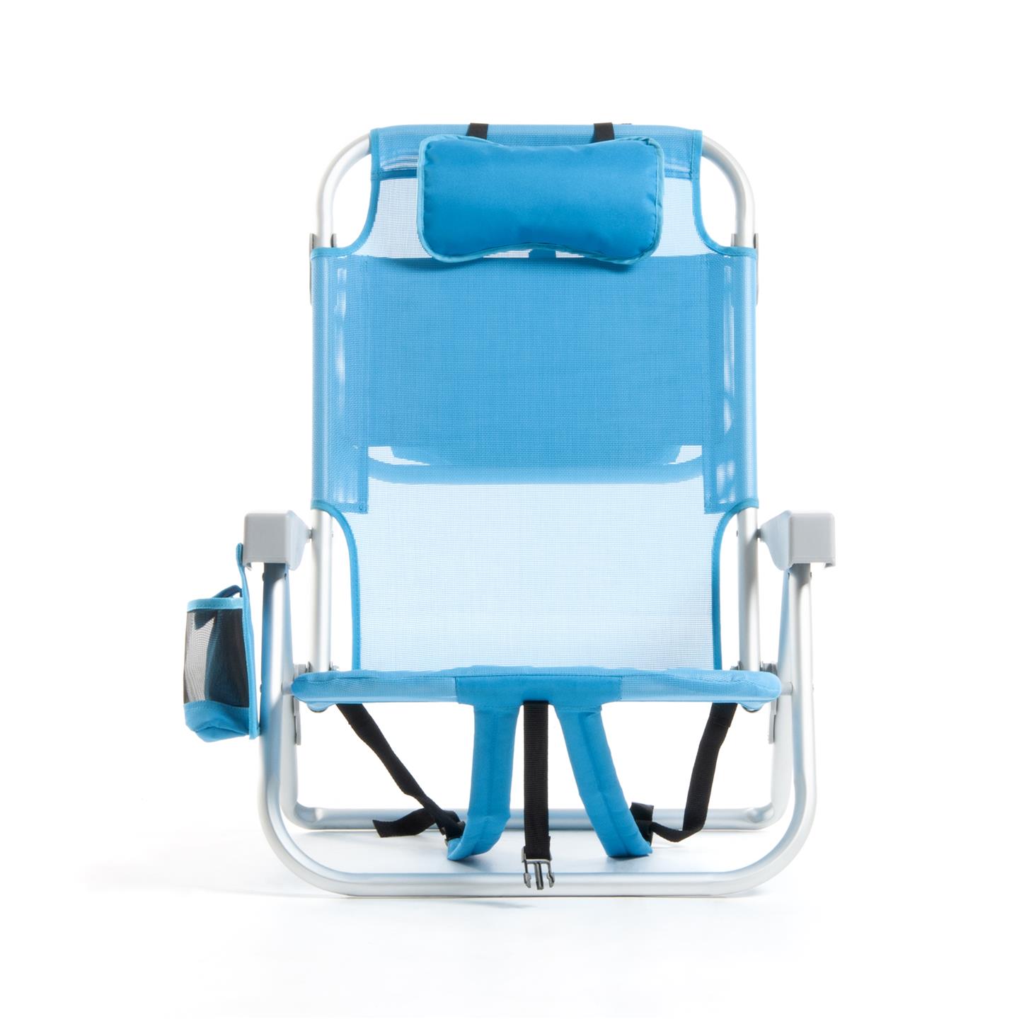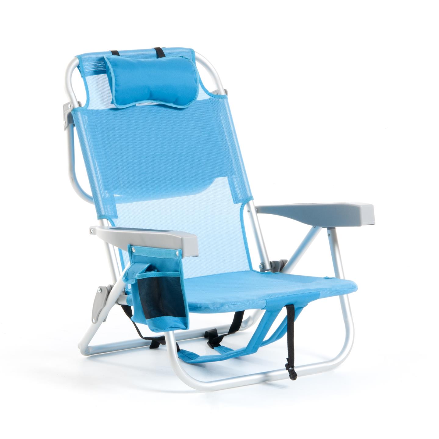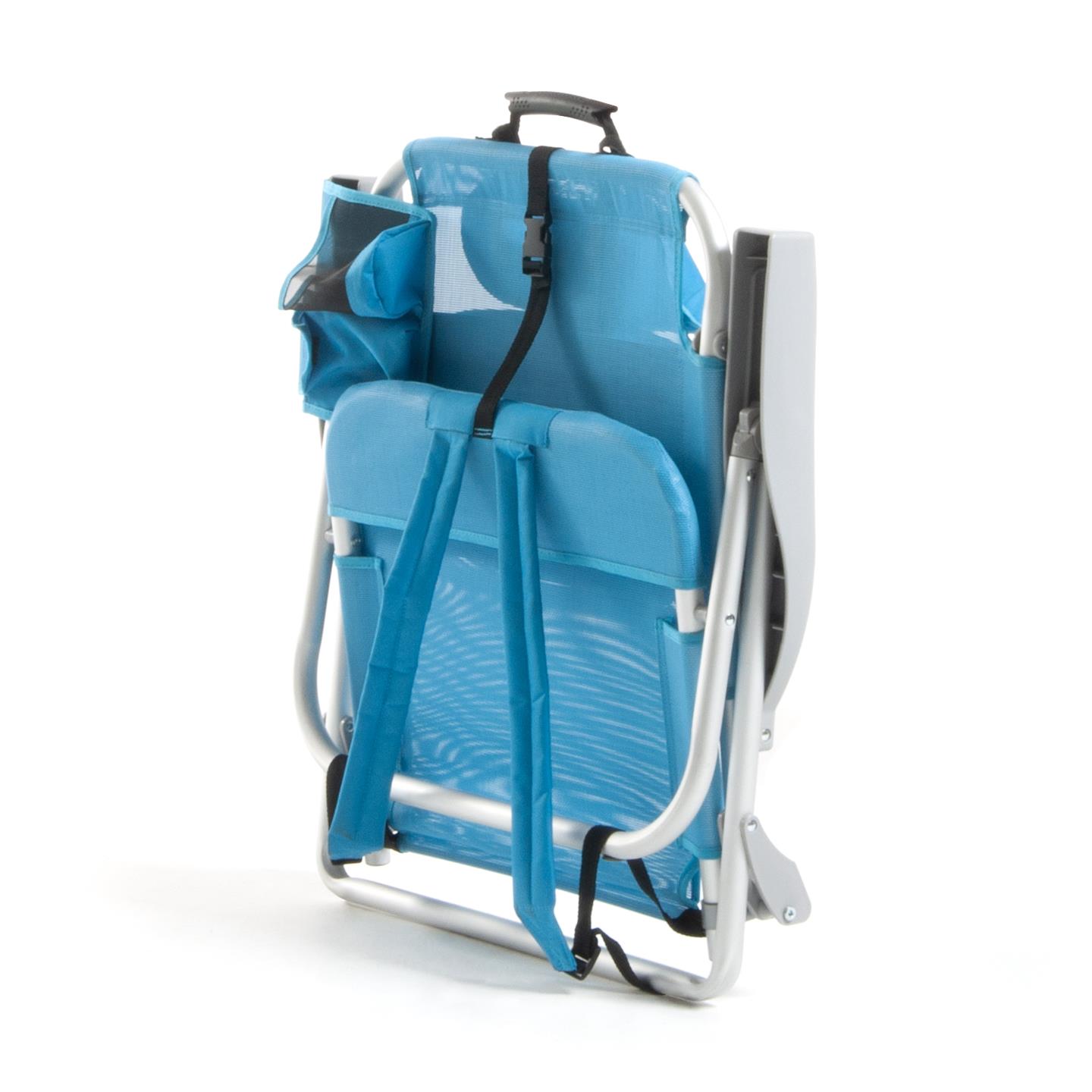 Klappbarer Strandstuhl mit Armlehnen, Kopfstutzenkissen, 8-fach verstellbare Ruckenlehne, seitliche Aufbewahrungstaschen, Kuhltasche hinten 32 x 20 x 8 cm, Fassungsvermogen 5 Liter, Schultergurte fur den Transport, Aluminiumstruktur, 1X1 Textilene-Gewebe (zwei Farben: Hellblau und Dunkelgrau), Sitzhohe 21 cm, Mase 63,5 x 63 x 77 cm, Rohrquerschnitt O 24 x 0,9 mm.