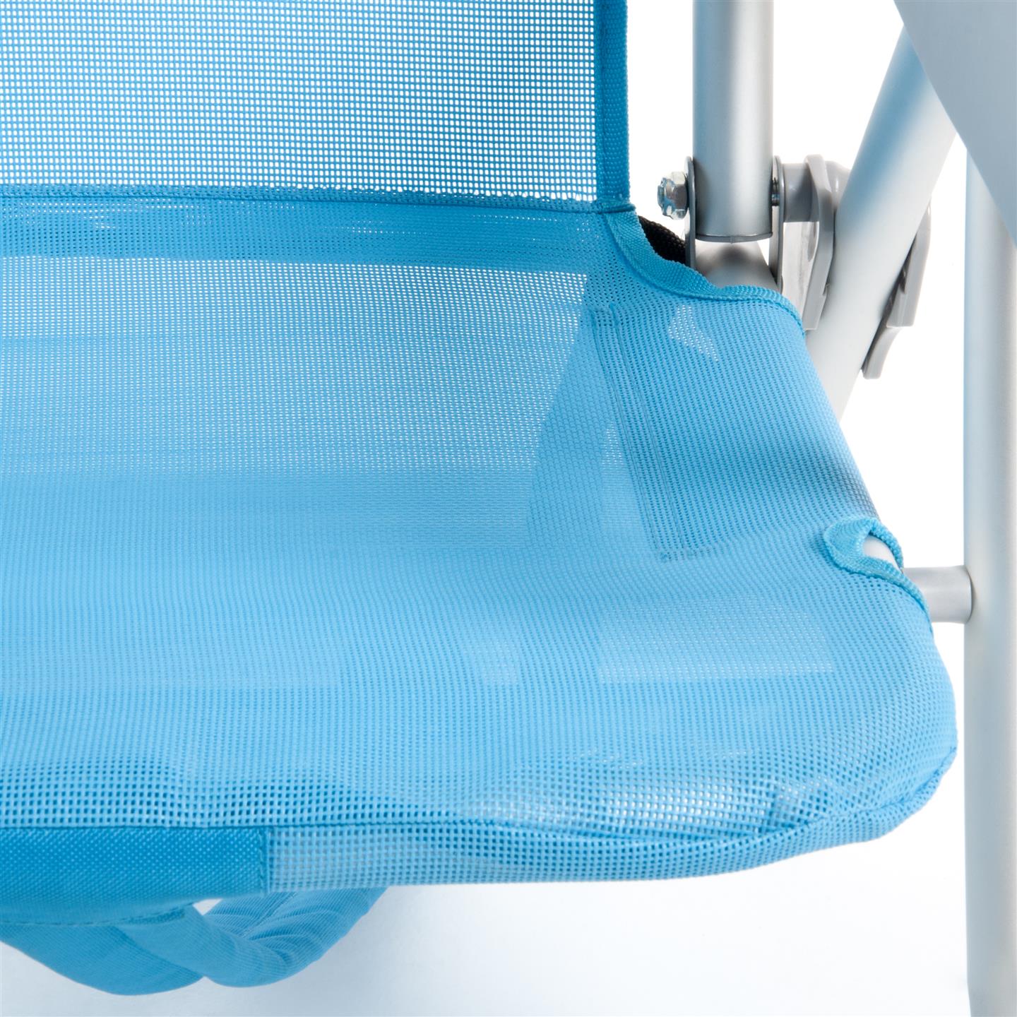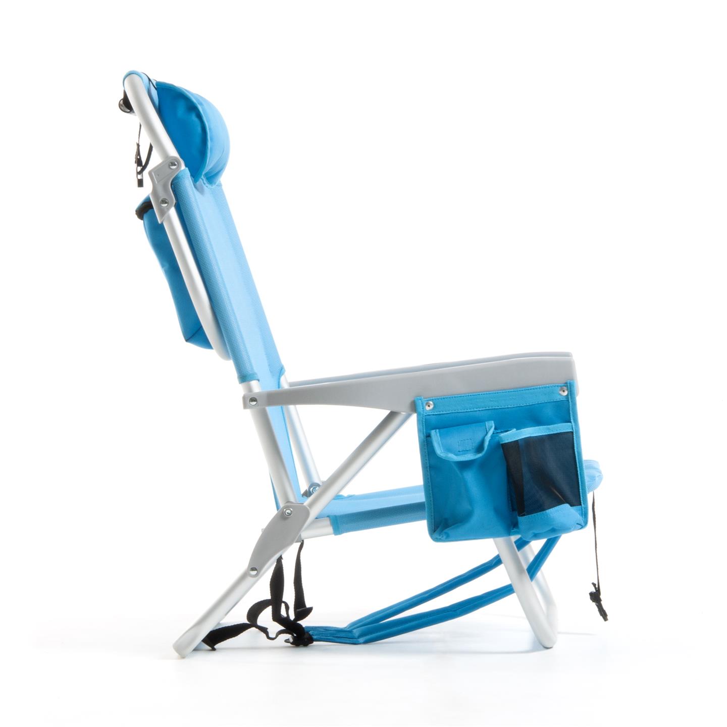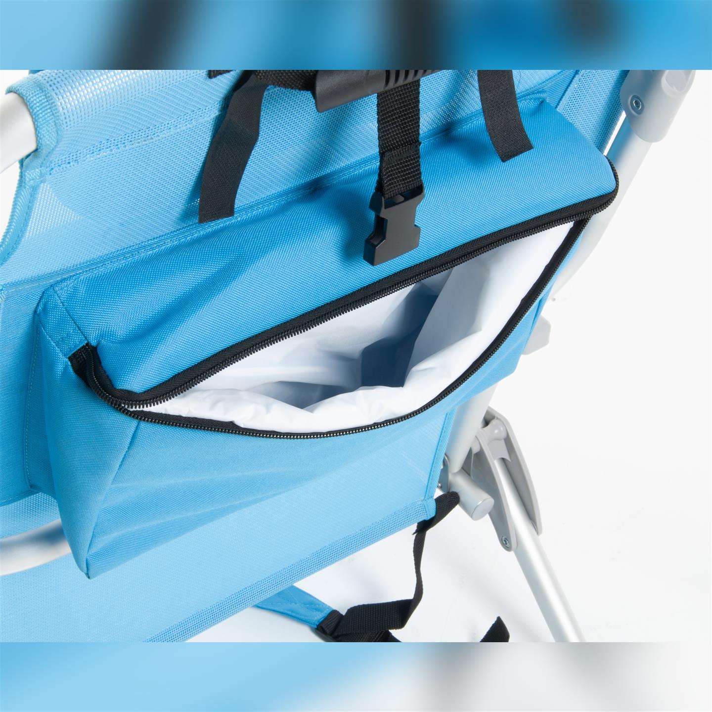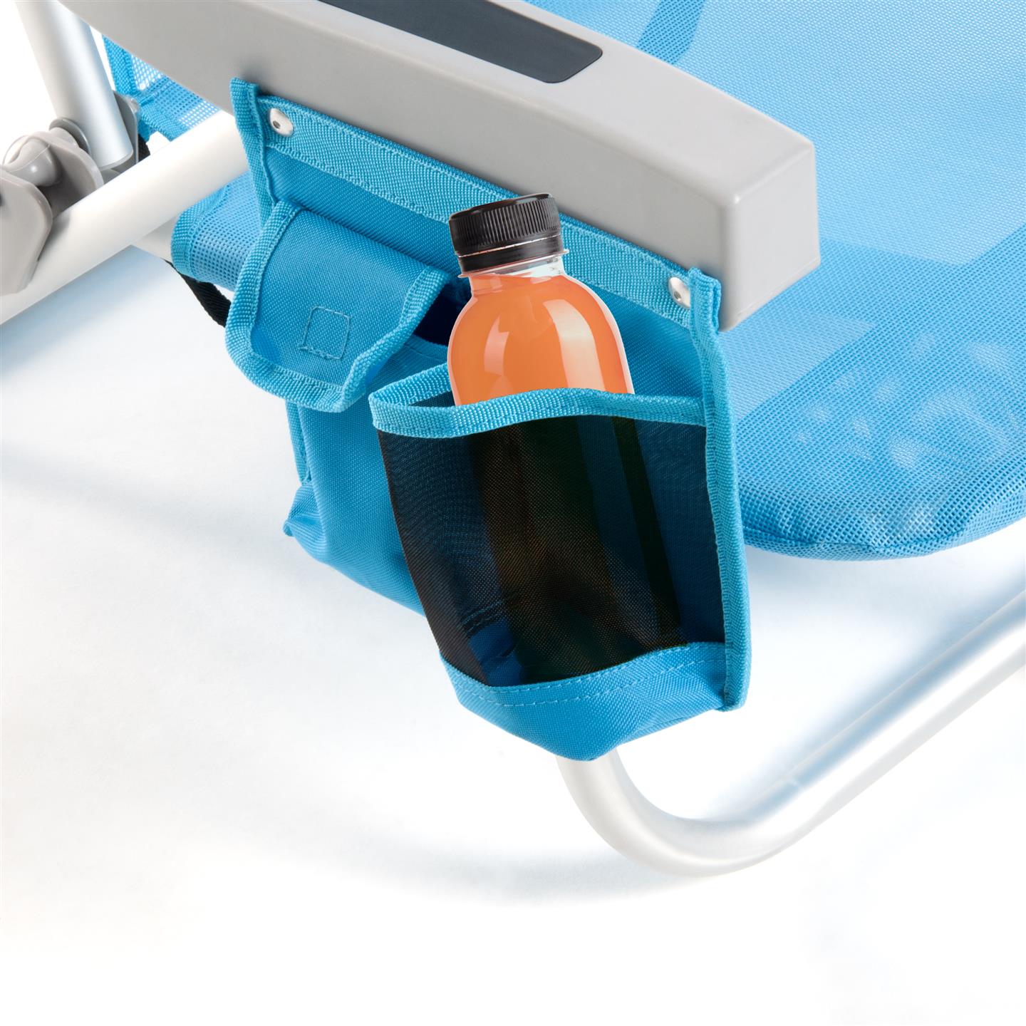 Klappbarer Strandstuhl mit Armlehnen, Kopfstutzenkissen, 8-fach verstellbare Ruckenlehne, seitliche Aufbewahrungstaschen, Kuhltasche hinten 32 x 20 x 8 cm, Fassungsvermogen 5 Liter, Schultergurte fur den Transport, Aluminiumstruktur, 1X1 Textilene-Gewebe (zwei Farben: Hellblau und Dunkelgrau), Sitzhohe 21 cm, Mase 63,5 x 63 x 77 cm, Rohrquerschnitt O 24 x 0,9 mm.