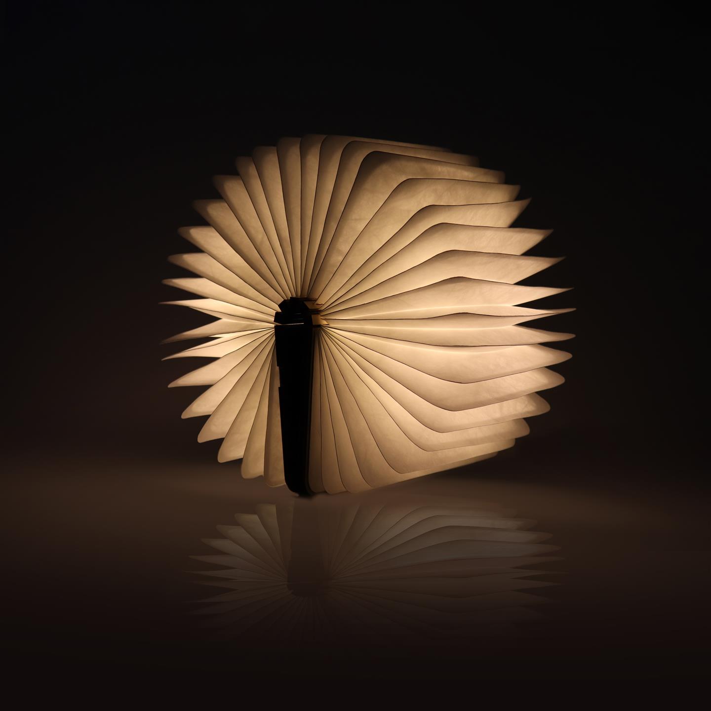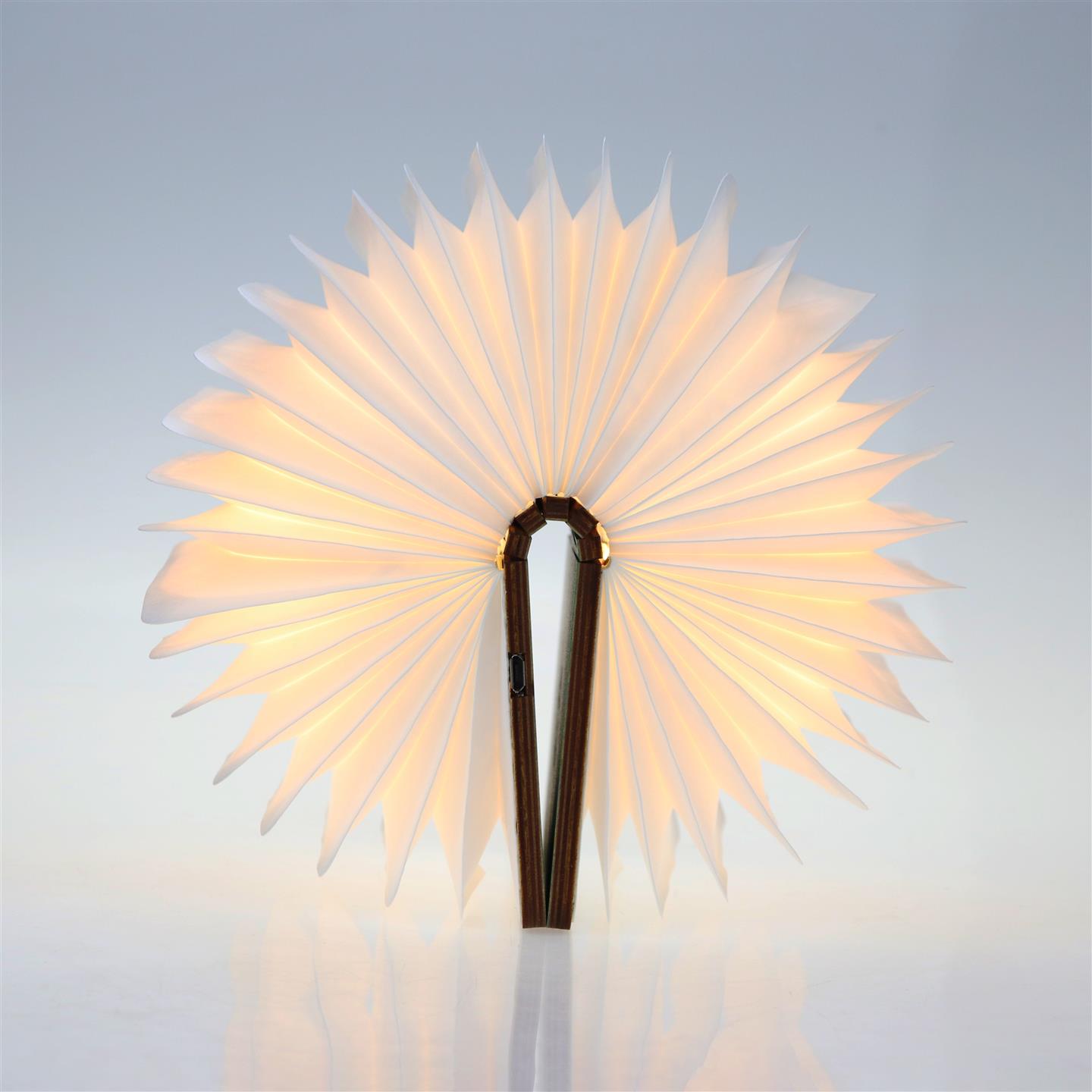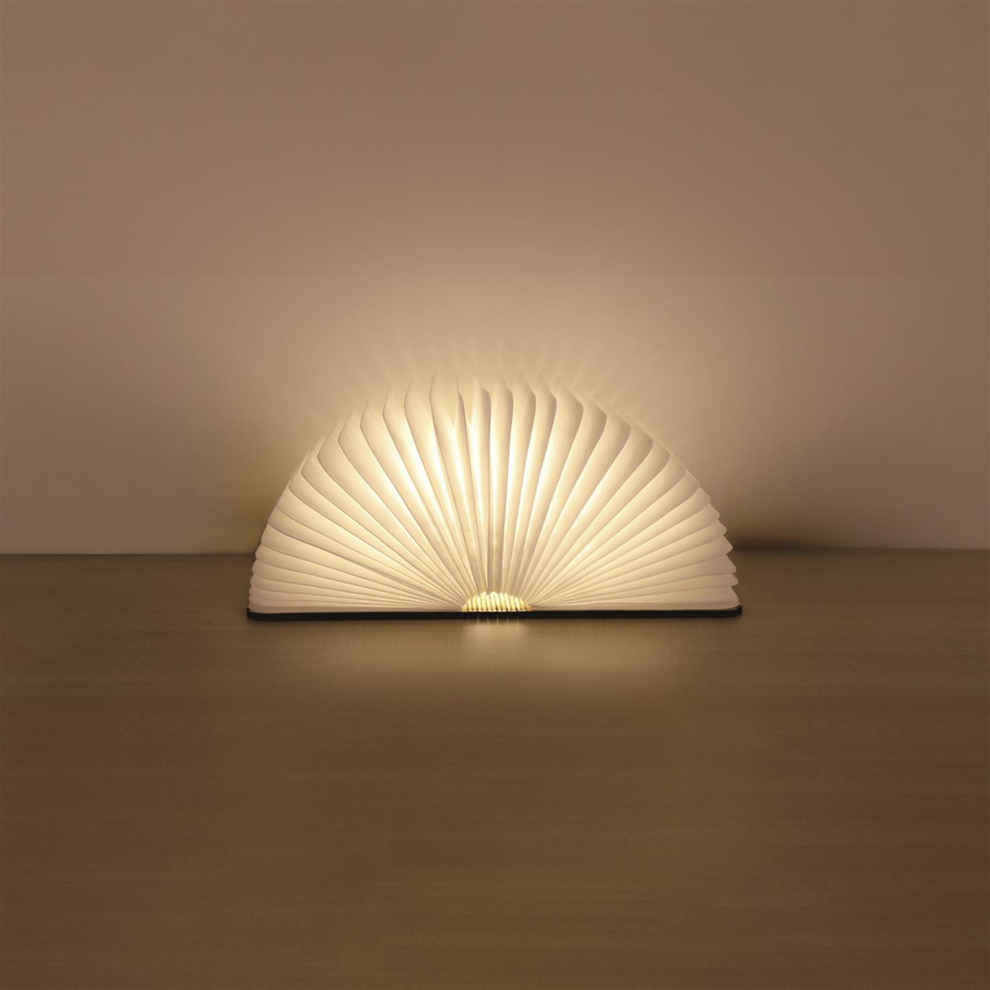 Lampada da tavolo cordless ricaricabile, a forma di libro pieghevole, con magneti per mantenere la forma a 360°, oppure per poterla attaccare su superfici in acciaio. Corpo della lampada in carta idrorepellente e scocca esterna in legno di noce. Luce LED calda, si accende aprendo la lampada e si spegne chiudendola. Dimensioni da aperta Ø cm 23 x 16,5 chiusa 14,5 x 10 x h 2,5. Per uso interno. Batteria ricaricabile Li-ion 3.7V / 700mAh, porta USB-C con cavo di ricarica incluso. Potenza 2.5 W, input voltaggio DC5-12V, IP 20. Ricarica in 2/3 ore, autonomia fino a 3/5 ore. Temperatura ottimale di utilizzo -20º / 45º C