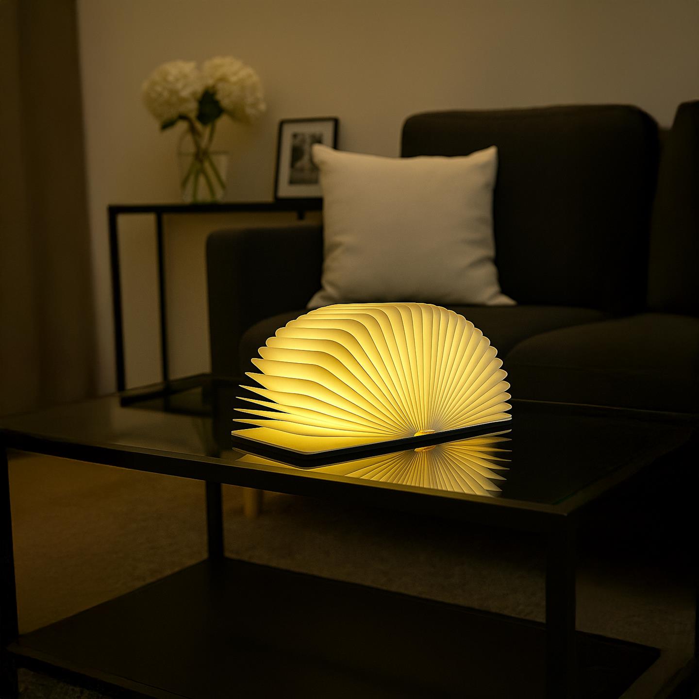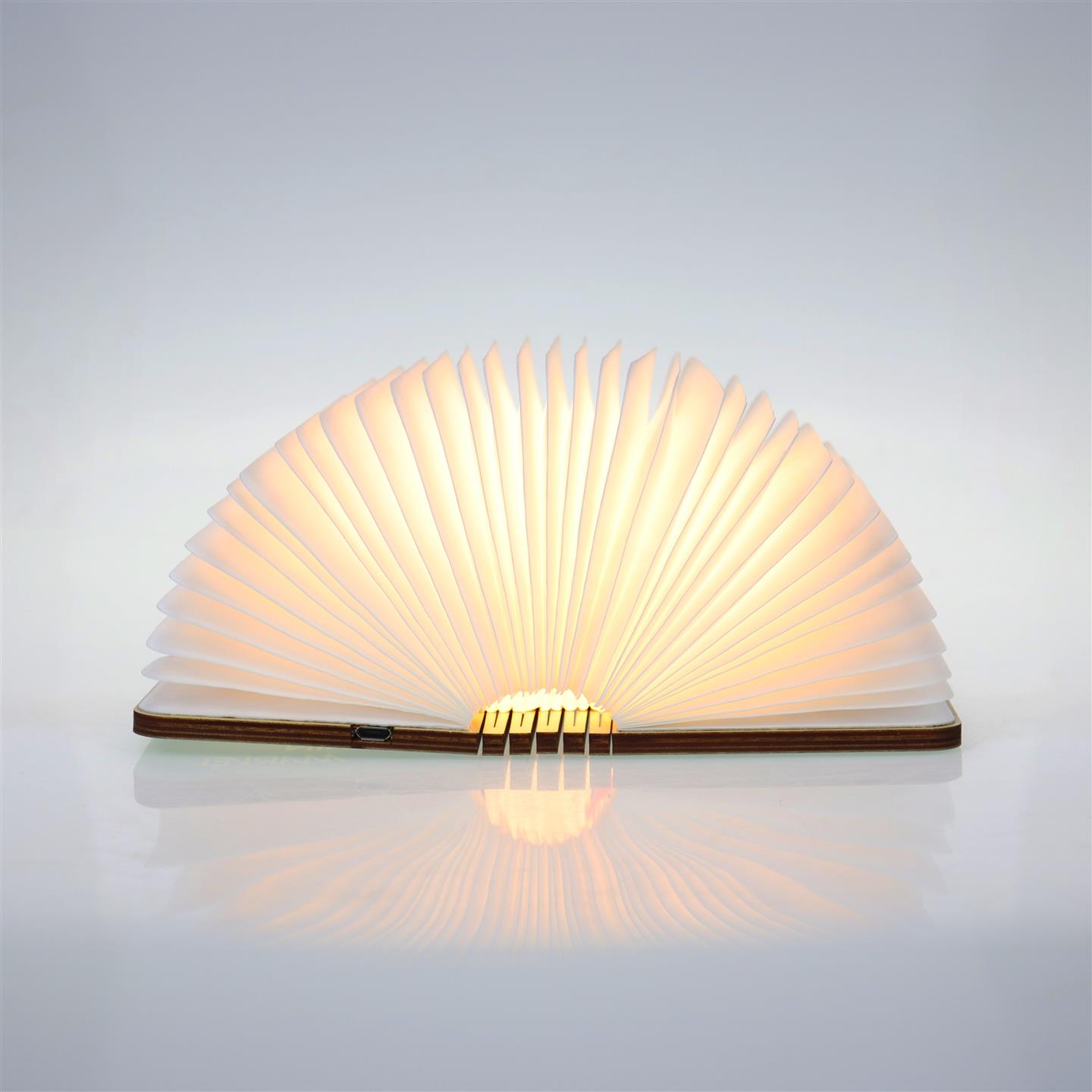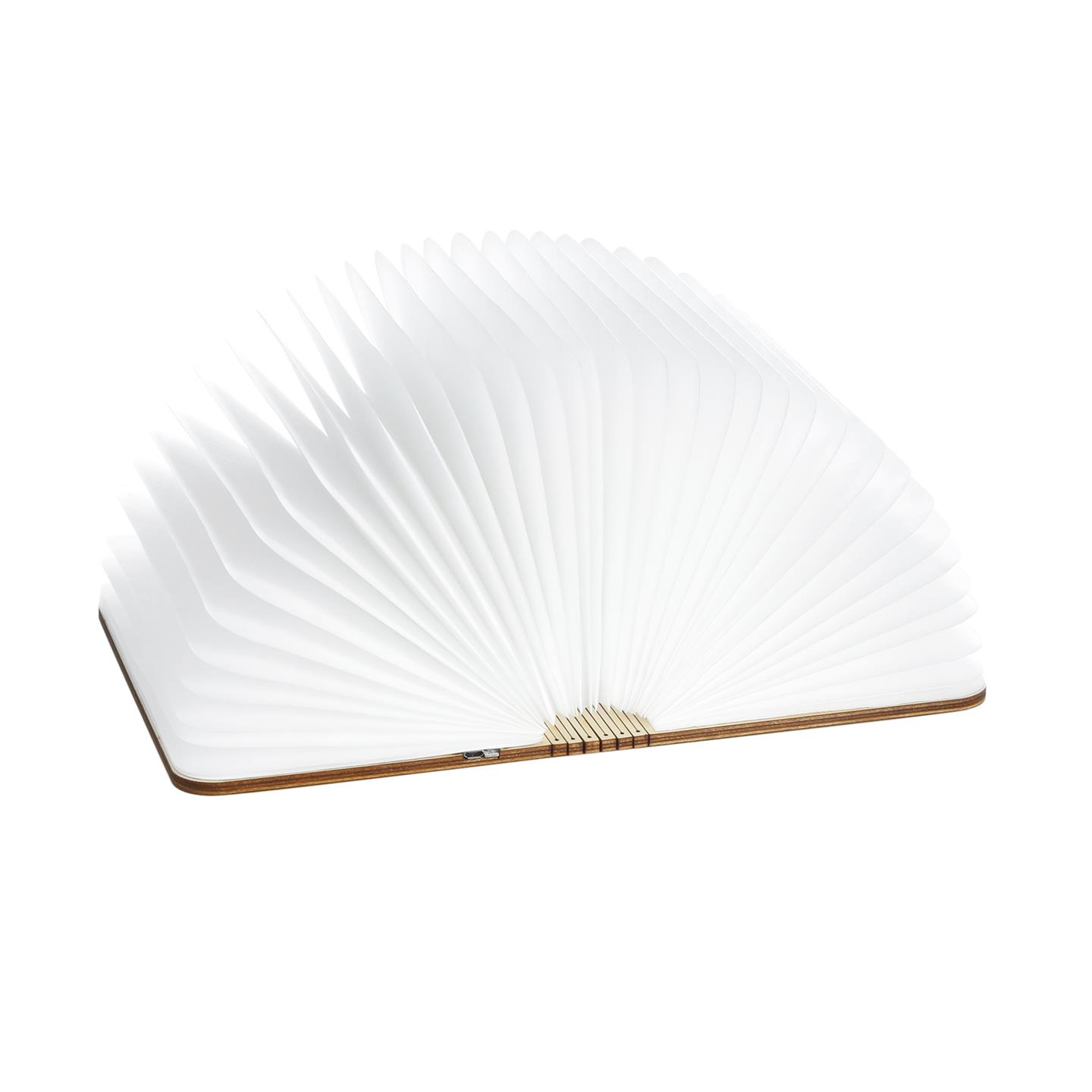 Lampada da tavolo cordless ricaricabile, a forma di libro pieghevole, con magneti per mantenere la forma a 360°, oppure per poterla attaccare su superfici in acciaio. Corpo della lampada in carta idrorepellente e scocca esterna in legno di noce. Luce LED calda, si accende aprendo la lampada e si spegne chiudendola. Dimensioni da aperta Ø cm 23 x 16,5 chiusa 14,5 x 10 x h 2,5. Per uso interno. Batteria ricaricabile Li-ion 3.7V / 700mAh, porta USB-C con cavo di ricarica incluso. Potenza 2.5 W, input voltaggio DC5-12V, IP 20. Ricarica in 2/3 ore, autonomia fino a 3/5 ore. Temperatura ottimale di utilizzo -20º / 45º C