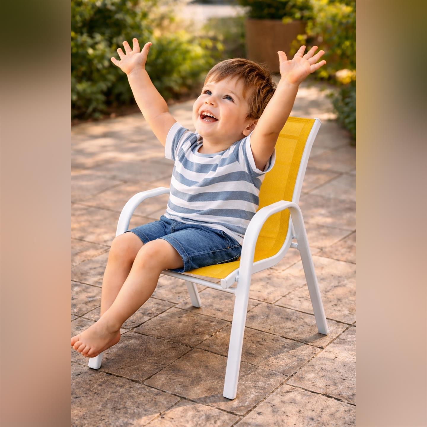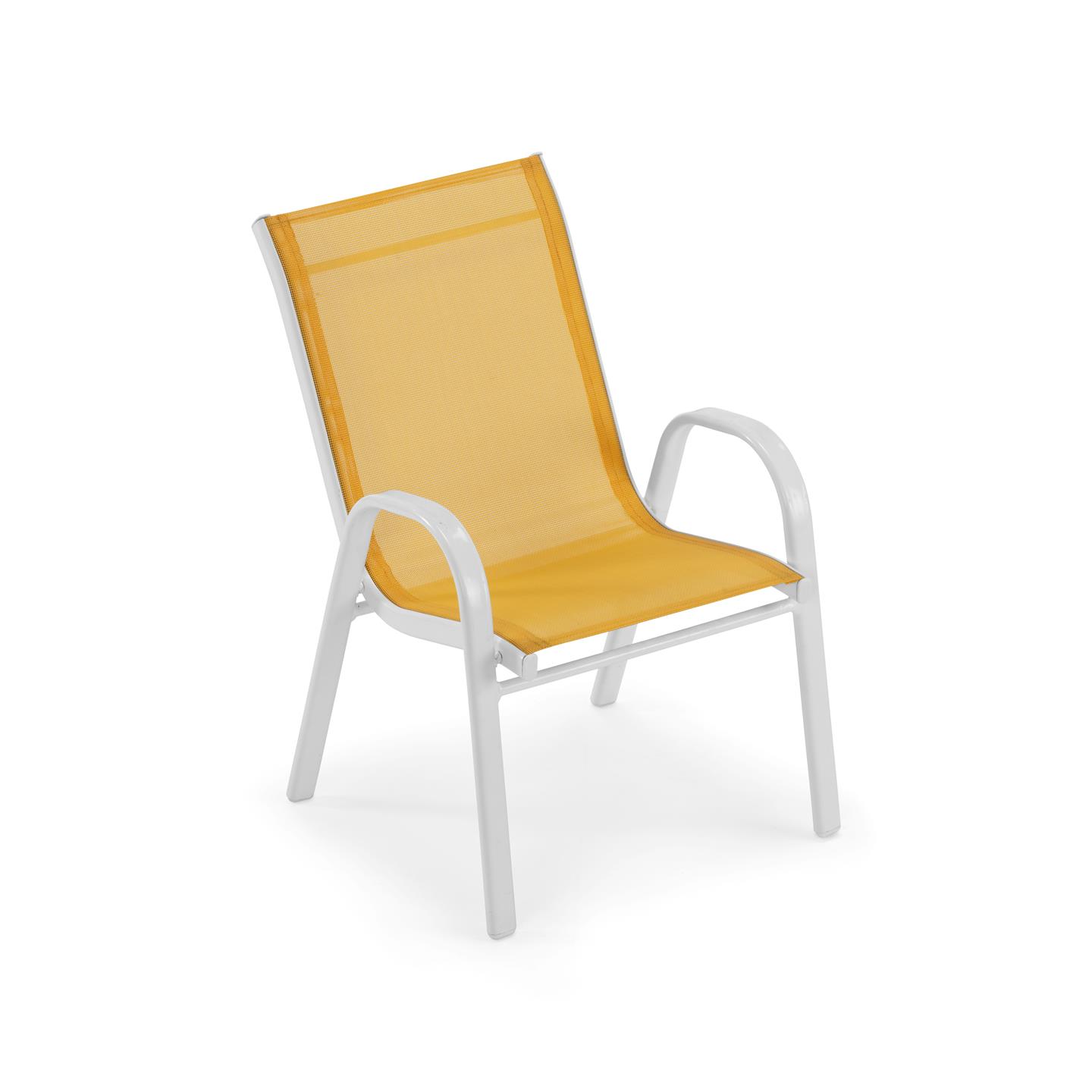 Stapelstuhl, weiß pulverbeschichtete Eisenstruktur, Textilene-Stoff 1X1, rot und gelb (sortiert), Abm. 45X39X58 cm, Gestellrohre 30X15X0.8 mm / 27X15X1.0 mm.