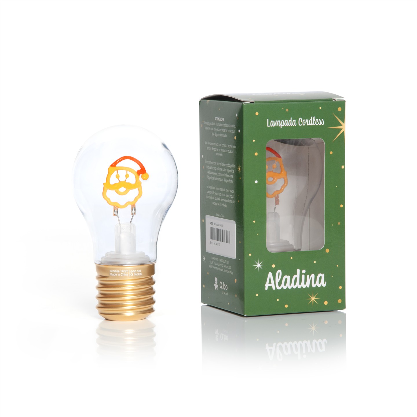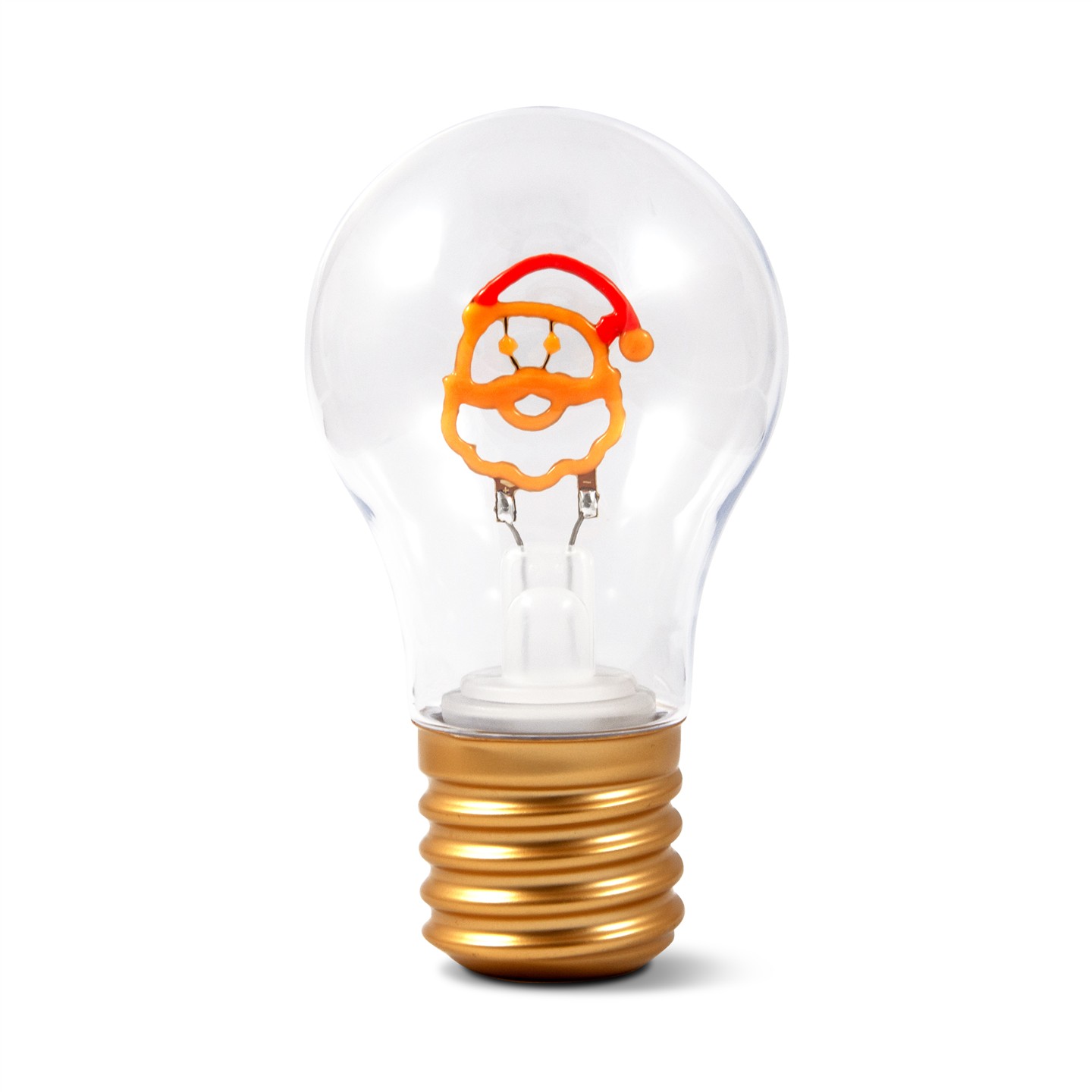 Decorative table lamp, cordless and rechargeable. Internal LED filament, shaped like Christmas characters. 3 light intensities: 100% – 70% – 0/100% button. Lamp with plastic bulb and metal base. Dimensions: Ø 7 cm X 12.5 cm base Ø 4 cm. For indoor use. Built-in rechargeable Li-ion battery 3.7V / 300 mAh, USB Type-C port, 30 cm cable included. Power 0.2 W, nominal voltage 5V DC 1A. Charging in 1-2 hours, battery life up to 6-8 hours. Optimal operating temperature -20º / 45º C