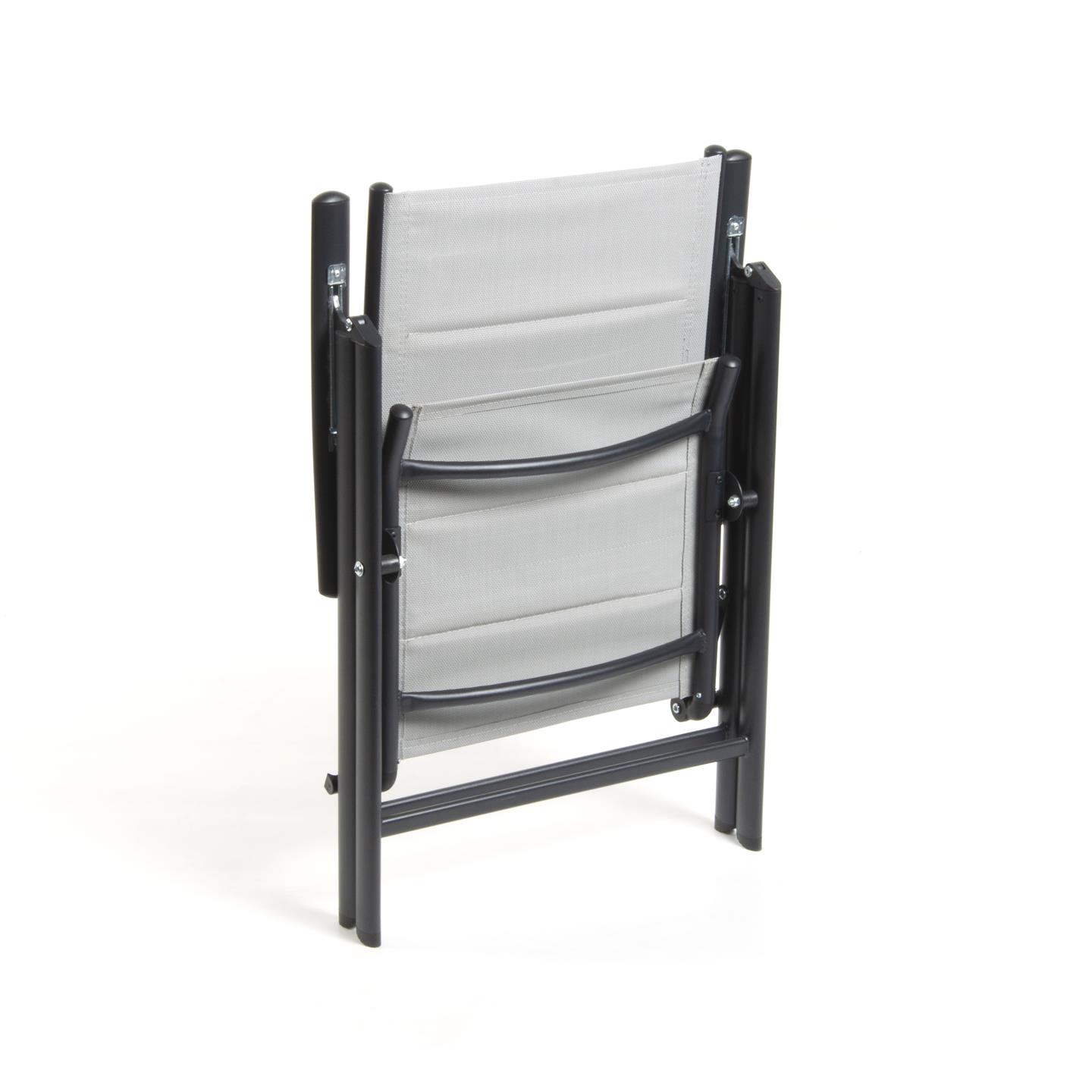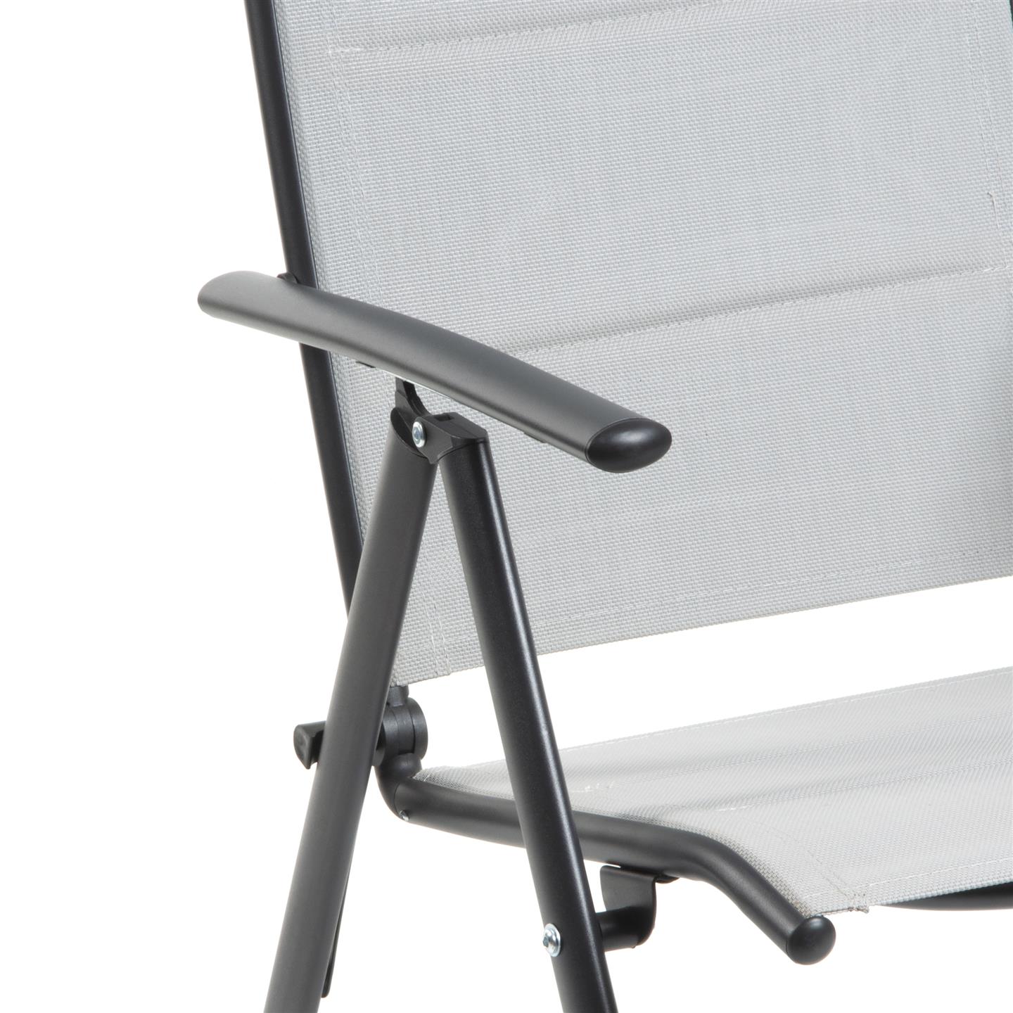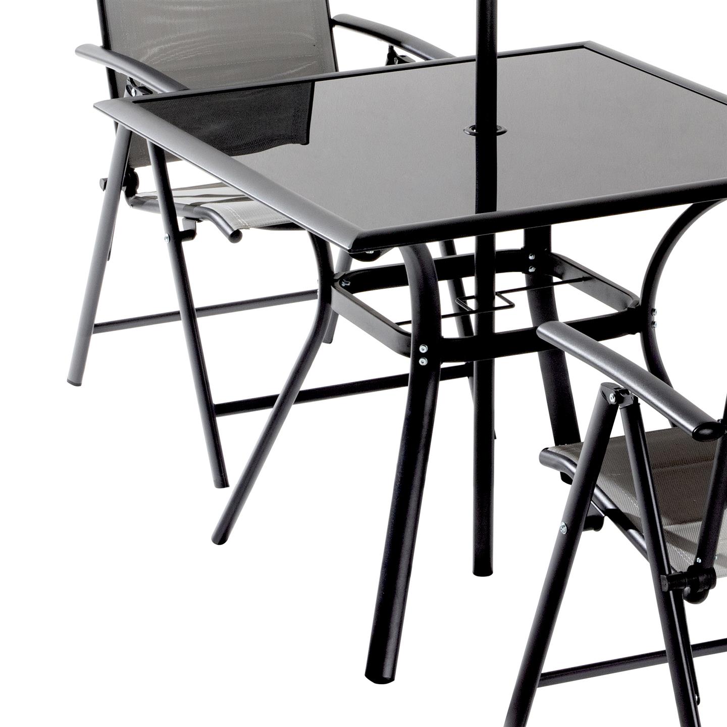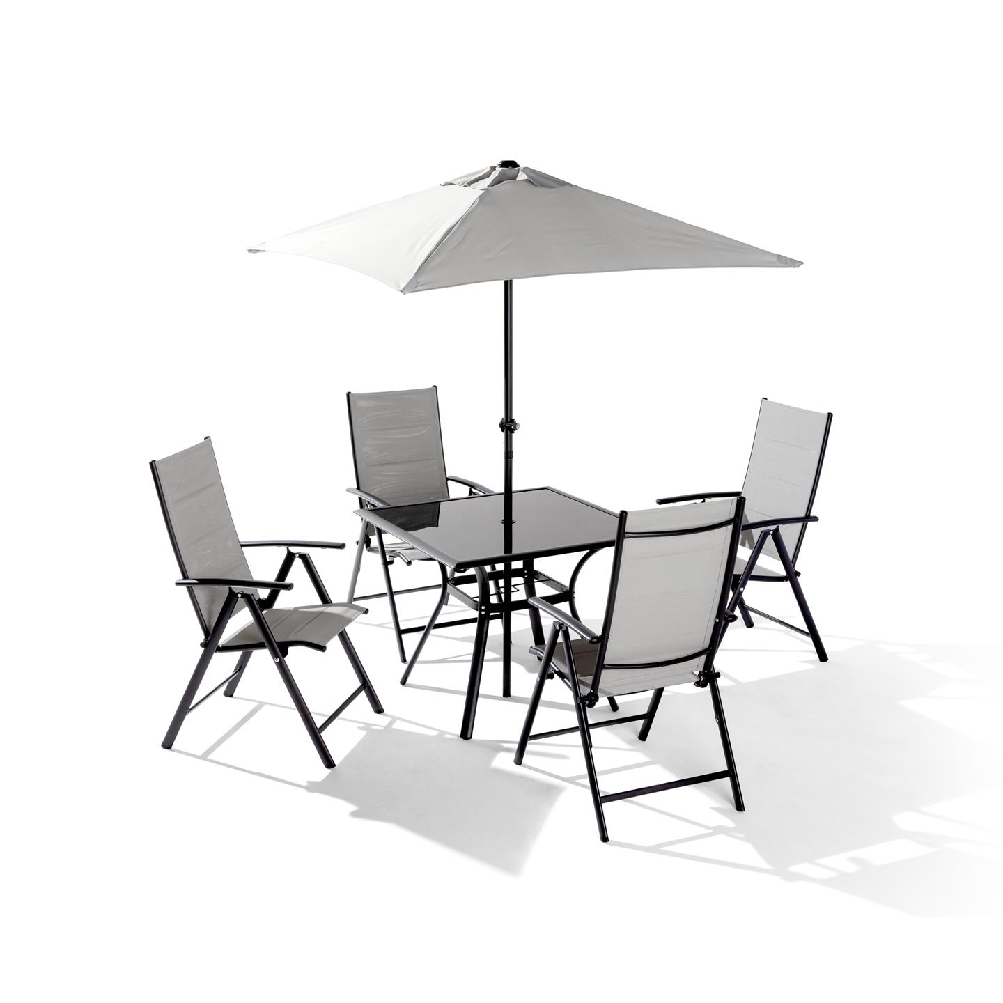 Set table + 4 folding chairs with reclining back, 7 positions with armrests + 150X150 umbrella with crank (BASE NOT INCLUDED). Gray polyester umbrella fabric g 140/m², black powder coated steel chair structure (matt finish), gray 2X1 textilene fabric padded with polyurethane foam, cm 68 X 55 X 105, sec. tubular mm 40 X 22 / Ø mm 25. Table cm 90 X 90 X h72 legs in black powder coated steel (matt finish), top support in aluminum section. 47 X 18 / 45 X 25 mm, top in 5 mm black tempered glass with Ø 43 mm hole for umbrella.