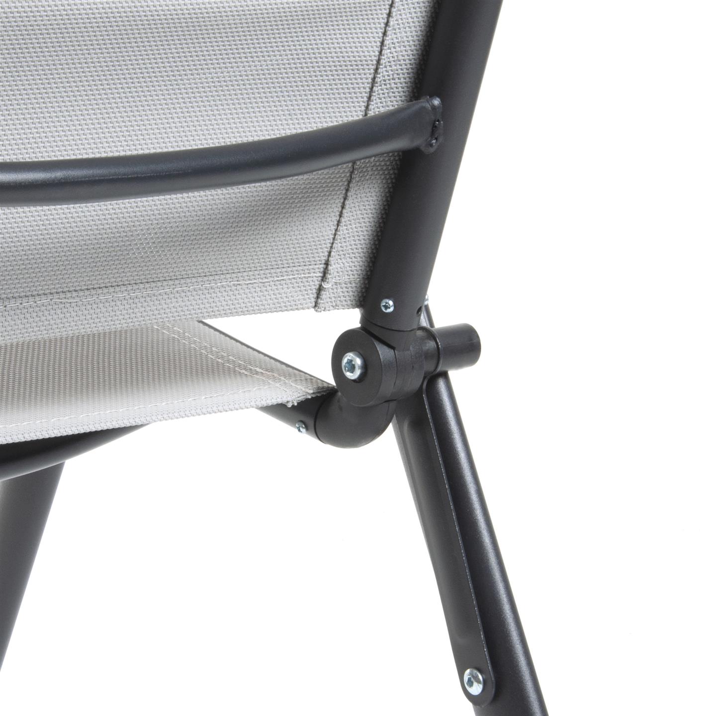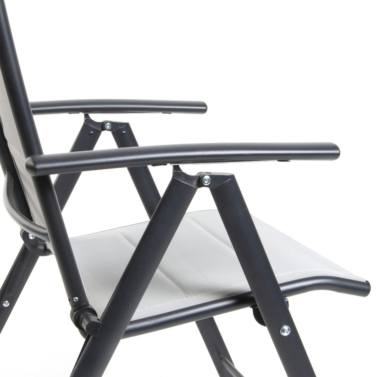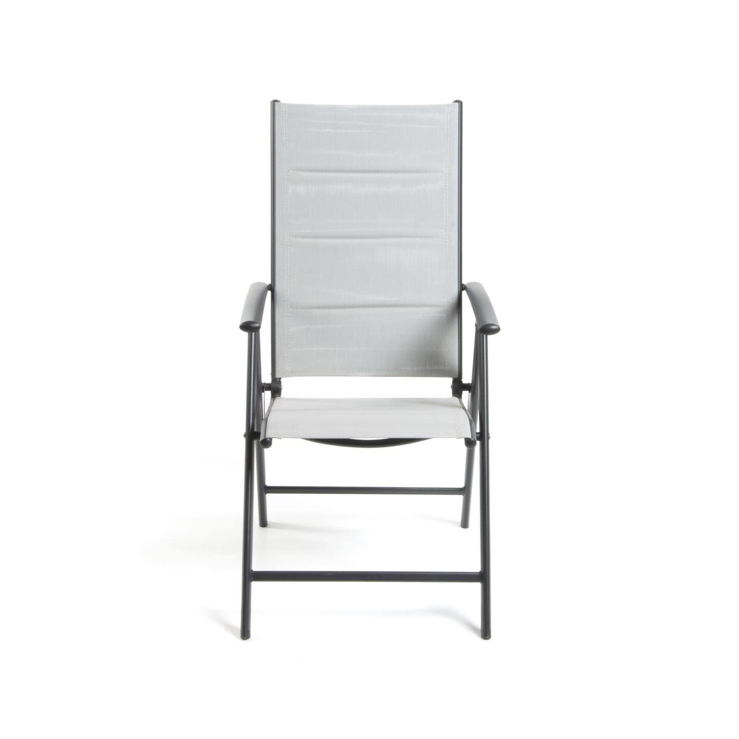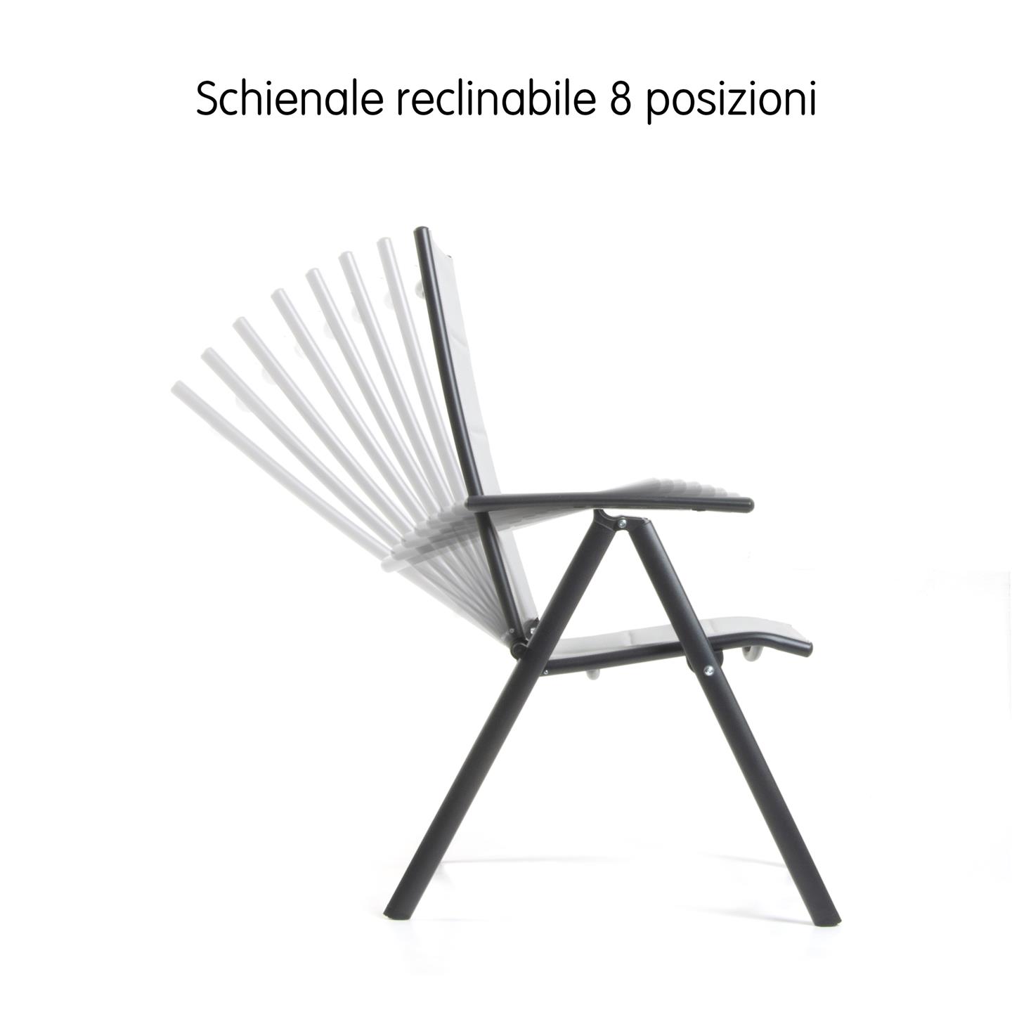 Set table + 4 folding chairs with reclining back, 7 positions with armrests + 150X150 umbrella with crank (BASE NOT INCLUDED). Gray polyester umbrella fabric g 140/m², black powder coated steel chair structure (matt finish), gray 2X1 textilene fabric padded with polyurethane foam, cm 68 X 55 X 105, sec. tubular mm 40 X 22 / Ø mm 25. Table cm 90 X 90 X h72 legs in black powder coated steel (matt finish), top support in aluminum section. 47 X 18 / 45 X 25 mm, top in 5 mm black tempered glass with Ø 43 mm hole for umbrella.