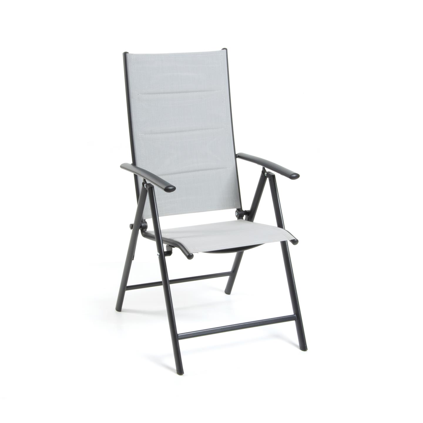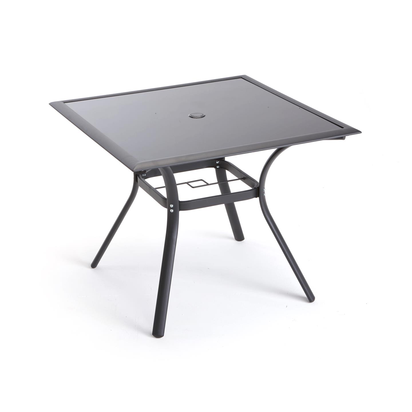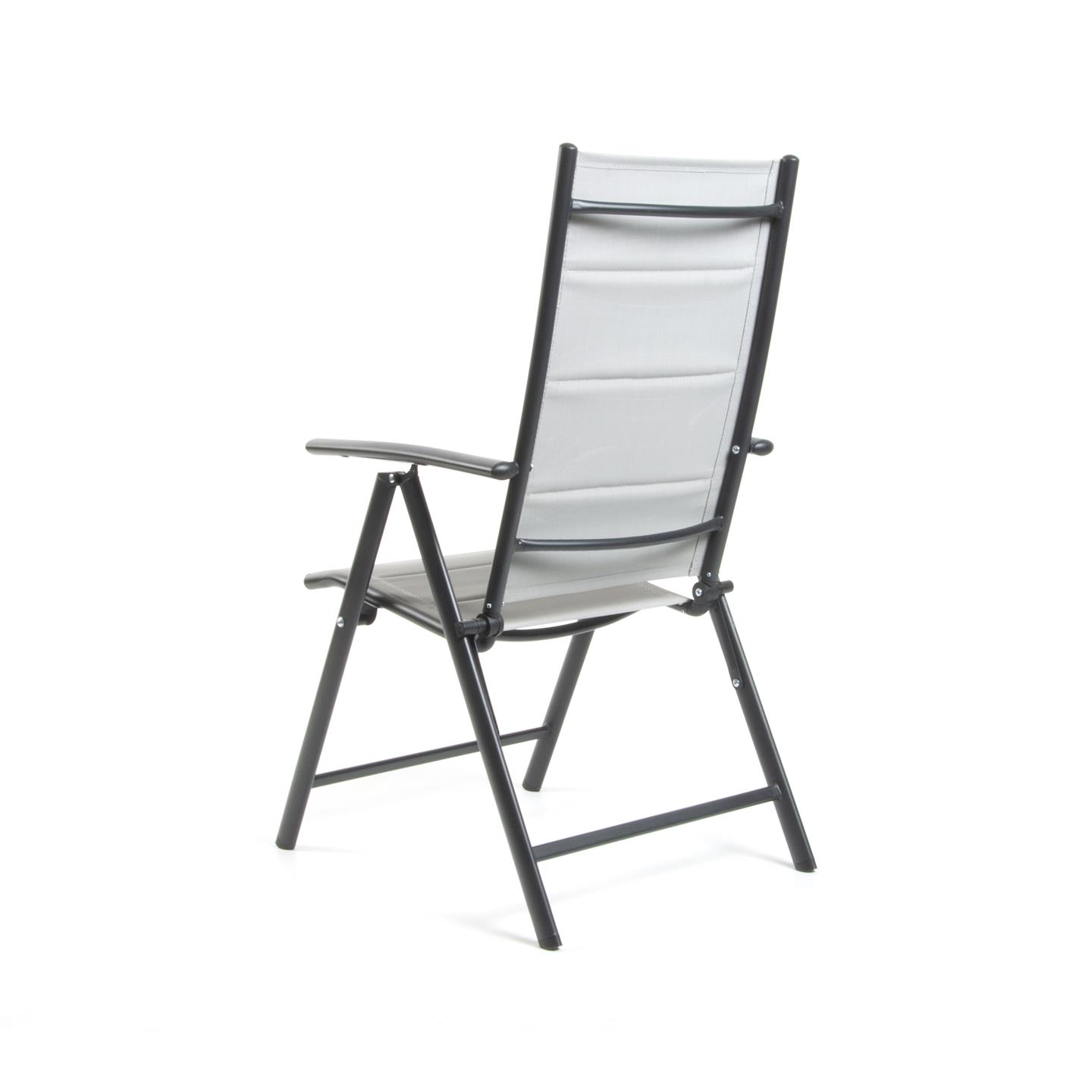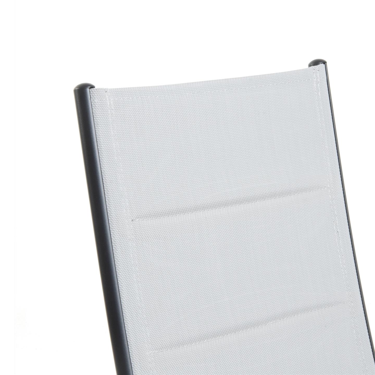 Set table + 4 folding chairs with reclining back, 7 positions with armrests + 150X150 umbrella with crank (BASE NOT INCLUDED). Gray polyester umbrella fabric g 140/m², black powder coated steel chair structure (matt finish), gray 2X1 textilene fabric padded with polyurethane foam, cm 68 X 55 X 105, sec. tubular mm 40 X 22 / Ø mm 25. Table cm 90 X 90 X h72 legs in black powder coated steel (matt finish), top support in aluminum section. 47 X 18 / 45 X 25 mm, top in 5 mm black tempered glass with Ø 43 mm hole for umbrella.