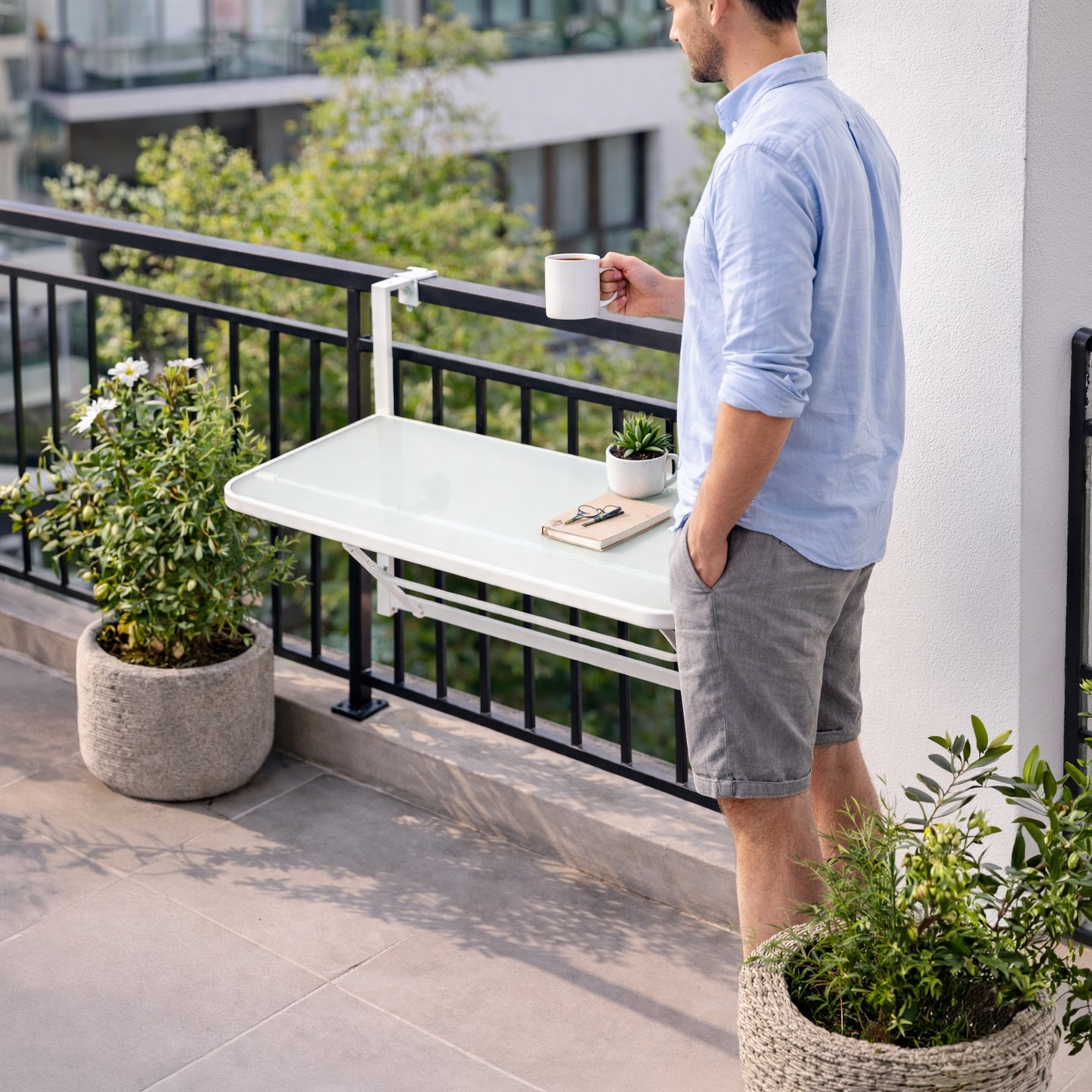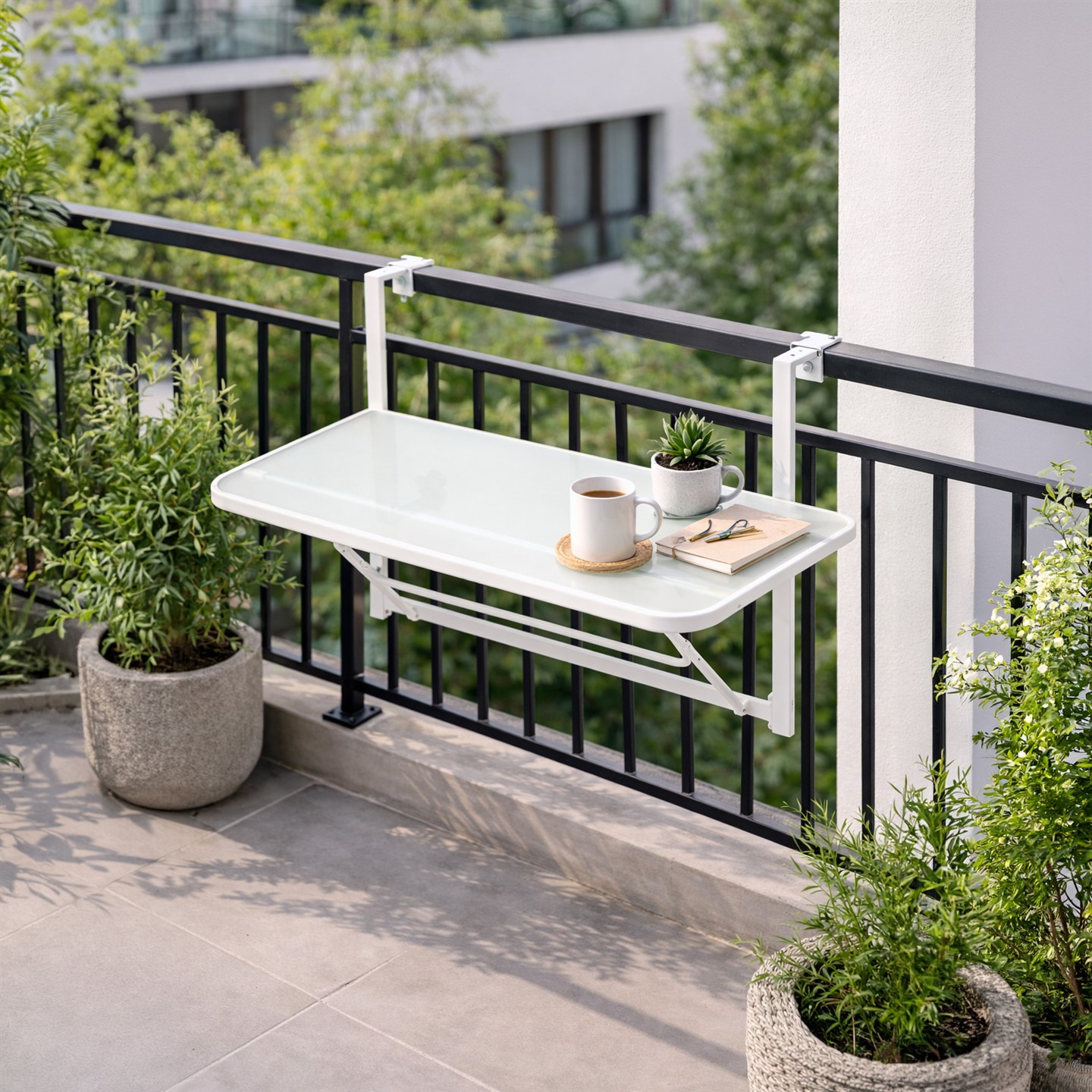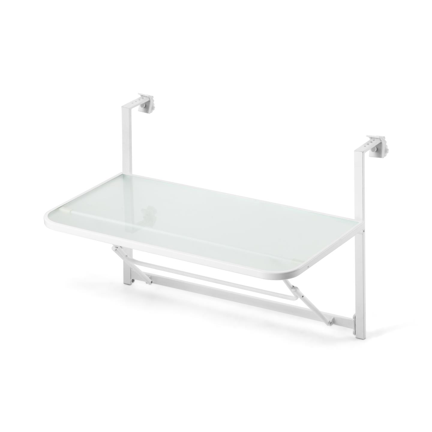Folding console table for terraces, white powder coating steel structure, glass table top. cm 91.5 X 51