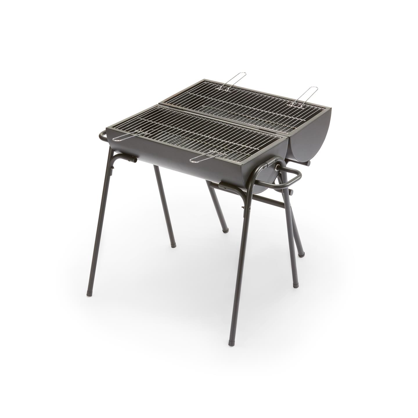 Double charcoal barbecue (2 in 1) with lid/oven (when using only one grill), handles, black powder coated steel structure, 2 chromed steel grids 60 X 29 X 4.3 mm with 2 removable handles. Overall dimensions cm 89.5 X 85.5 X h 72 (open), cooking grill height from the ground cm 71