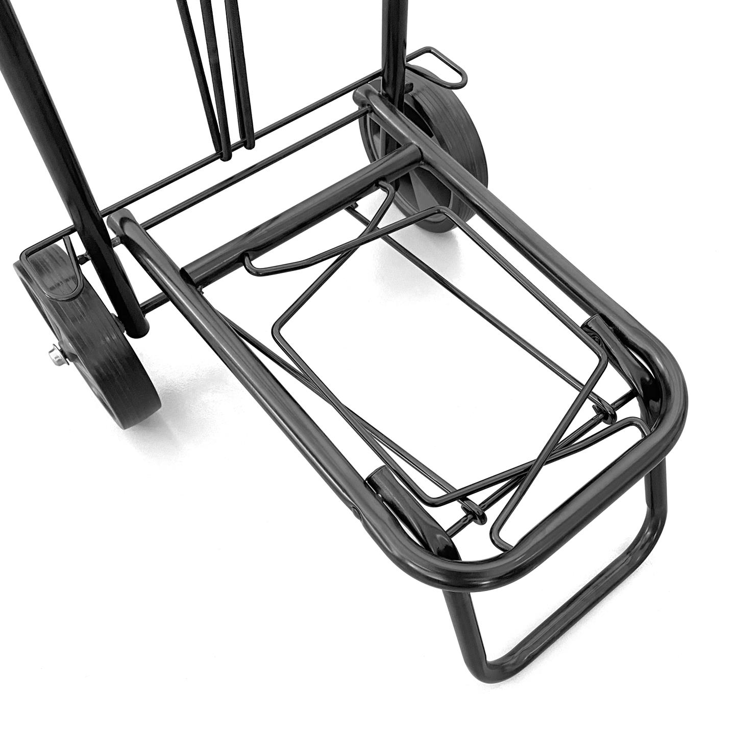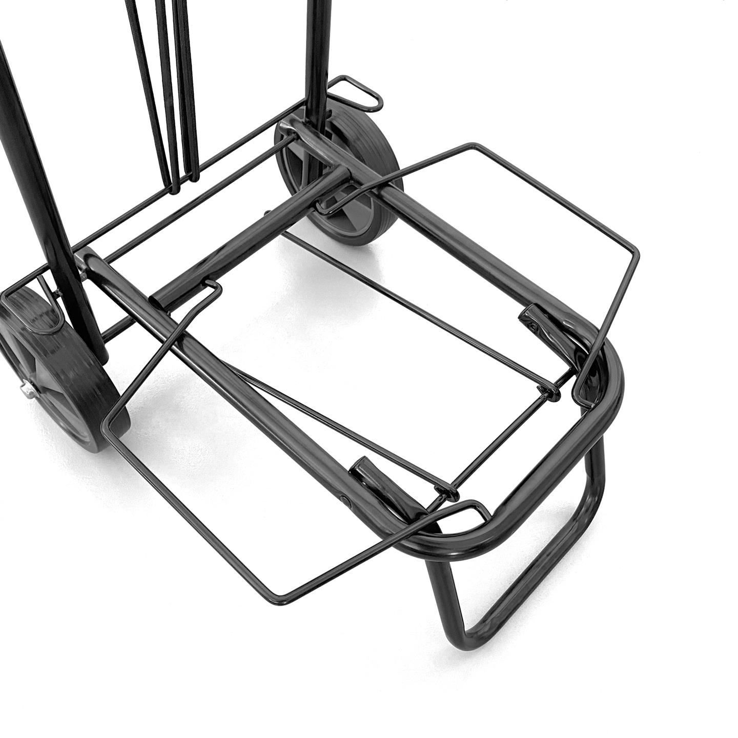 Carrello portapacchi pieghevole, compreso di elastico ferma pacchi con ganci, struttura in acciaio verniciato a polvere nero, tubolari telaio Ø mm 19 X 0.8, altezza totale da terra cm 97, piano di carico con alette pieghevoli cm 40,5 X 37 / 24 X 37 (con alette chiuse), altezza piano di carico da terra cm 18, ruote in gomma Ø cm 15 X 3.5 Ingombro da aperto cm 40,5 X 48 X h 97, chiuso cm 60 X 37 X h 15. Portata massima kg 40