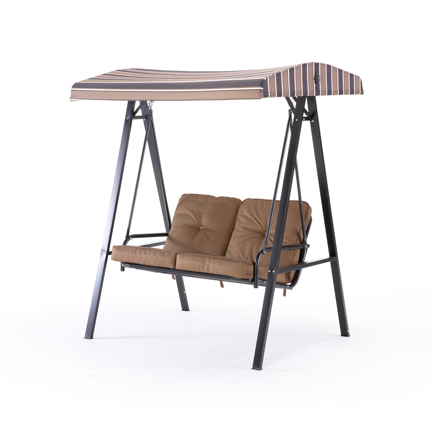 2-seater swing, black powder-coated steel structure (matte finish), seat and backrest fabric textilene 2 X 1 g 550/m² black color, polyester canopy fabric 180 g/m². light brown / dark striped color. Overall dimensions cm 145 X 106 X h 174, seat cm 102 X 48, backrest h cm 50, canopy cm 144 X 116, sect. legs 50 X 25/28 X 18/30 X 15 mm, poles seat and backrest Ø 28/19/14 mm