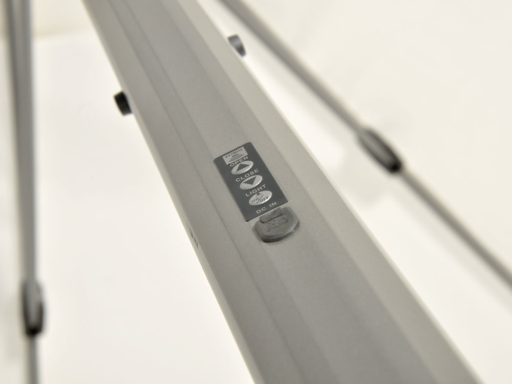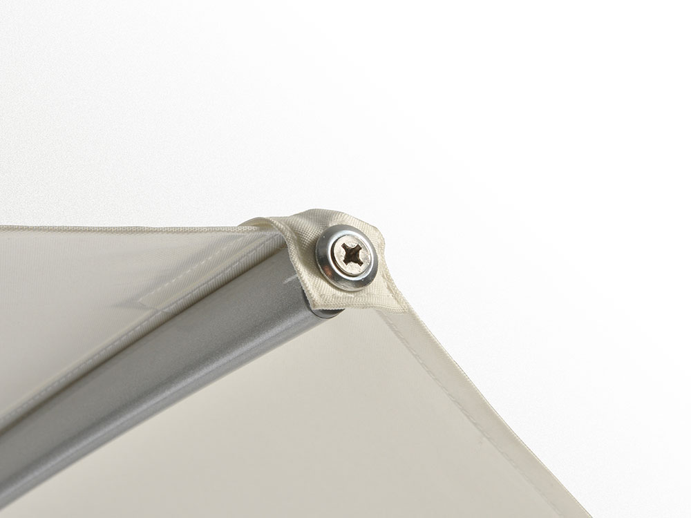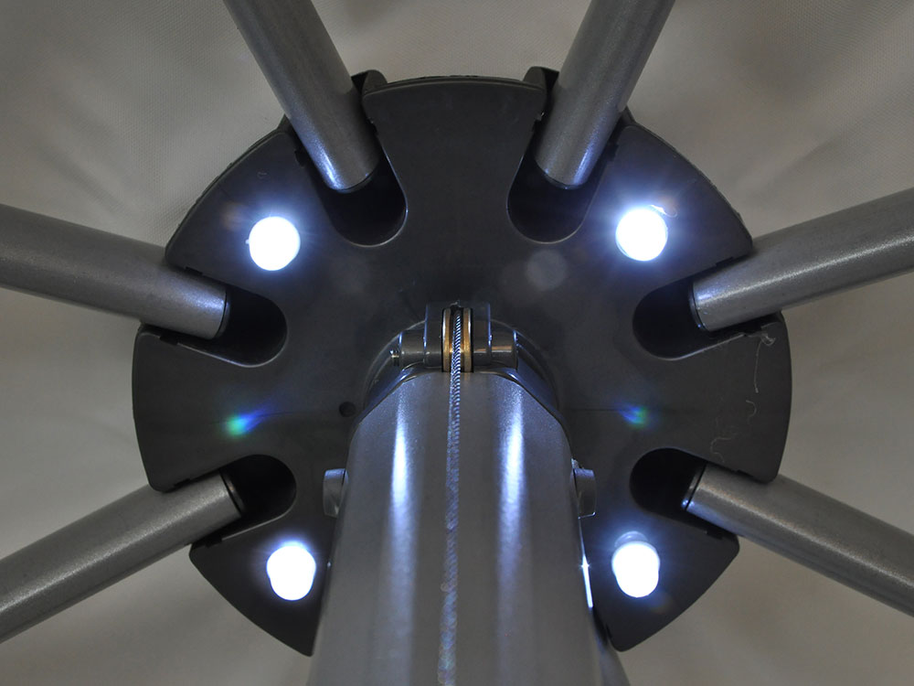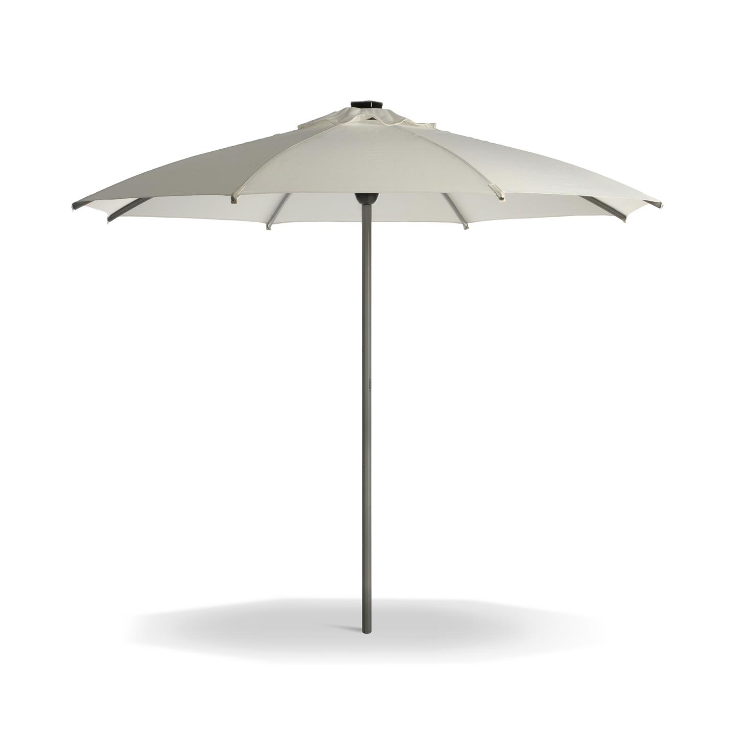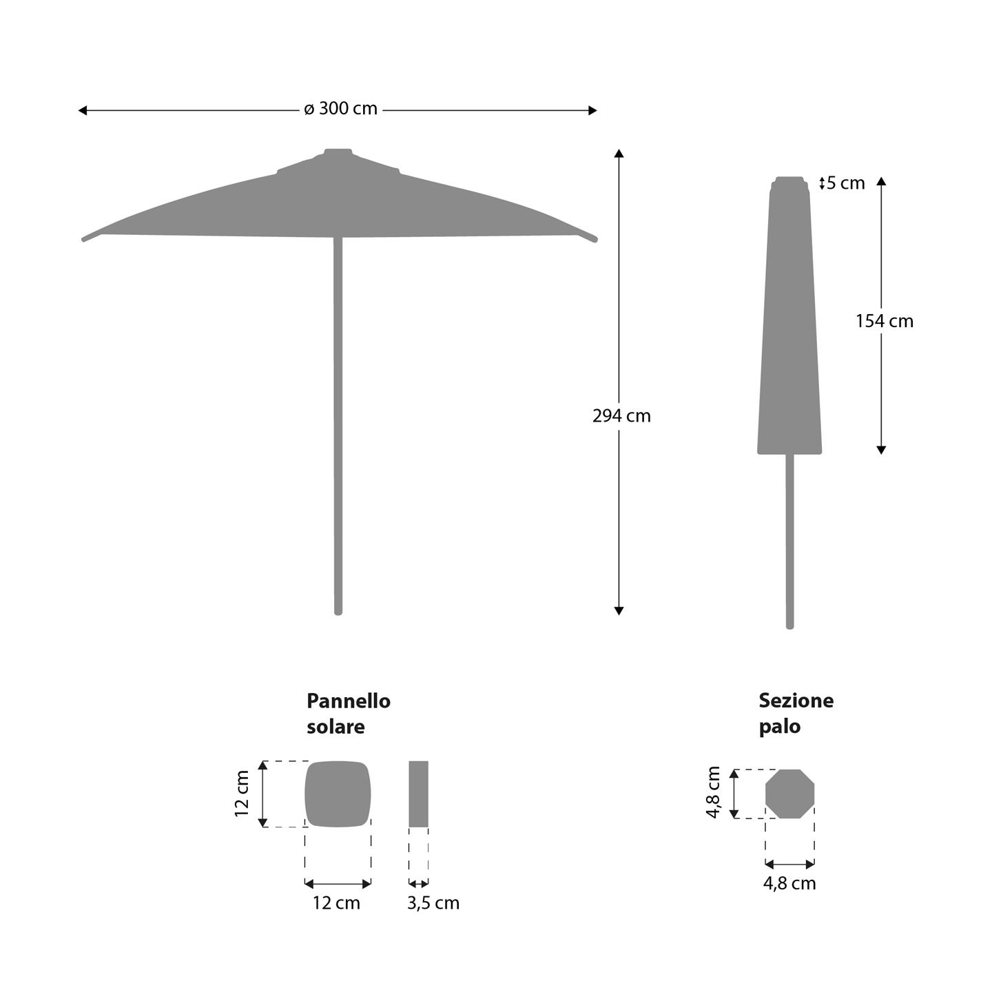 Round garden umbrella with electric opening/closing system, LED lights, integrated solar panel (keeps the battery charge for the opening/closing system and LED lights to function), remote control for opening/closing (battery not included). Structure in aluminum, 8 slats, polyester fabric g 250/m², dimensions Ø cm 300, sec. pole Ø mm 48, sec. slats mm 28 X 16 / 25 X 13.