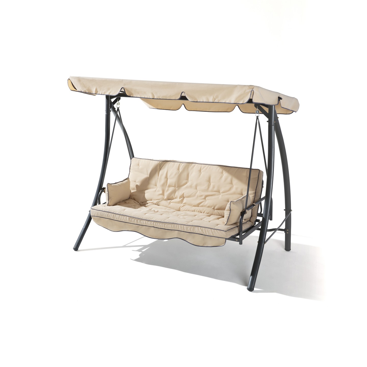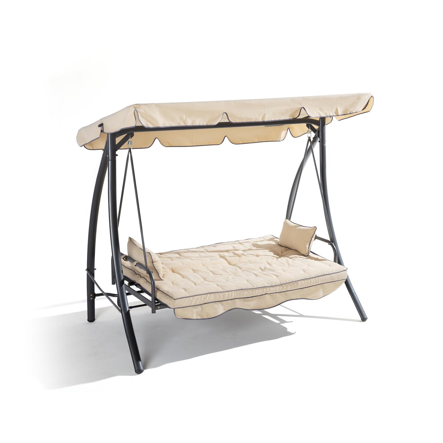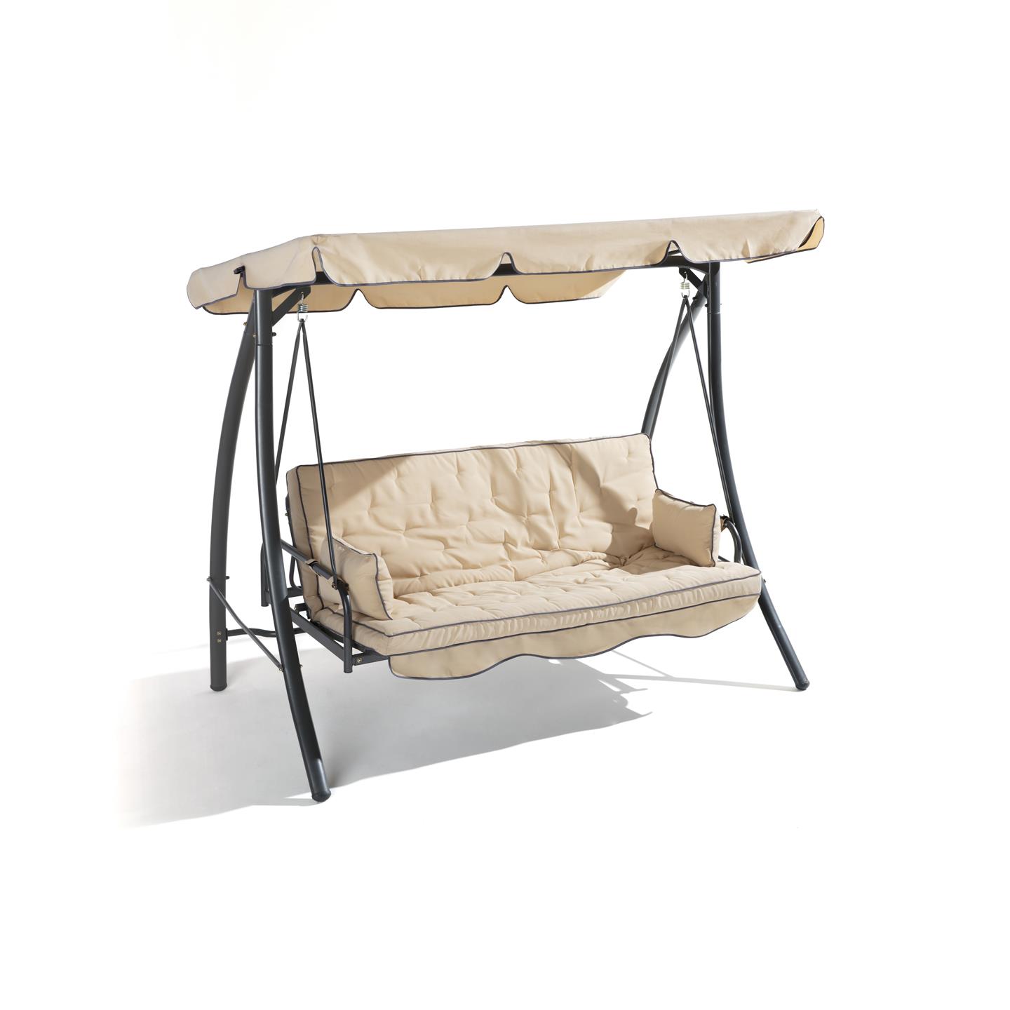 3-seater swing with reclining backrest, dark gray powder coating steel structure, beige polyester 180 g/sqm, 2 dark gray cushions. Dimensions cm 203 X 115 X h 170, seat cm 168 X 54, backrest h cm 55 , Beige canopy cm198 X 115, legs mm 62 X 38 X 1.0, seat and back poles ø mm 28.6 X 1.2, roof poles ø mm 18 X 0.8, weight kg 38.7