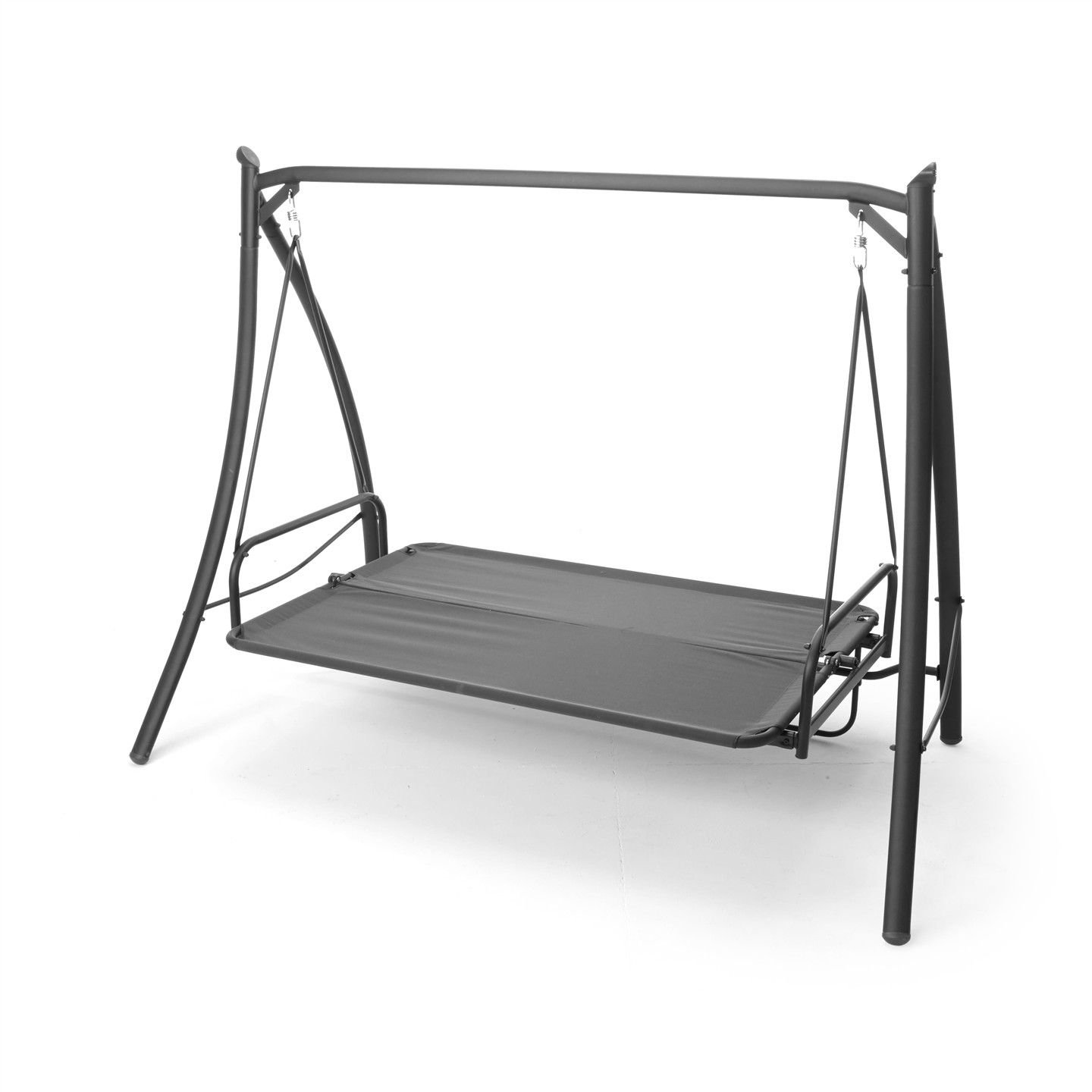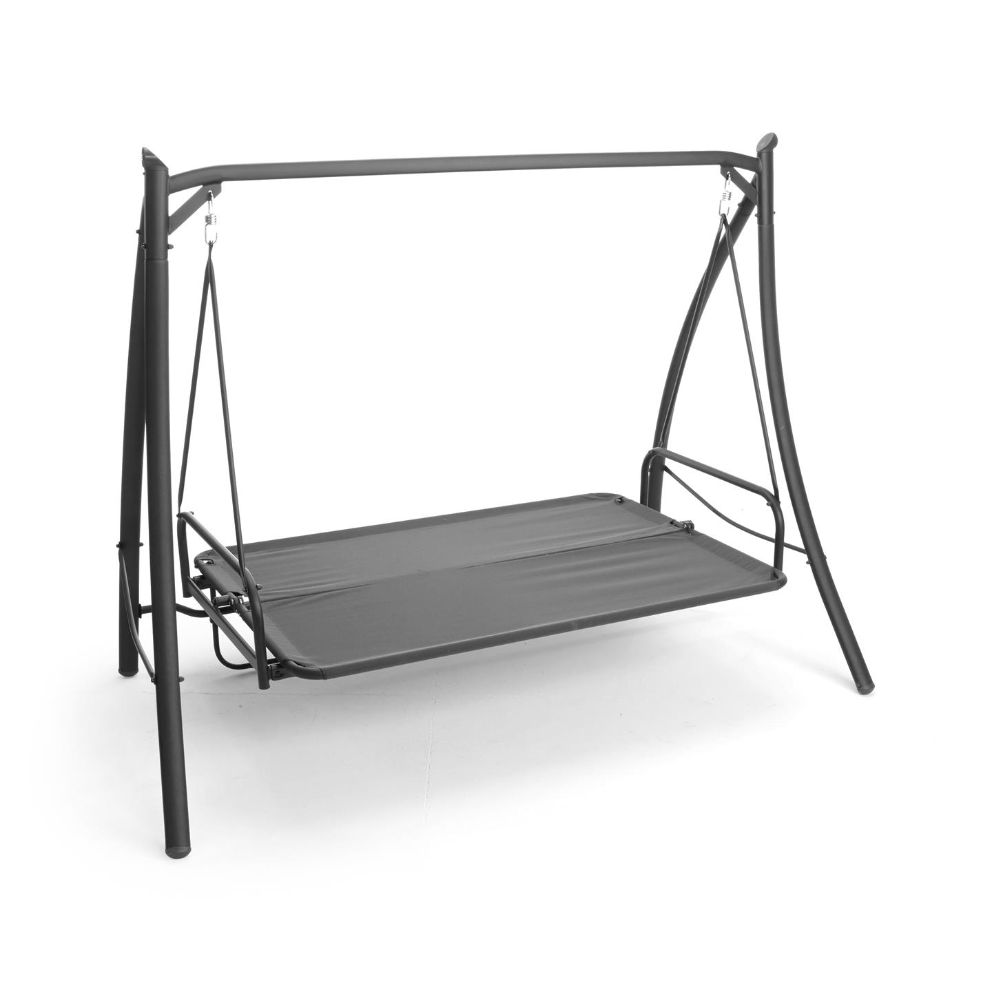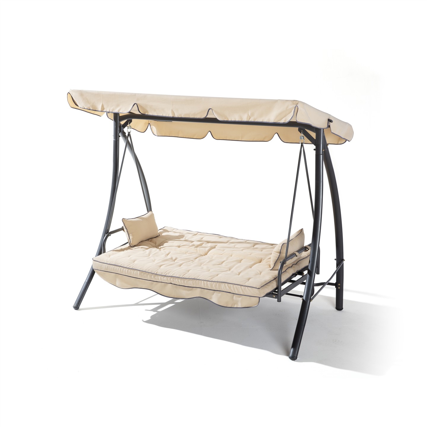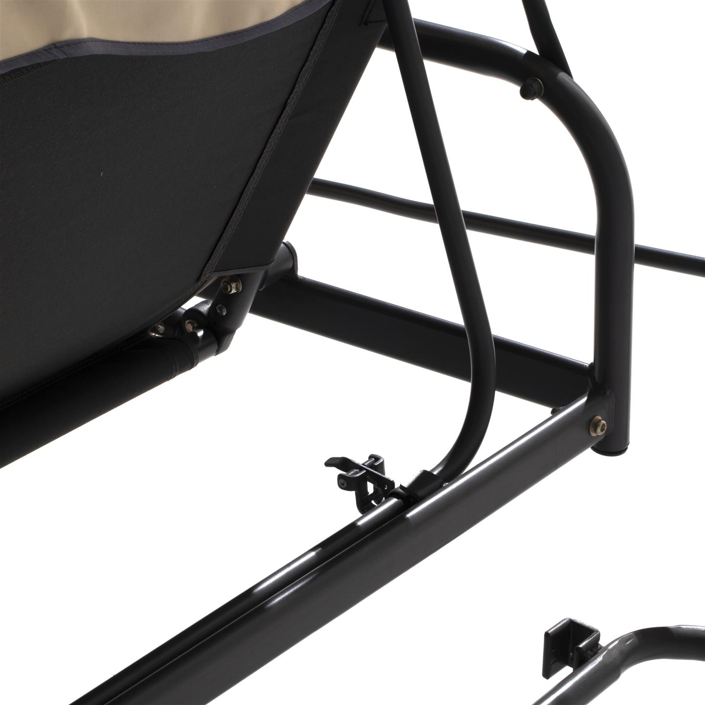3-seater swing with reclining backrest, dark gray powder coating steel structure, beige polyester 180 g/sqm, 2 dark gray cushions. Dimensions cm 203 X 115 X h 170, seat cm 168 X 54, backrest h cm 55 , Beige canopy cm198 X 115, legs mm 62 X 38 X 1.0, seat and back poles ø mm 28.6 X 1.2, roof poles ø mm 18 X 0.8, weight kg 38.7