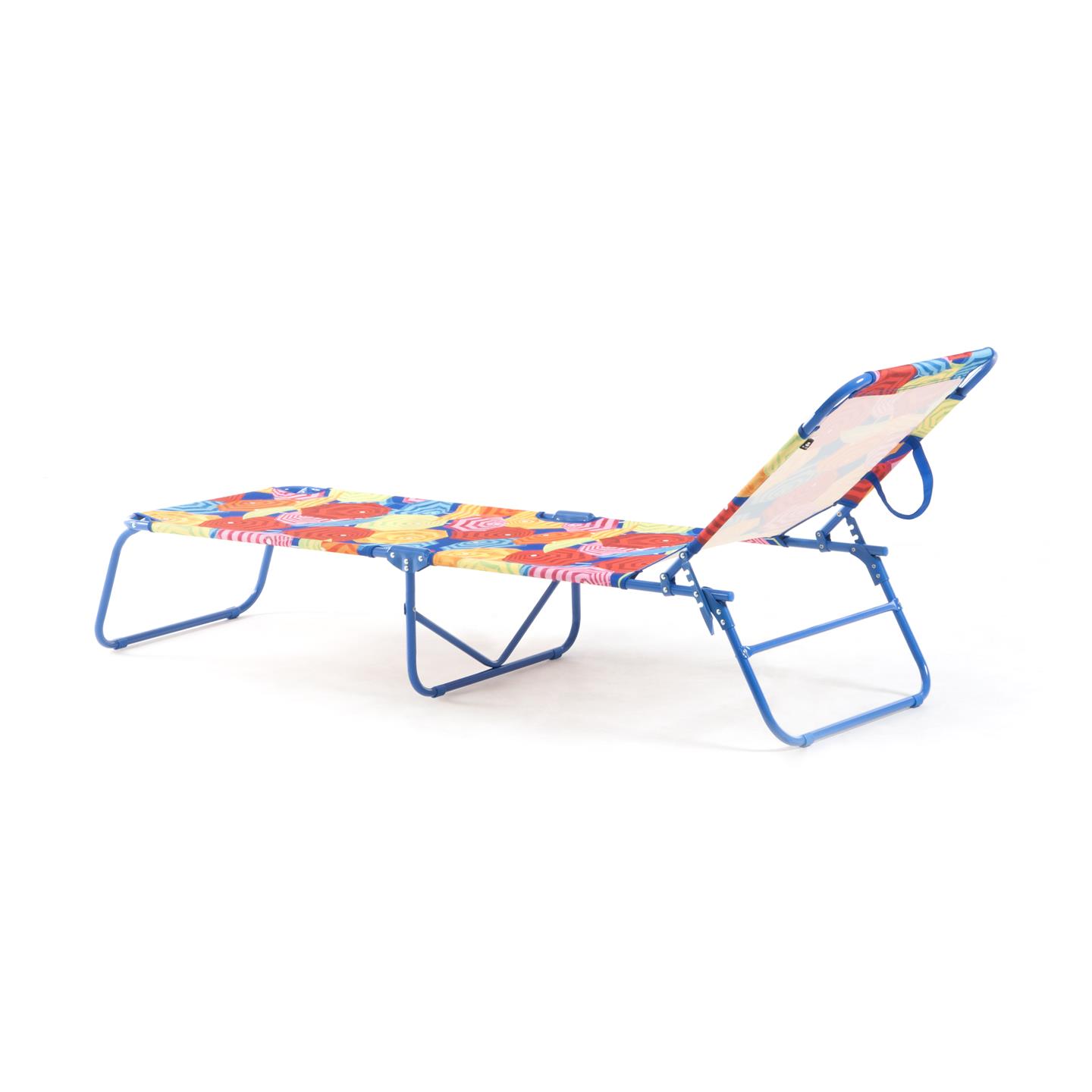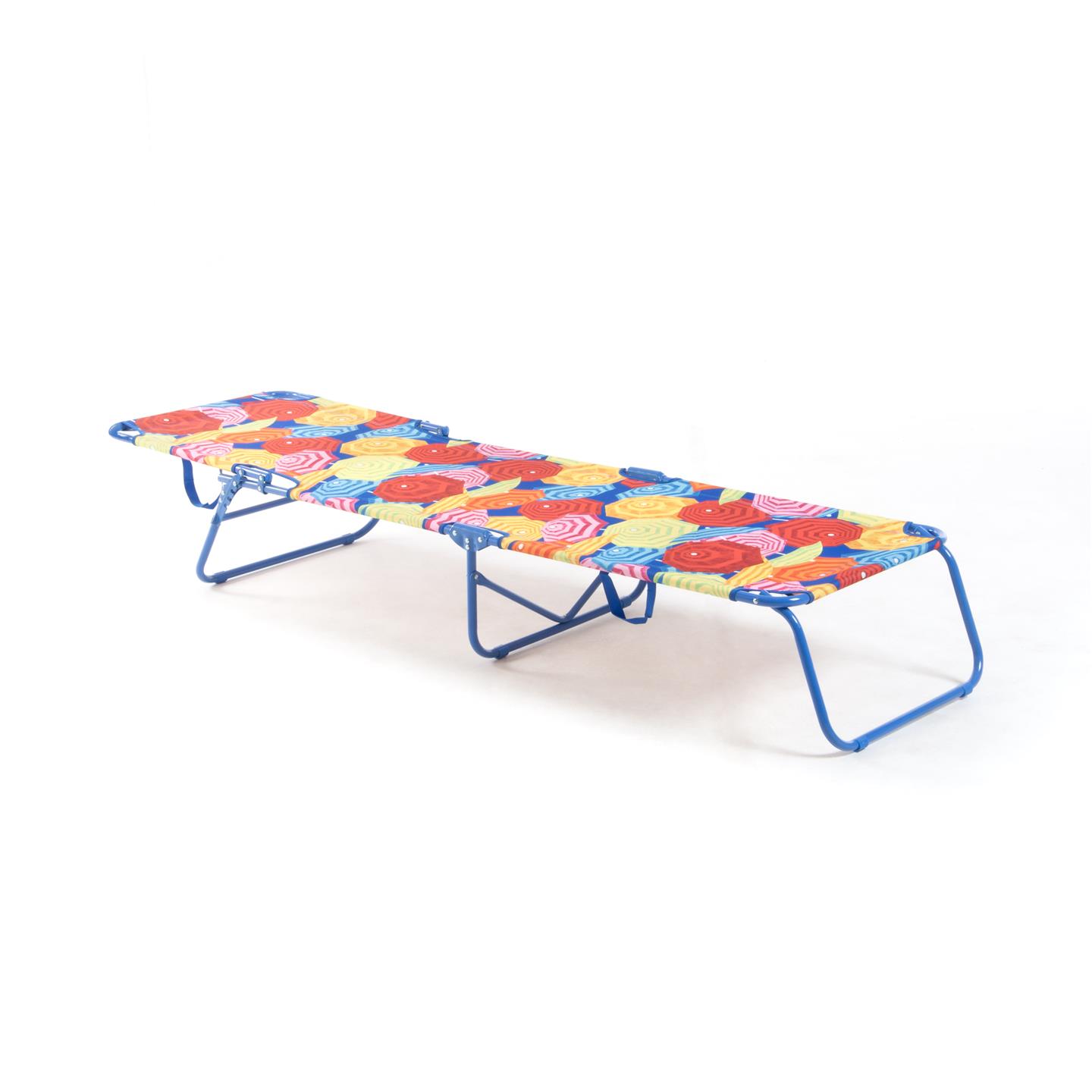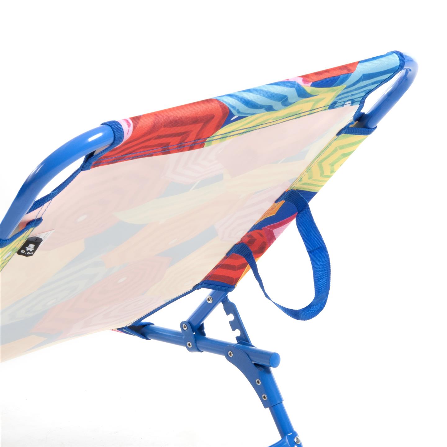 Brandina pieghevole con schienale reclinabile 4 posizioni e maniglie per trasporto. Struttura in acciaio verniciata a polvere blu, tessuto poliestere 600D X 300D trama Oxford spalmato PVC, cm 189 X 58 X h 27 sez. tubolari Ø mm 19 X 1.0