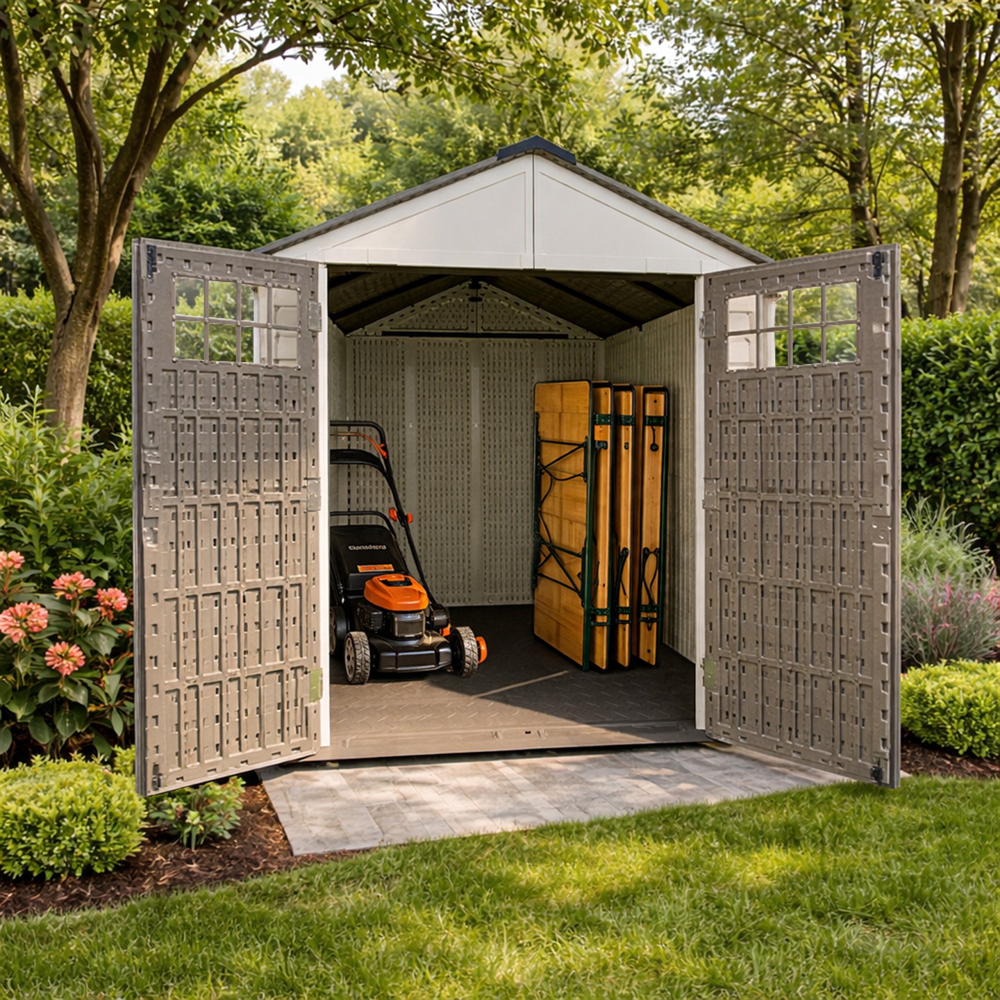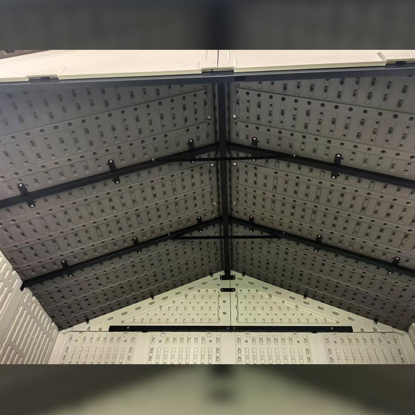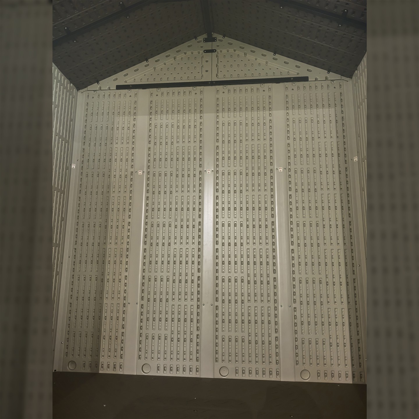 Casetta porta attrezzi in HDPE (Polietilene alta densità) colore grigio/marrone scuro, materiale resistente agli agenti atmosferici, composta da 3 pareti cieche e 1 con accesso frontale con finestre (non apribili), porta a 2 ante cm 138 X h 197 (dimensione totale porta) dotata di maniglia e chiavistello in metallo. Dimensioni esterne cm 210 lato accesso X 213 X h 252 (mq. 4.47). Struttura portante del tetto in acciaio verniciato a polvere, dimensioni profili struttura portante del tetto cm 105,5 X 2,5 X 2,5, montanti pannelli pareti e angolari in alluminio verniciato a polvere in tinta con i pannelli, dimensioni pannelli HDPE pareti cm 200 X 47 spessore mm 20, dimensioni pannelli HDPE tetto cm 115,5 X 58 spessore mm 31, montanti pareti cm 199,5 X 80 spessore mm 20. Pavimento in HDPE marrone scuro antiscivolo, spessore pannelli pavimento mm 30 | Peso kg 150 | Peso imballo kg 170 | Prodotto da montare.