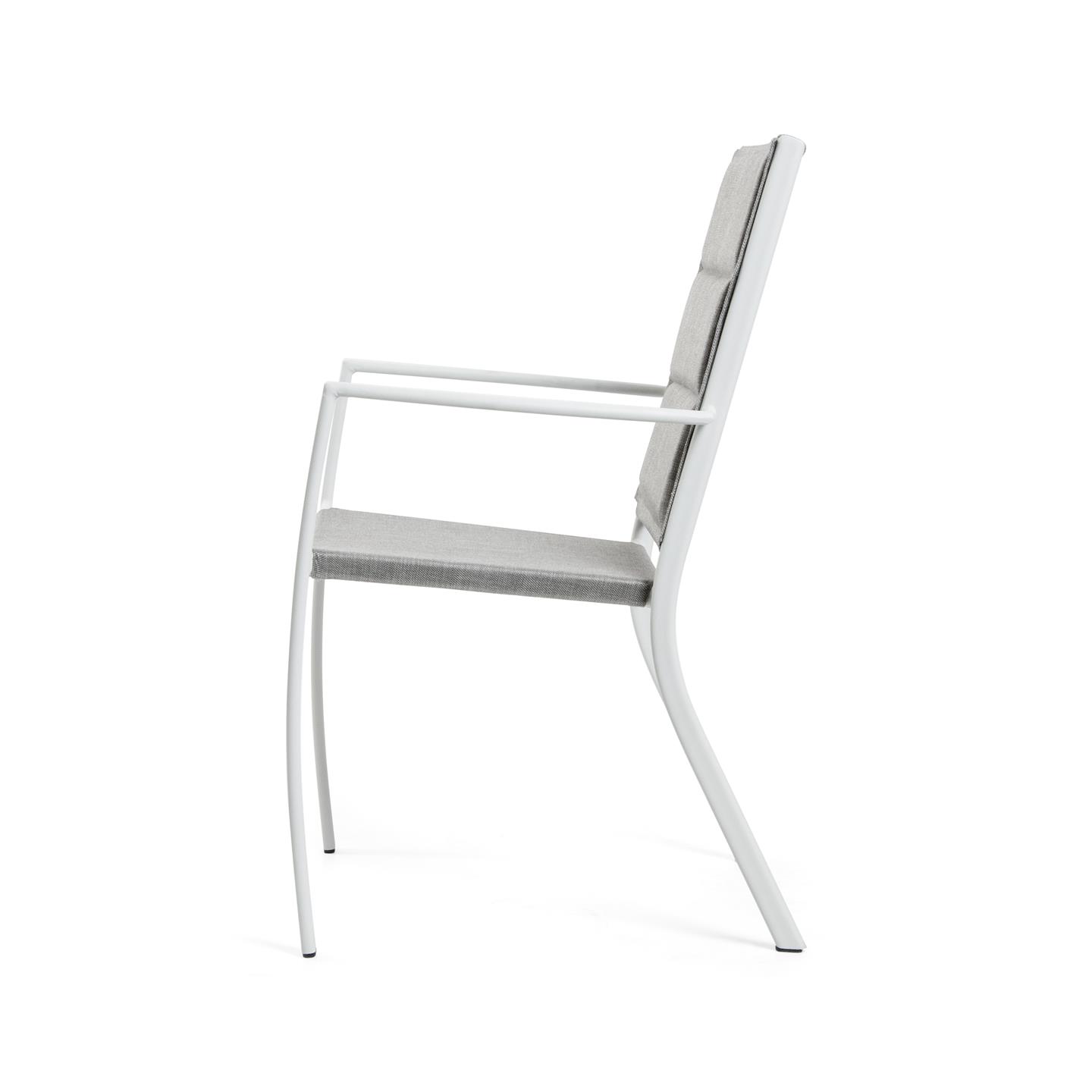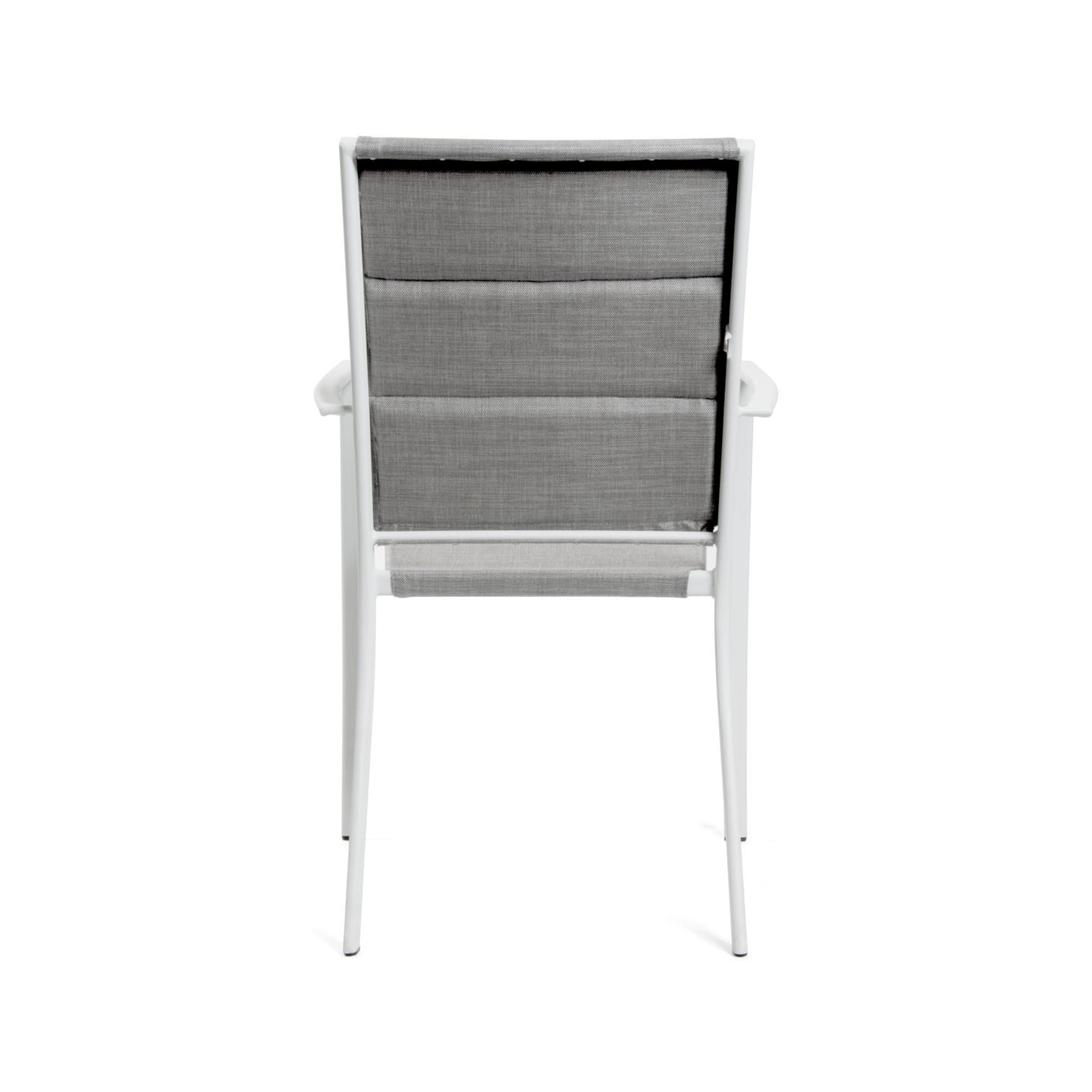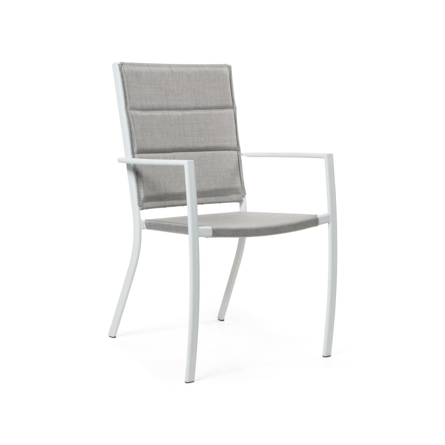Sedia con braccioli, acciaio verniciato a polvere bianco finitura opaca. Tessuto textilene 2X2 grigio, schienale imbottito (spessore mm 18). Demensioni cm 56 X 56 X h 90
