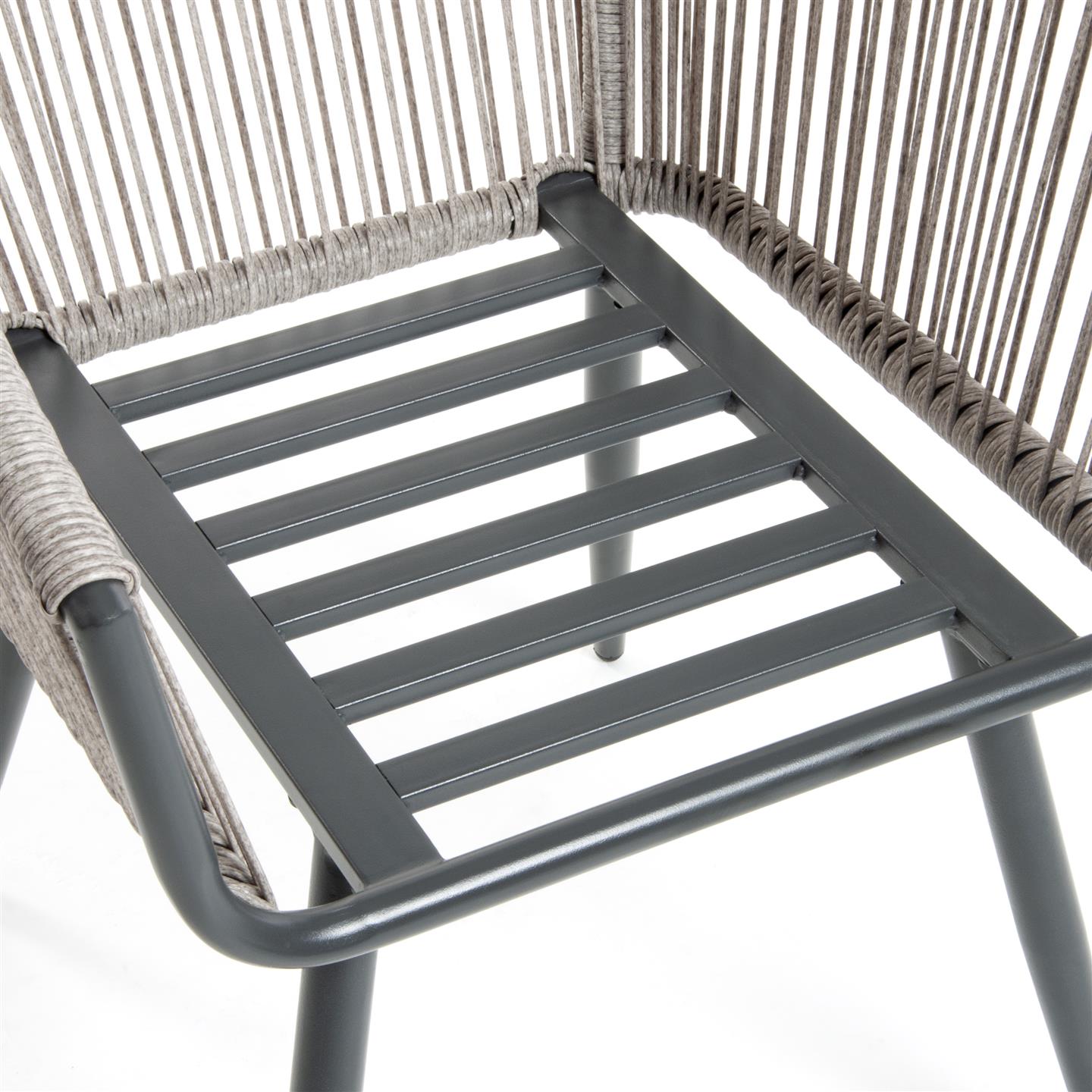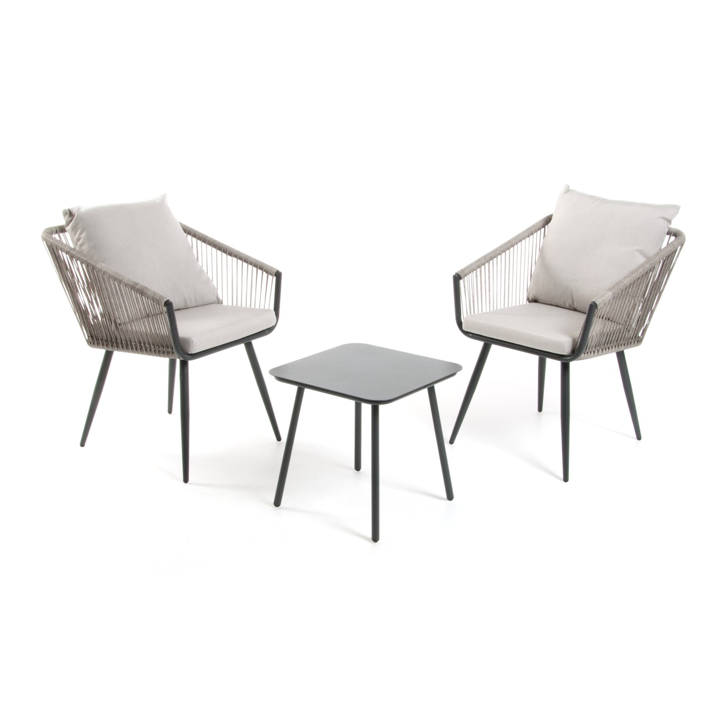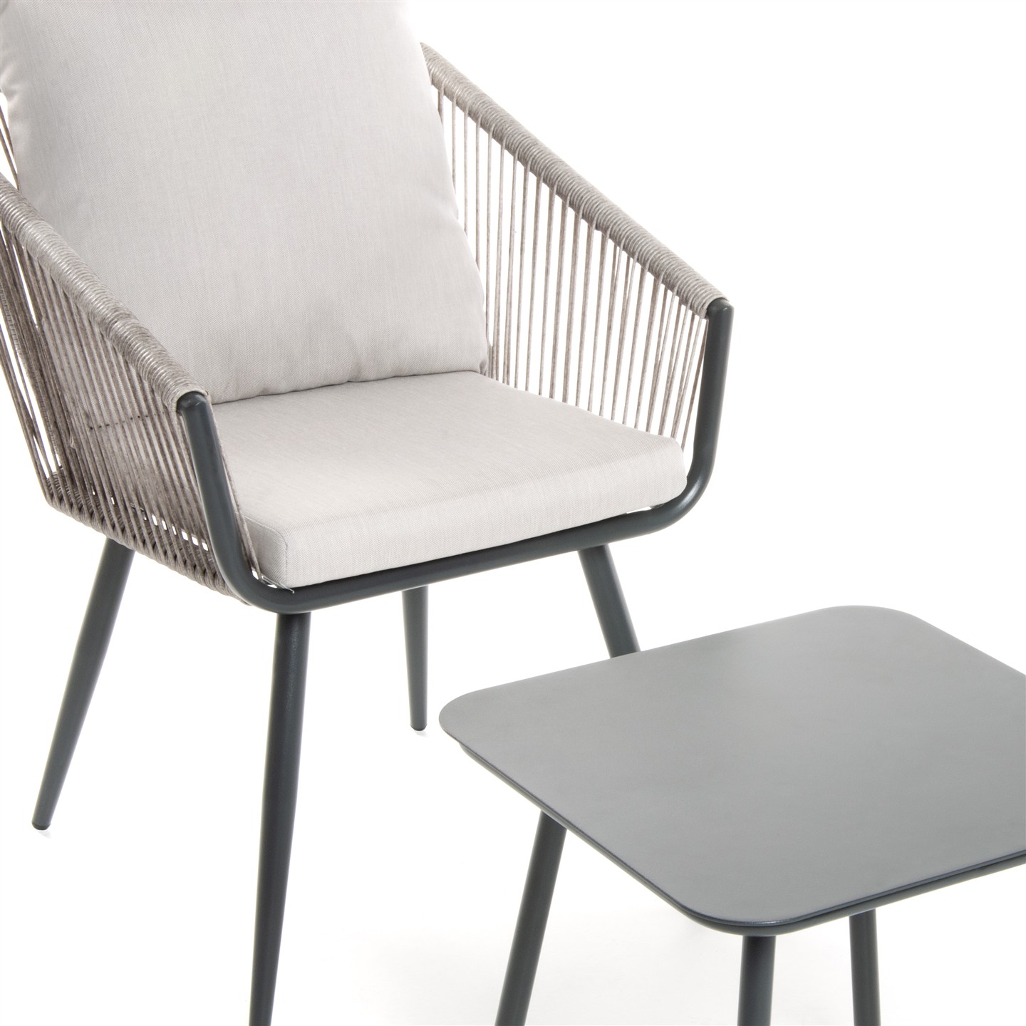 Set 2 poltrone e tavolino, struttura in acciaio verniciato a polvere colore antracite, tessuto poltrone in PE (tessitura corde Ø mm 5, tessuto cuscini in poliestere g 220/m² (imbottitura cm 5), sez. struttura mm 32 / 24 X 0,8 35 X 15 / 25 X 12 X 0,8 Tavolino cm 45 X 45 X h 45 Poltrona cm 65 X 57 X h 78. Prodotto da montare (KD)