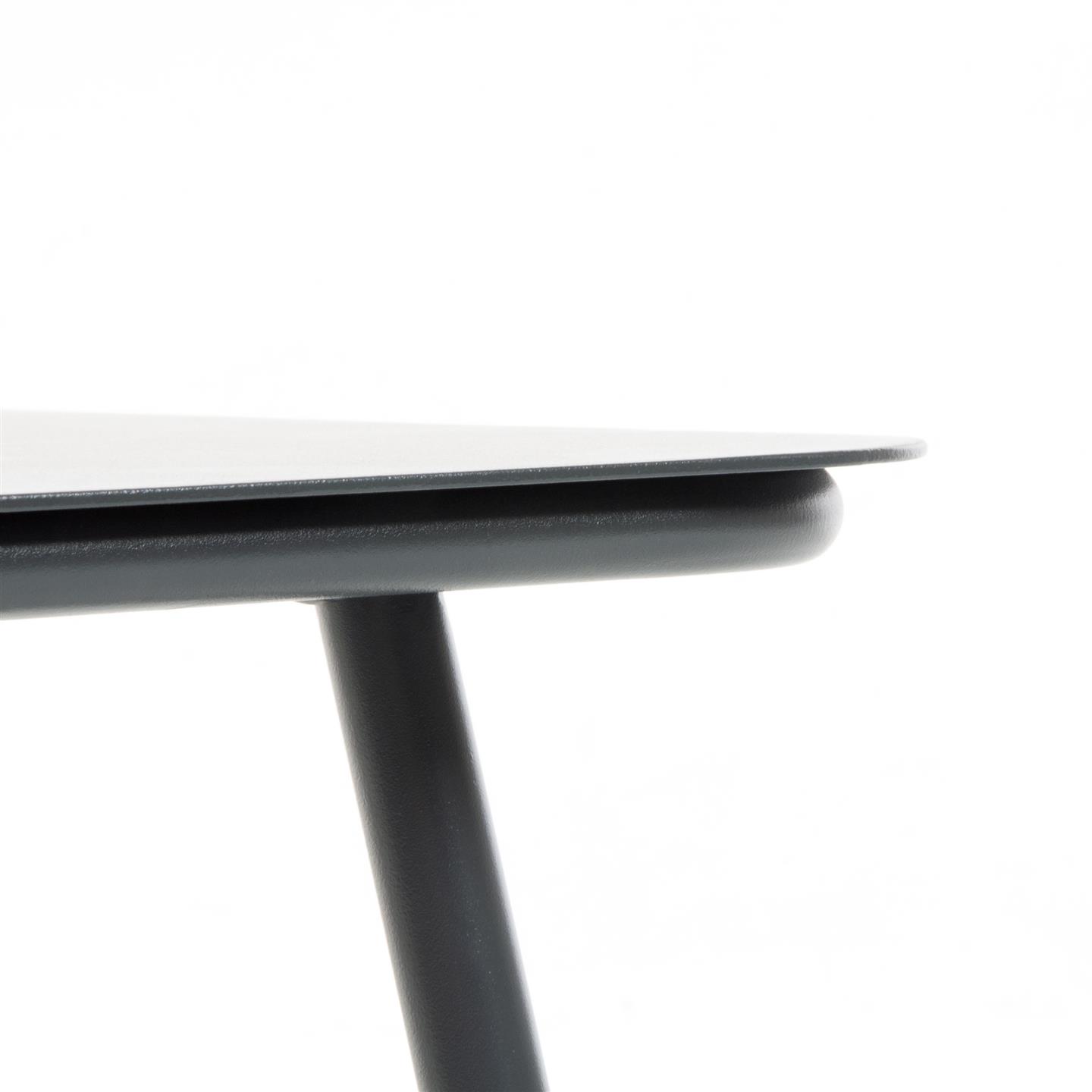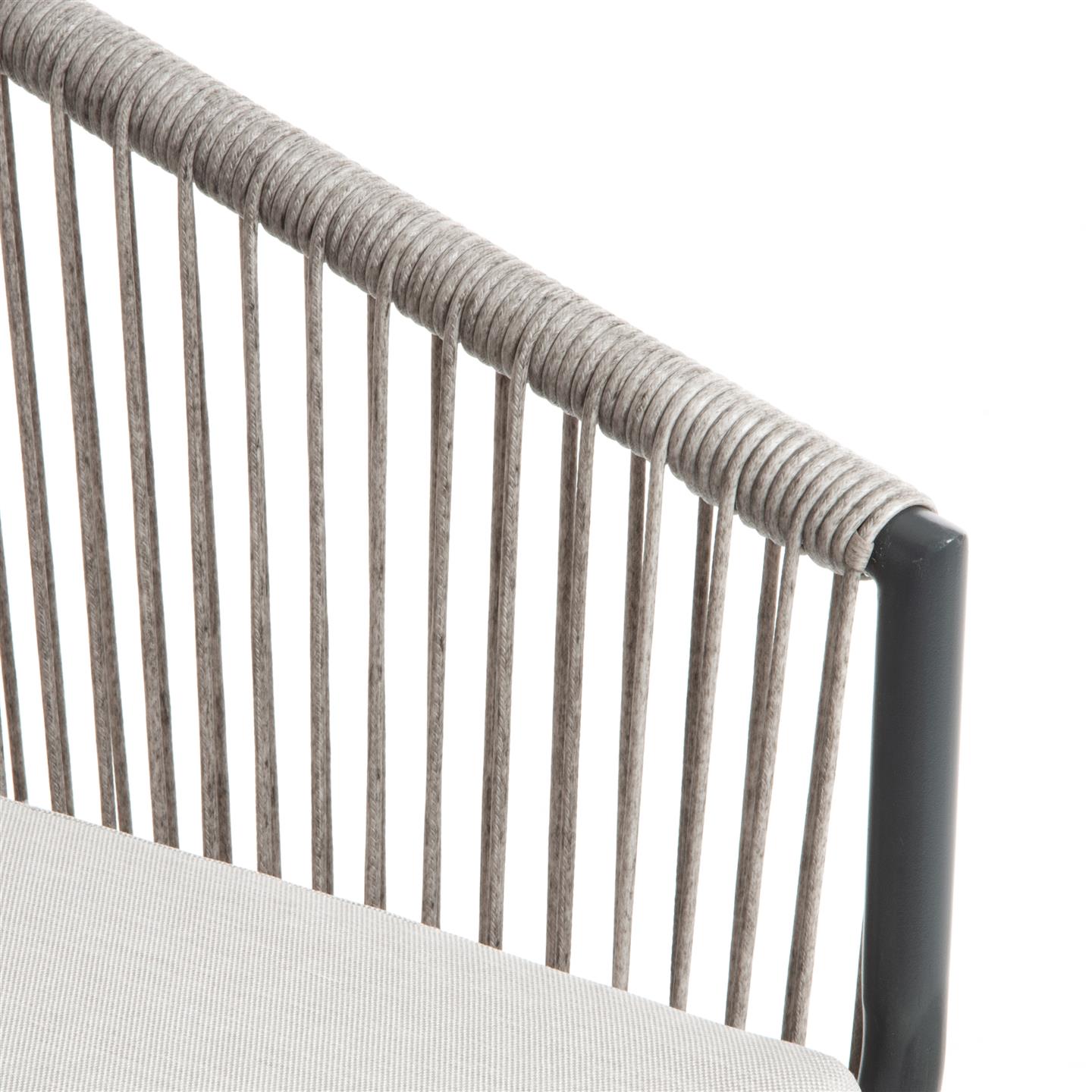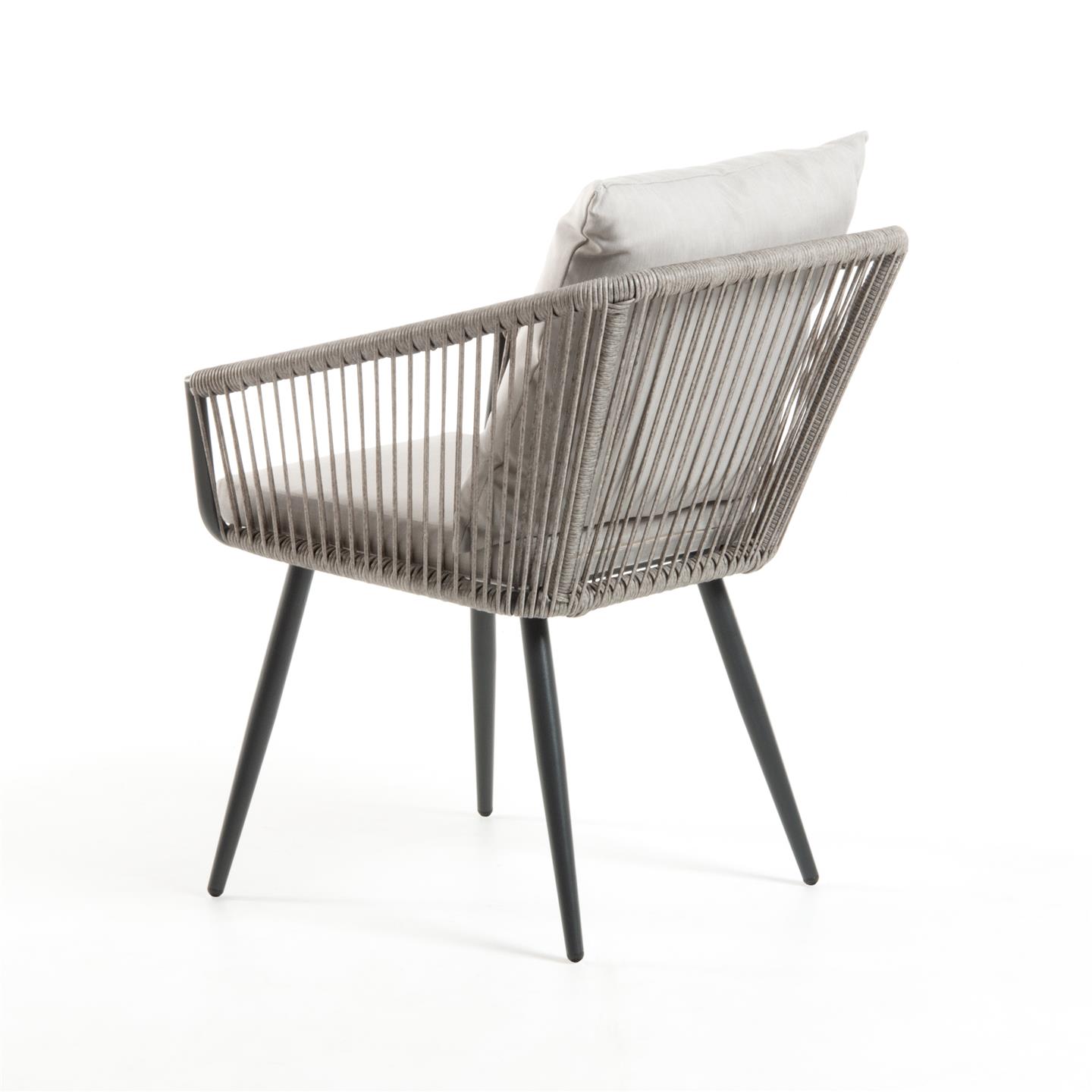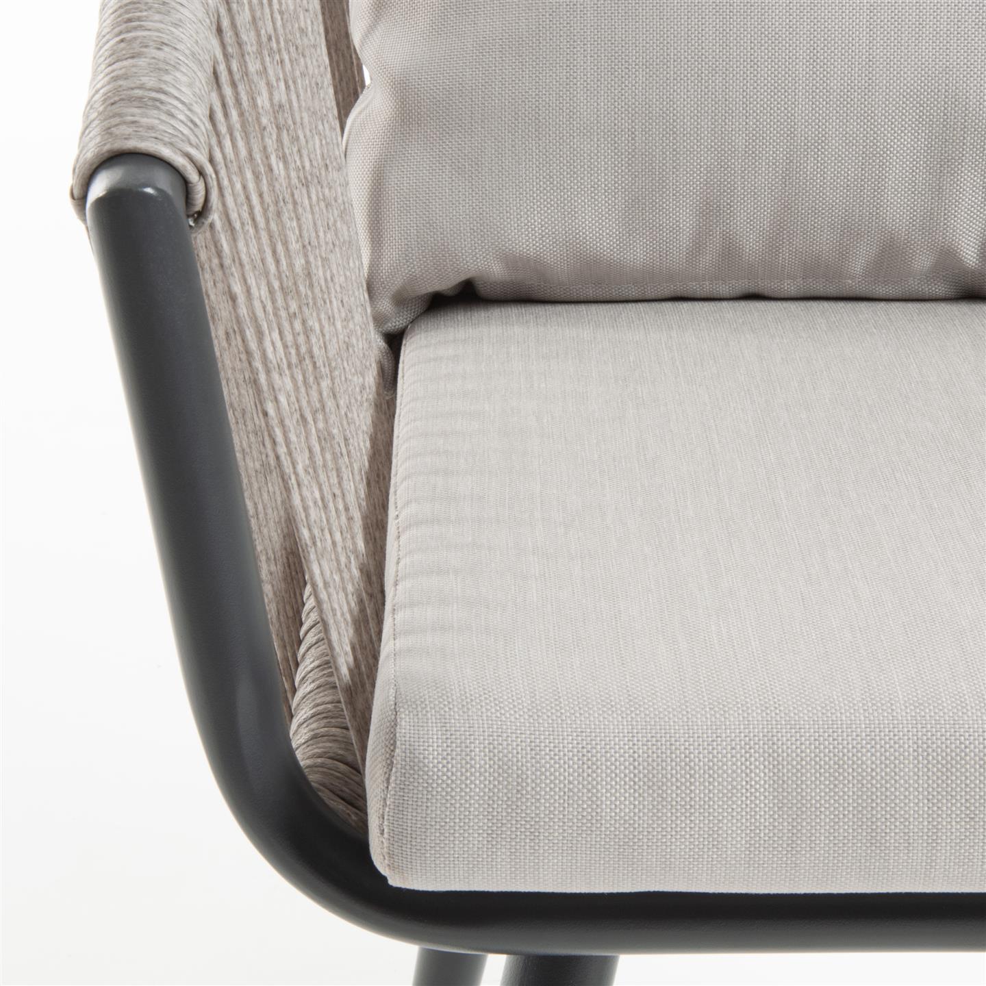 Set 2 poltrone e tavolino, struttura in acciaio verniciato a polvere colore antracite, tessuto poltrone in PE (tessitura corde Ø mm 5, tessuto cuscini in poliestere g 220/m² (imbottitura cm 5), sez. struttura mm 32 / 24 X 0,8 35 X 15 / 25 X 12 X 0,8 Tavolino cm 45 X 45 X h 45 Poltrona cm 65 X 57 X h 78. Prodotto da montare (KD)
