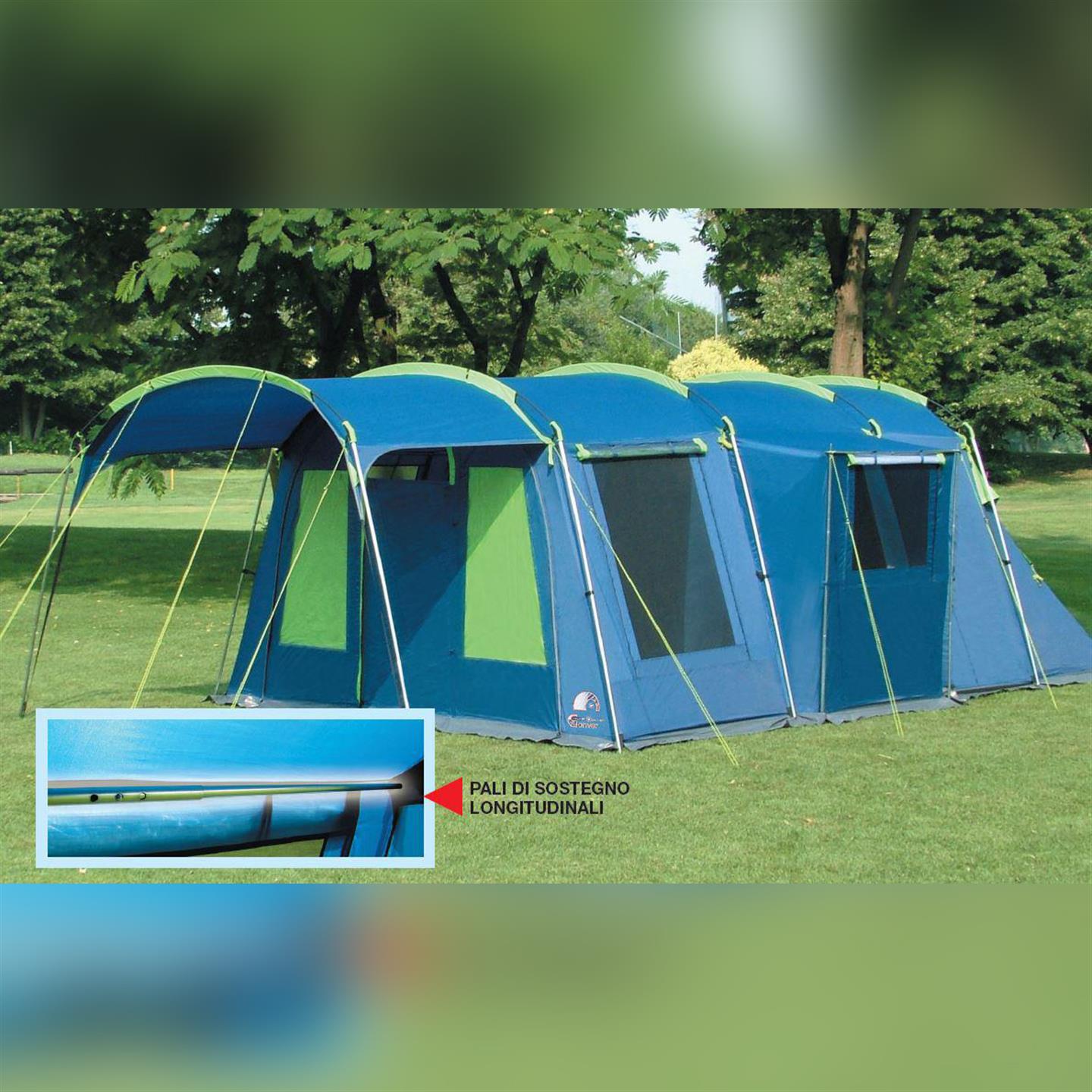Telo in poliestere traspirante, pavimento in polietilene g 130 m², porte nylon/zanzariera, paleria composta da da archi in fibra di vetro e acciaio tropicalizzato.